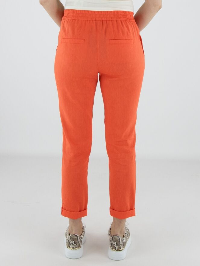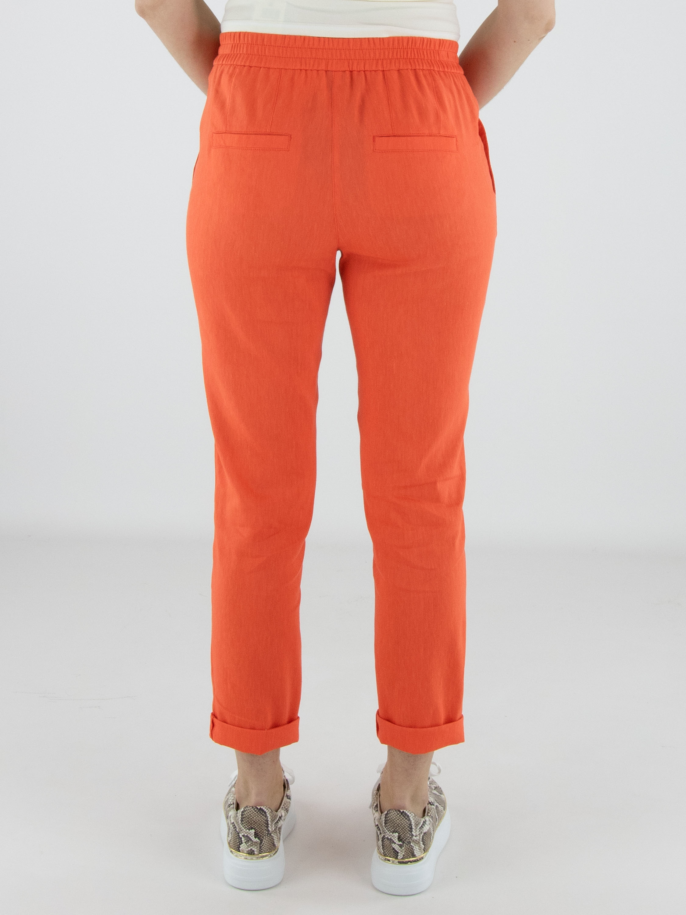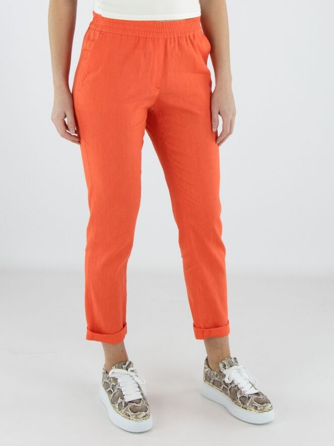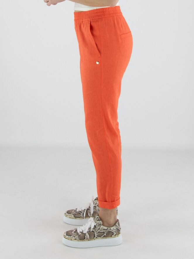 Hose von Marc Cain in einem frischen Korallrot. Ein breiter, fein gerippter elastischer Bund sorgt für eine bequeme und moderne Passform. Mit Eingrifftaschen und einem kurzen Umschlag am Saum versehen, erhält das Modell eine zeitgemäße Note. Diese Hose kann bei 30 Grad gewaschen werden.