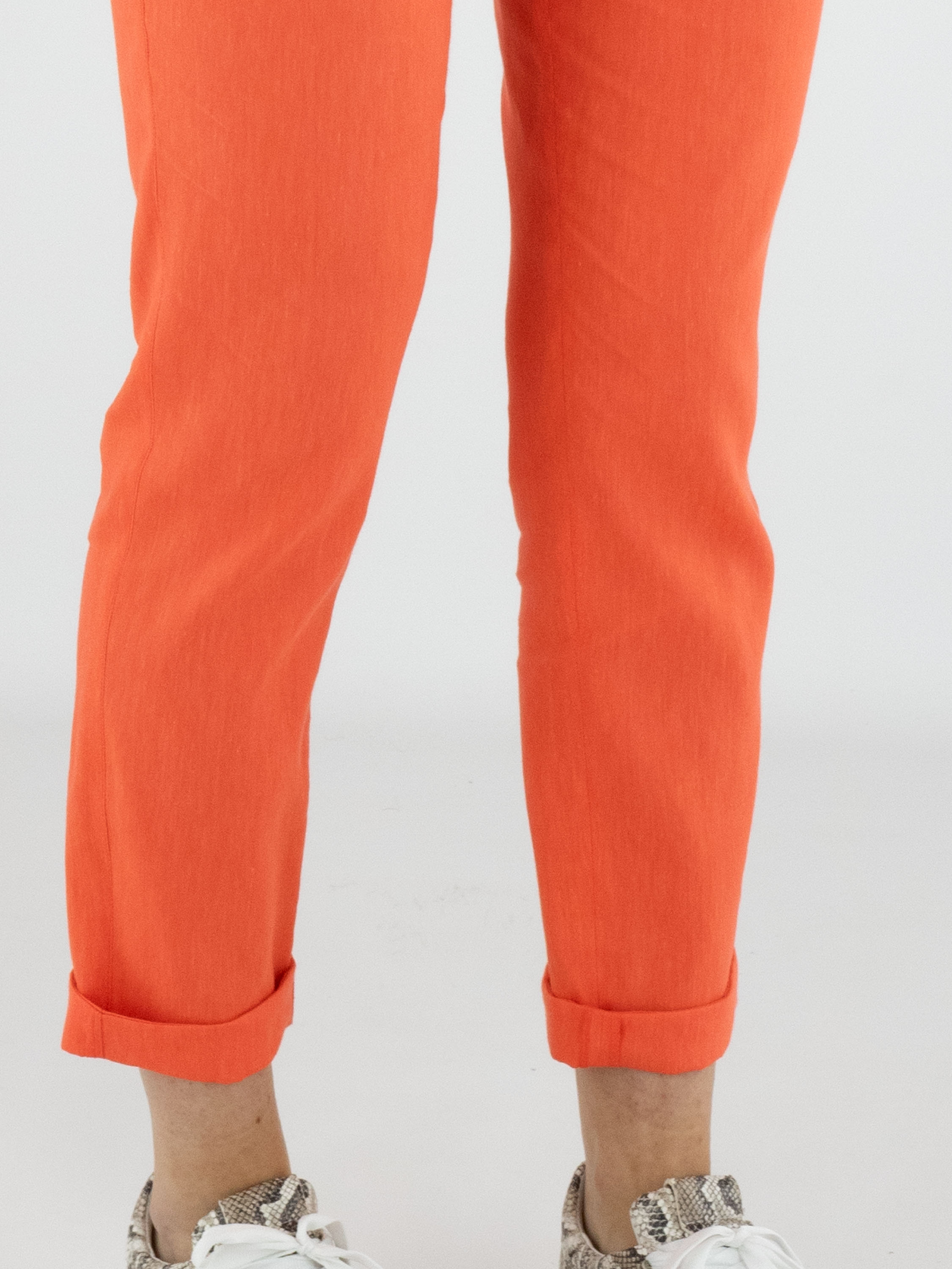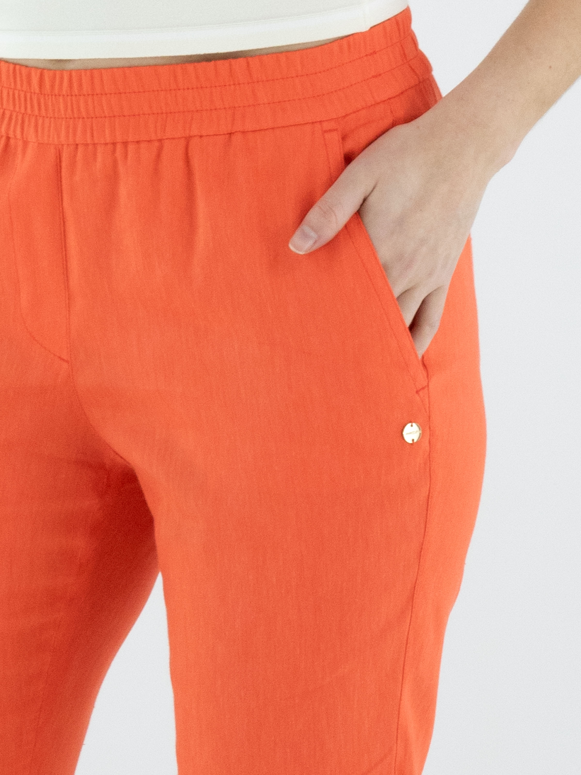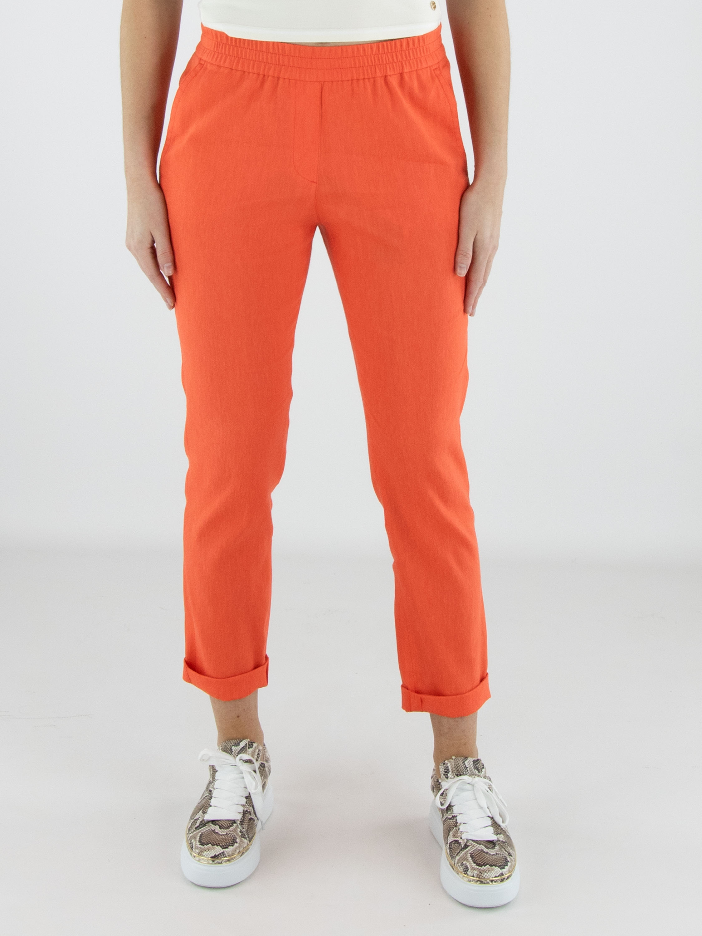 Hose von Marc Cain in einem frischen Korallrot. Ein breiter, fein gerippter elastischer Bund sorgt für eine bequeme und moderne Passform. Mit Eingrifftaschen und einem kurzen Umschlag am Saum versehen, erhält das Modell eine zeitgemäße Note. Diese Hose kann bei 30 Grad gewaschen werden.