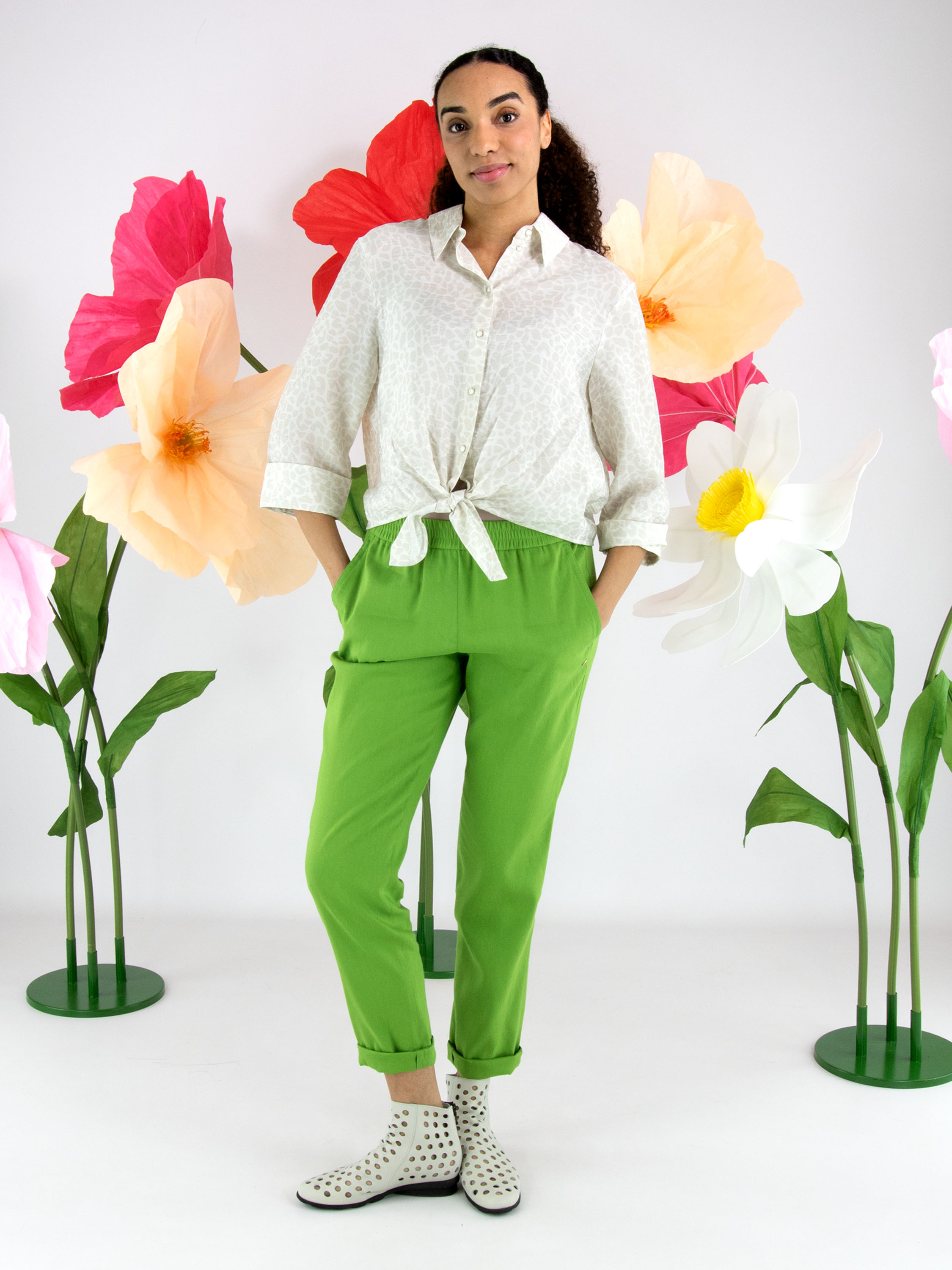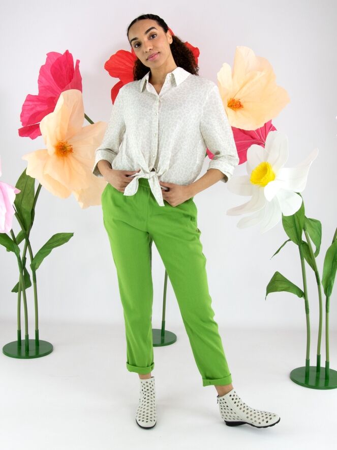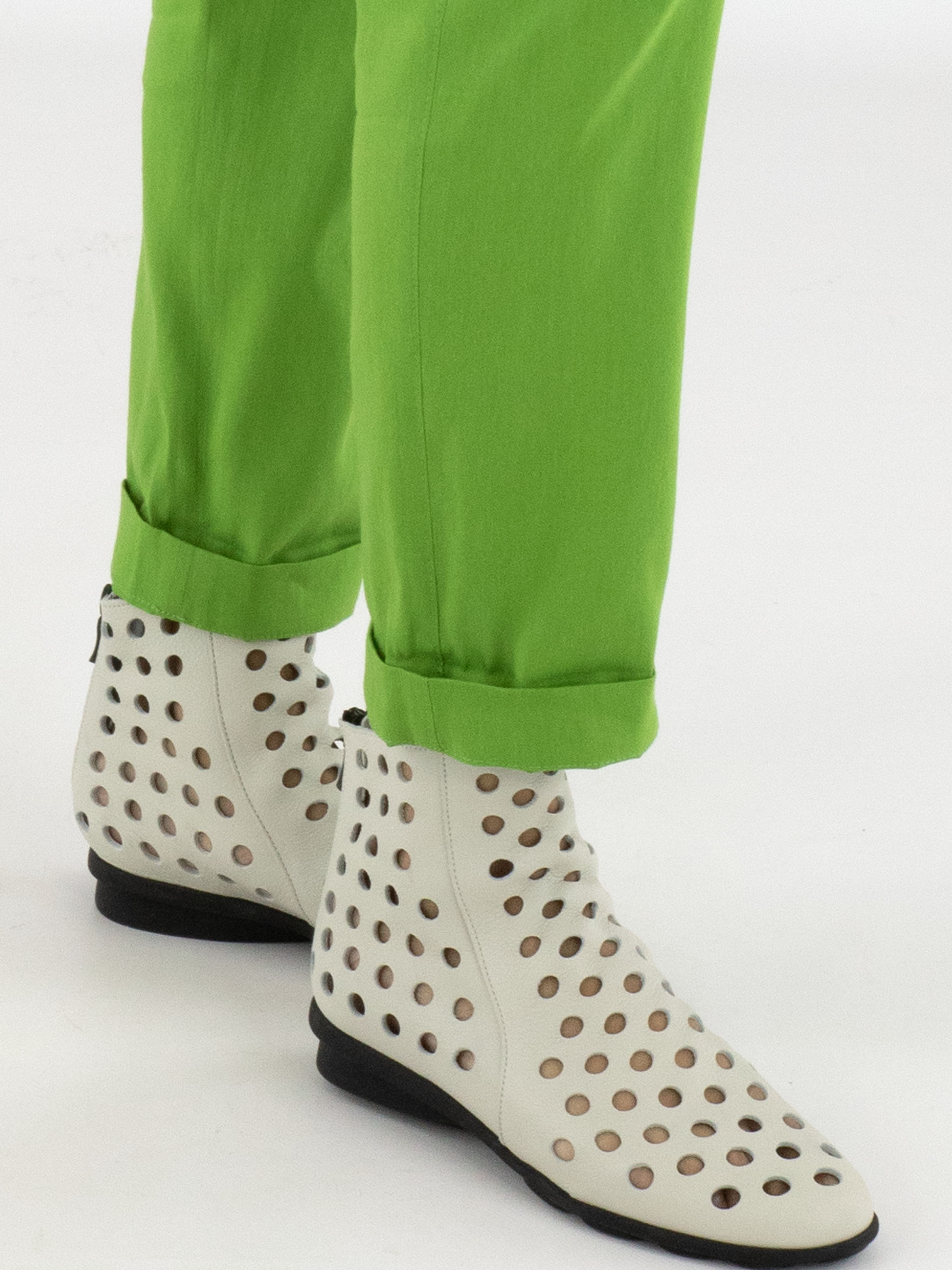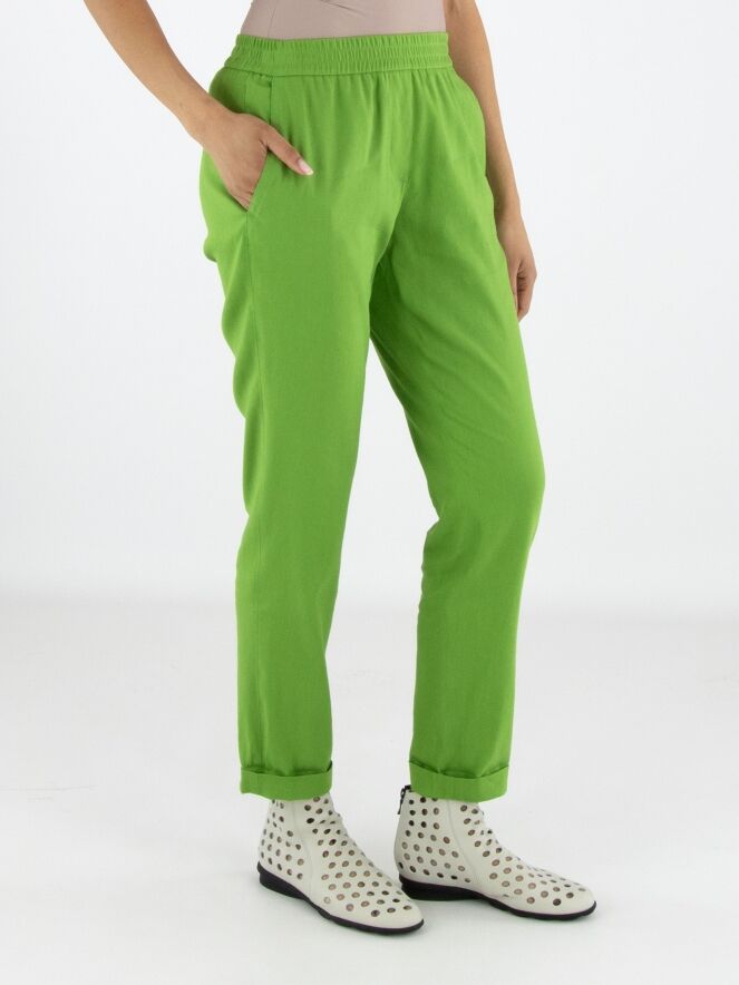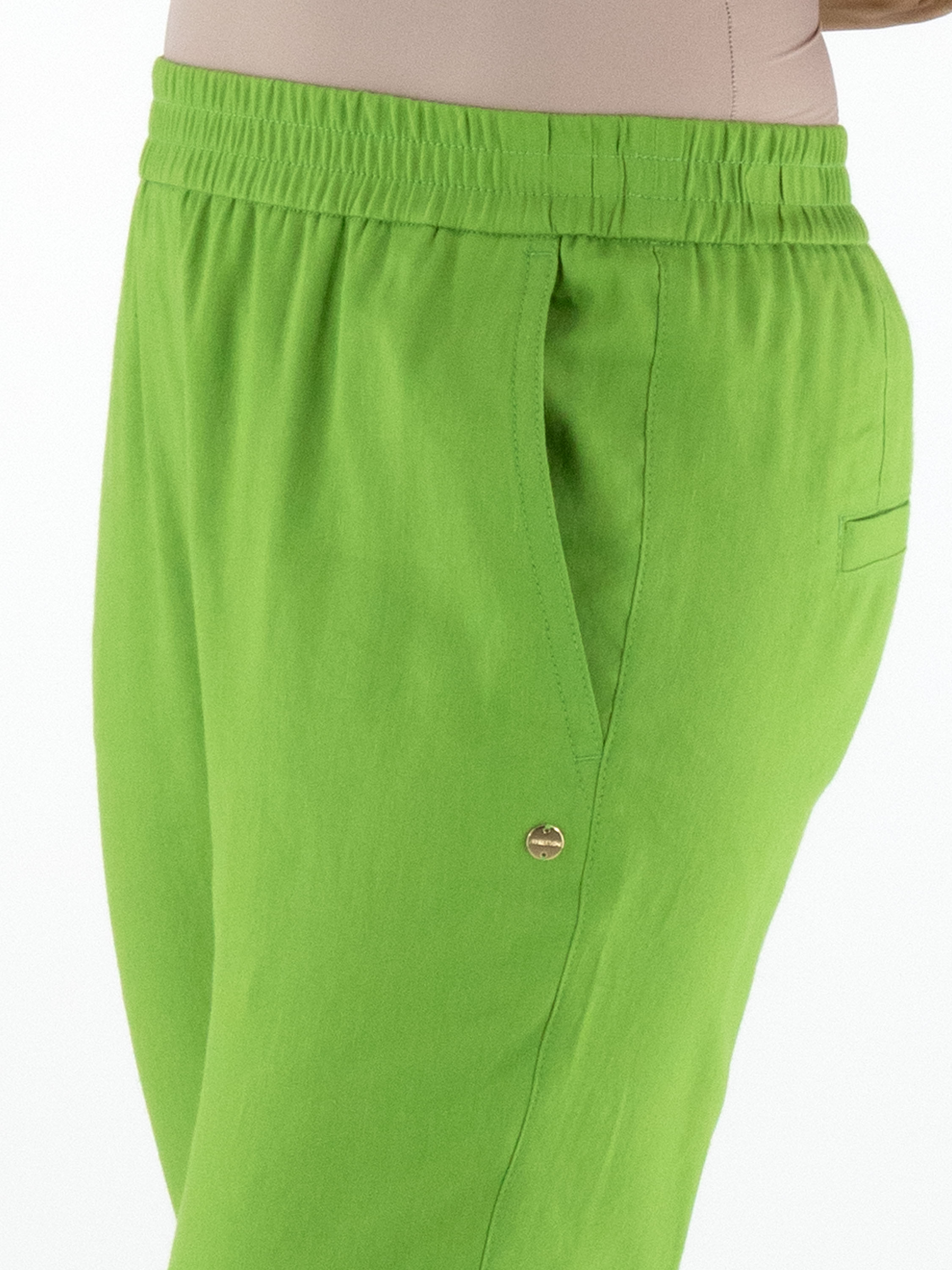 Hose von Marc Cain in einem leuchtenden Grünton. Der Bund ist mit einem breiten, fein gerippten Elastikband versehen und sorgt für eine bequeme, moderne Passform. Mit Eingrifftaschen und einem kurzen Umschlag am Saum setzt das Modell einen sportlich-eleganten Akzent. Diese Hose kann bei 30 Grad gewaschen werden.