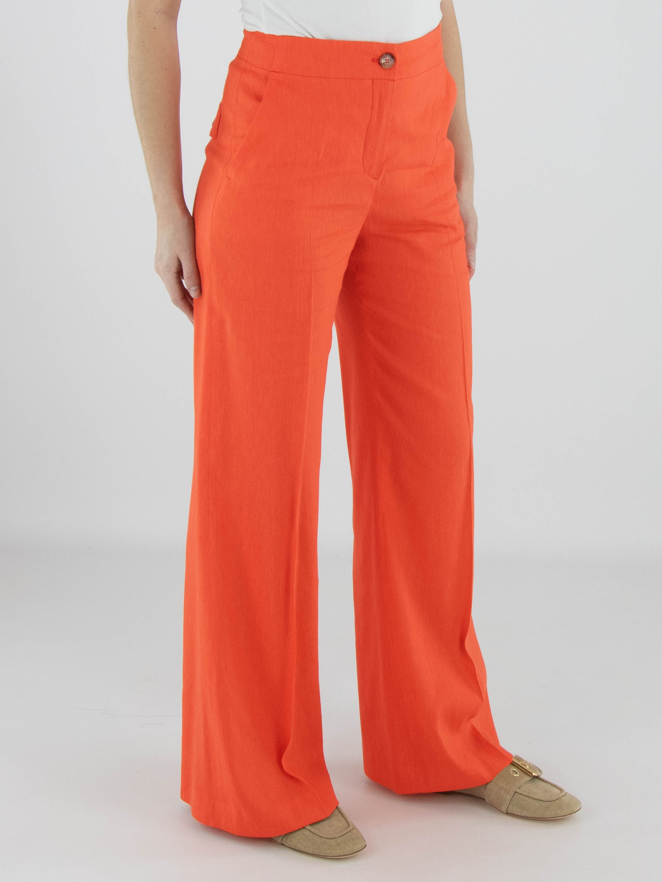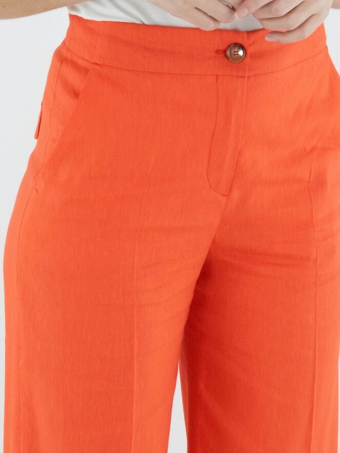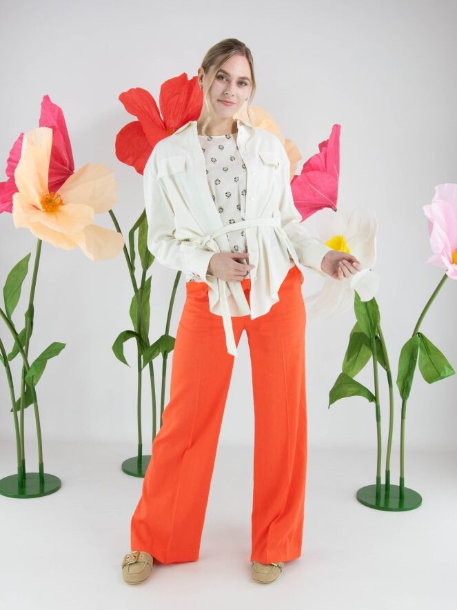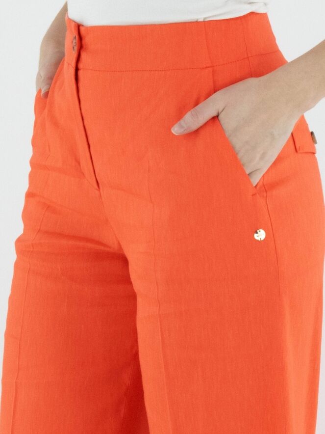 Hose von Marc Cain in einem frischen Korallrot. Mit Eingrifftaschen und einer eingepressten Bügelfalte in der Beinmitte überzeugt sie durch eine elegante und gepflegte Ausstrahlung. Diese Hose kann bei 30 Grad gewaschen werden.