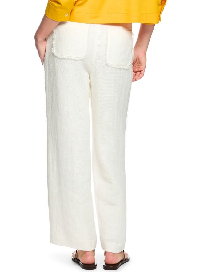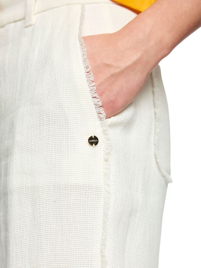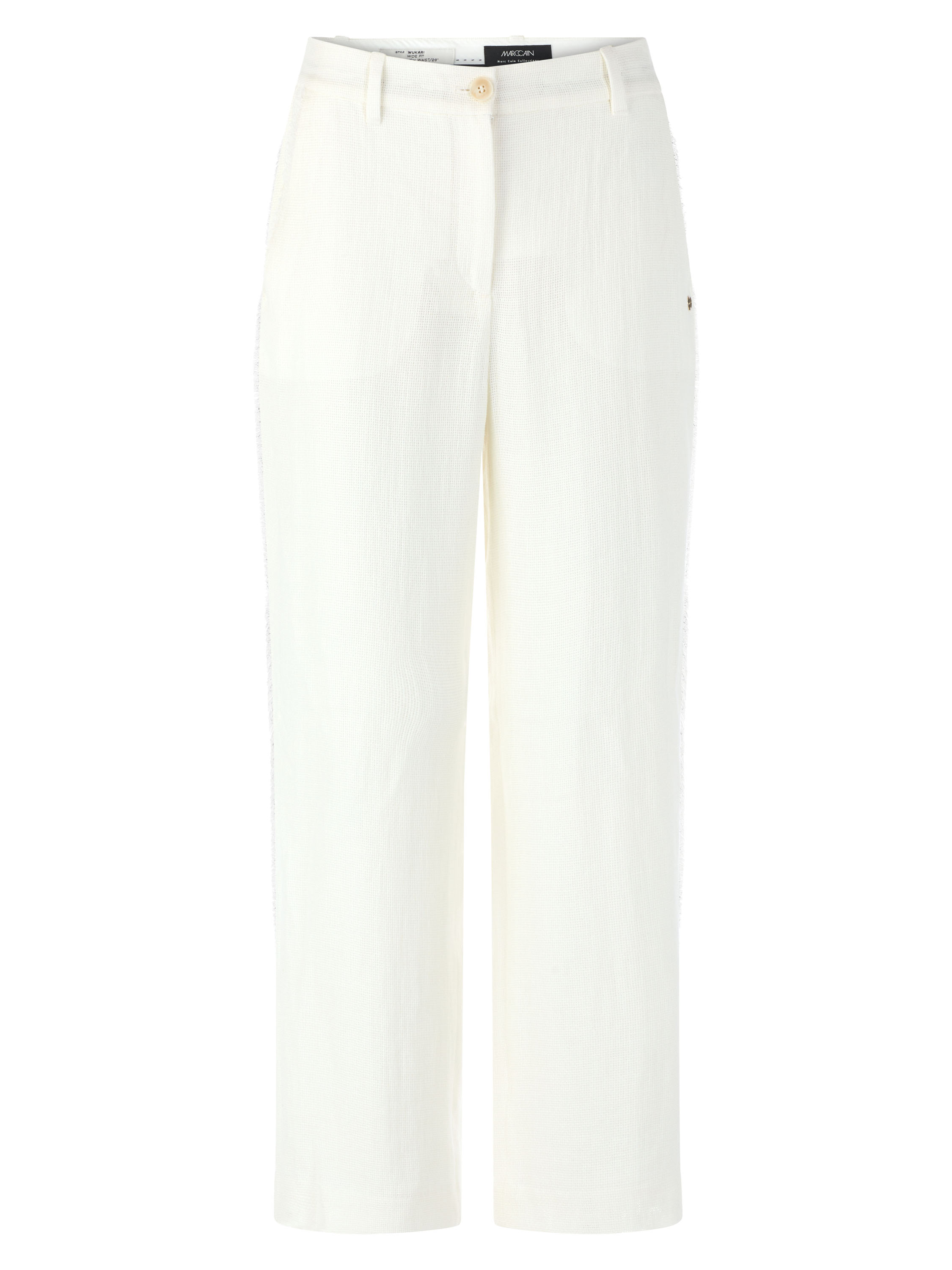 Eine etwas grob gewebte Hose von Marc Cain in einem luxuriösen Cremeweiß. Entlang der Seiten der Beine verläuft eine dekorative Borte mit feinen, kurzen Fransen, die dem Design eine besondere Struktur verleiht. Die Hose verfügt über seitliche Eingrifftaschen und darf nicht gewaschen werden.