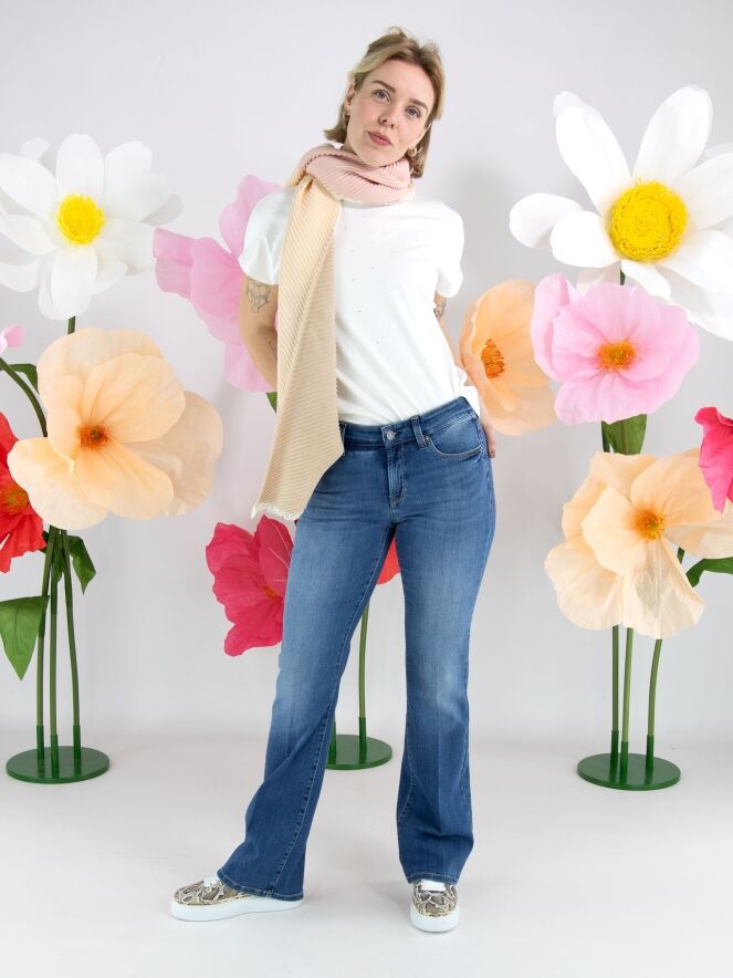 Ein luxuriöser, plissierter Schal von Marc Cain mit Farbpartien in Nude, Lachsrosa und Cremeweiß. Die Enden des Schals sind fein ausgefranst. Dieser Schal kann per Hand gewaschen werden.