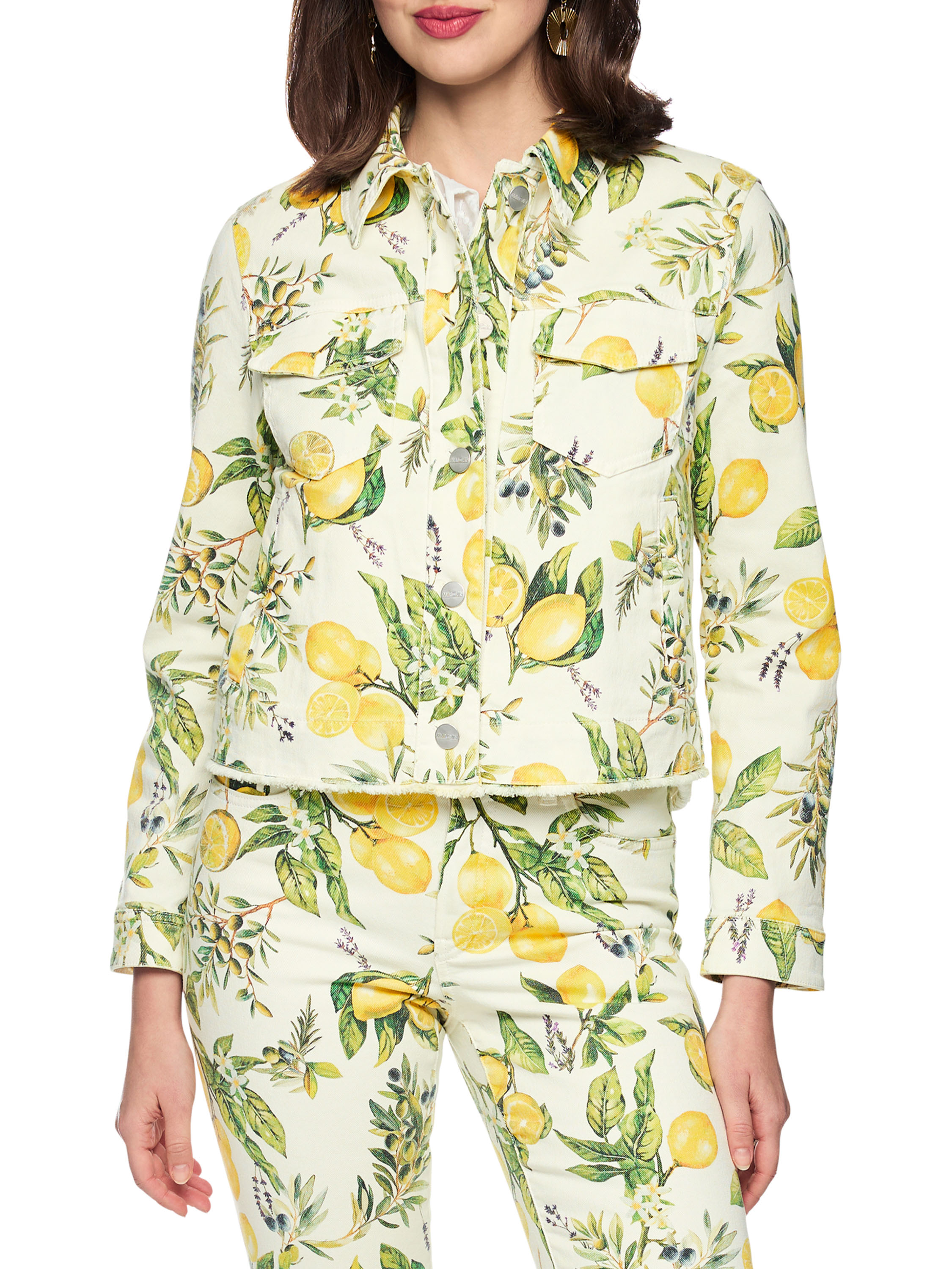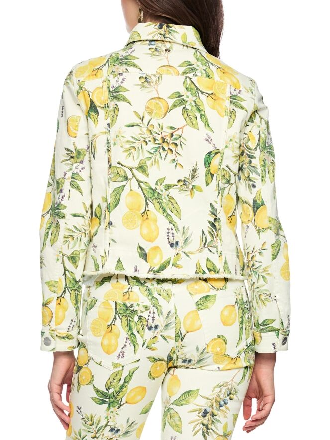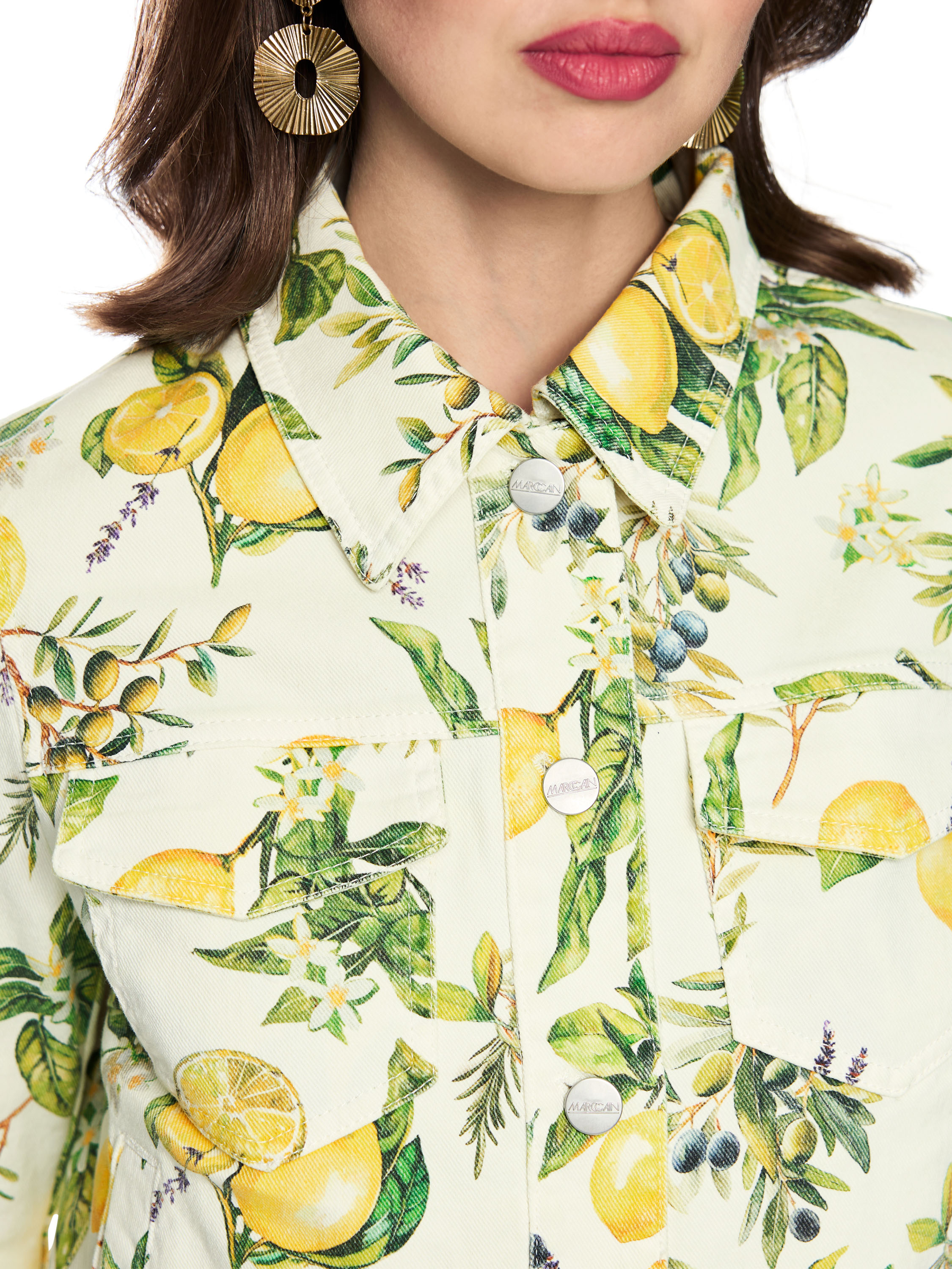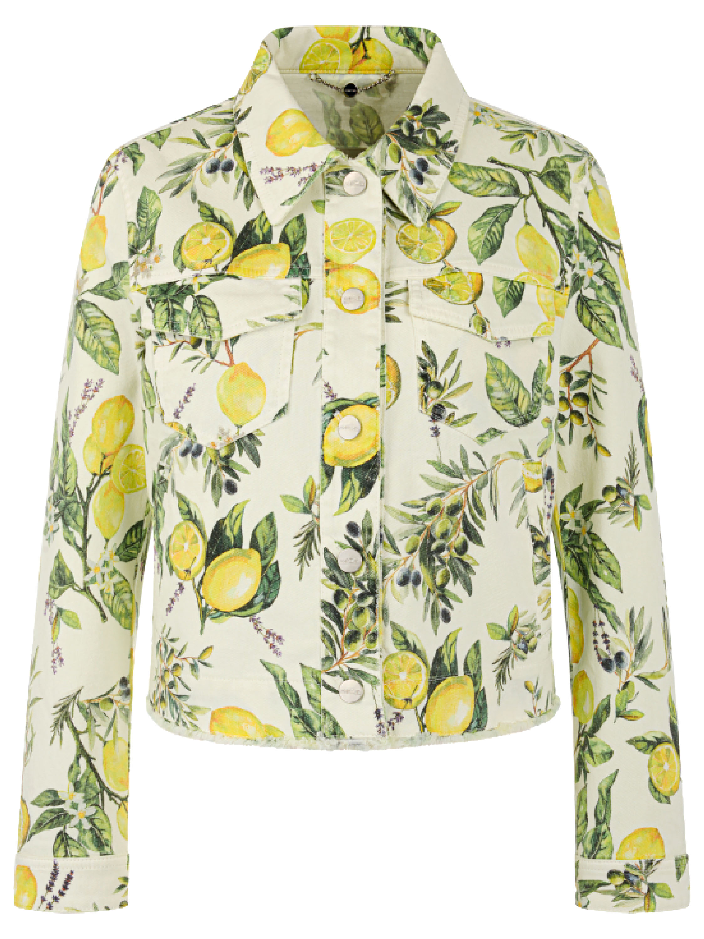 Ein kurzer Jeansblazer von Marc Cain mit einem Print aus Zitronen und Oliven an Zweigen mit Blättern auf einem cremeweißen Hintergrund. Der Blazer wird mit Knöpfen geschlossen und ist leicht tailliert geschnitten. Auf Taillenhöhe befinden sich seitliche Eingrifftaschen. Der Saum ist fein ausgefranst und verleiht dem Design eine lässige Note. Dieses Modell kann bei 30 Grad gewaschen werden.