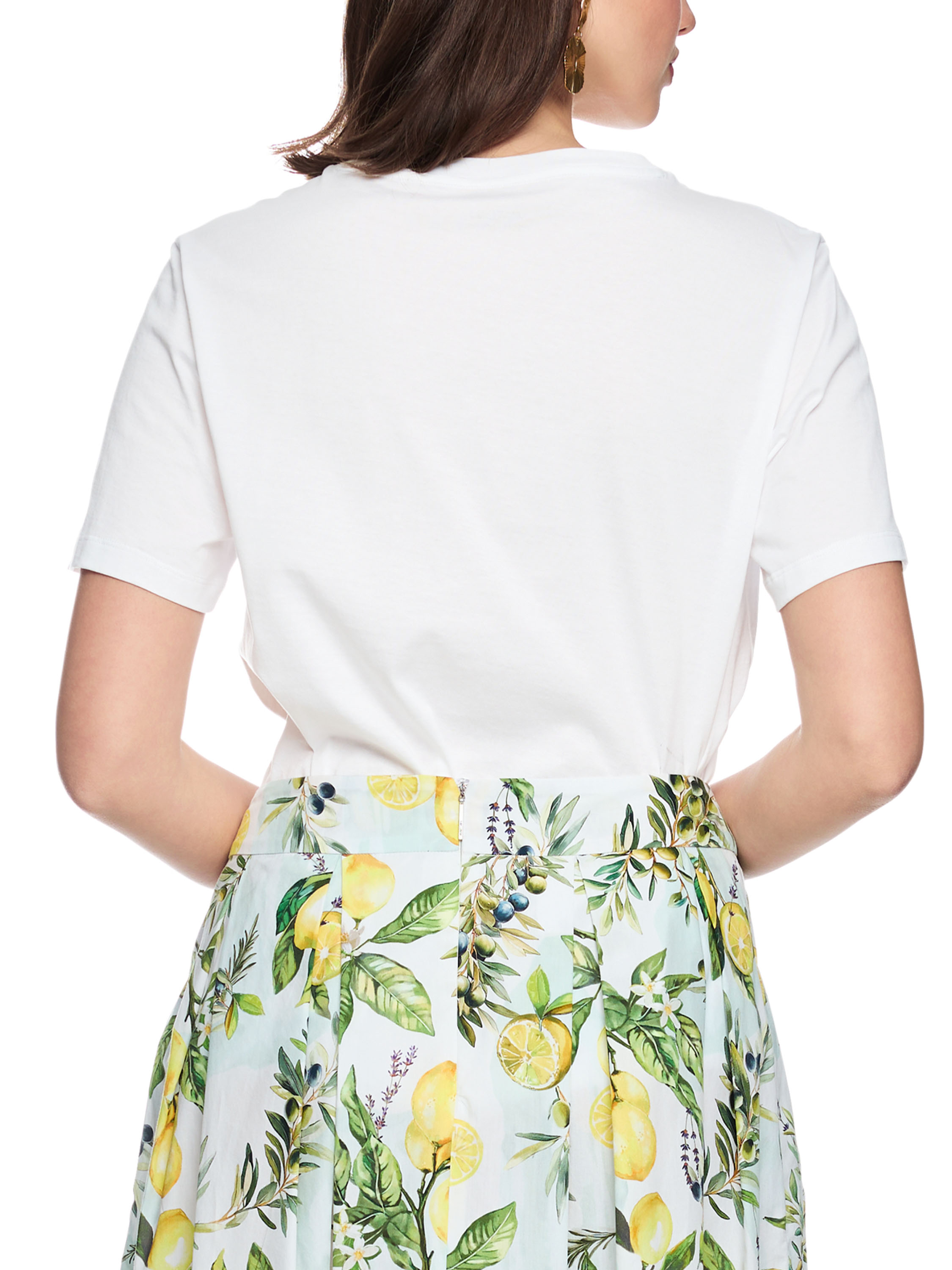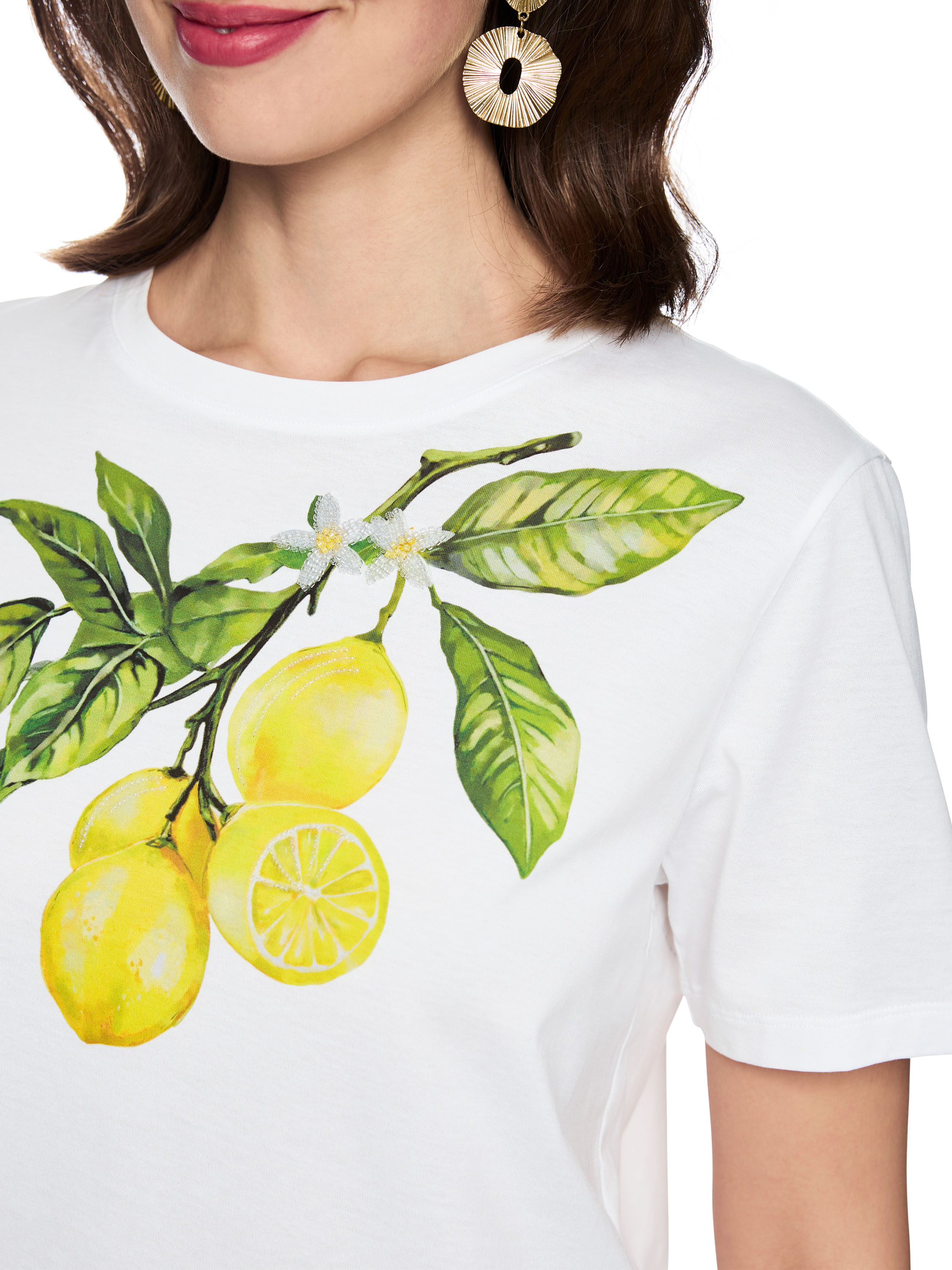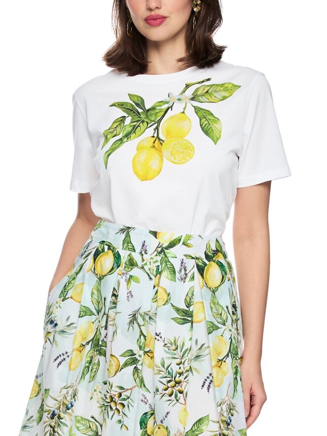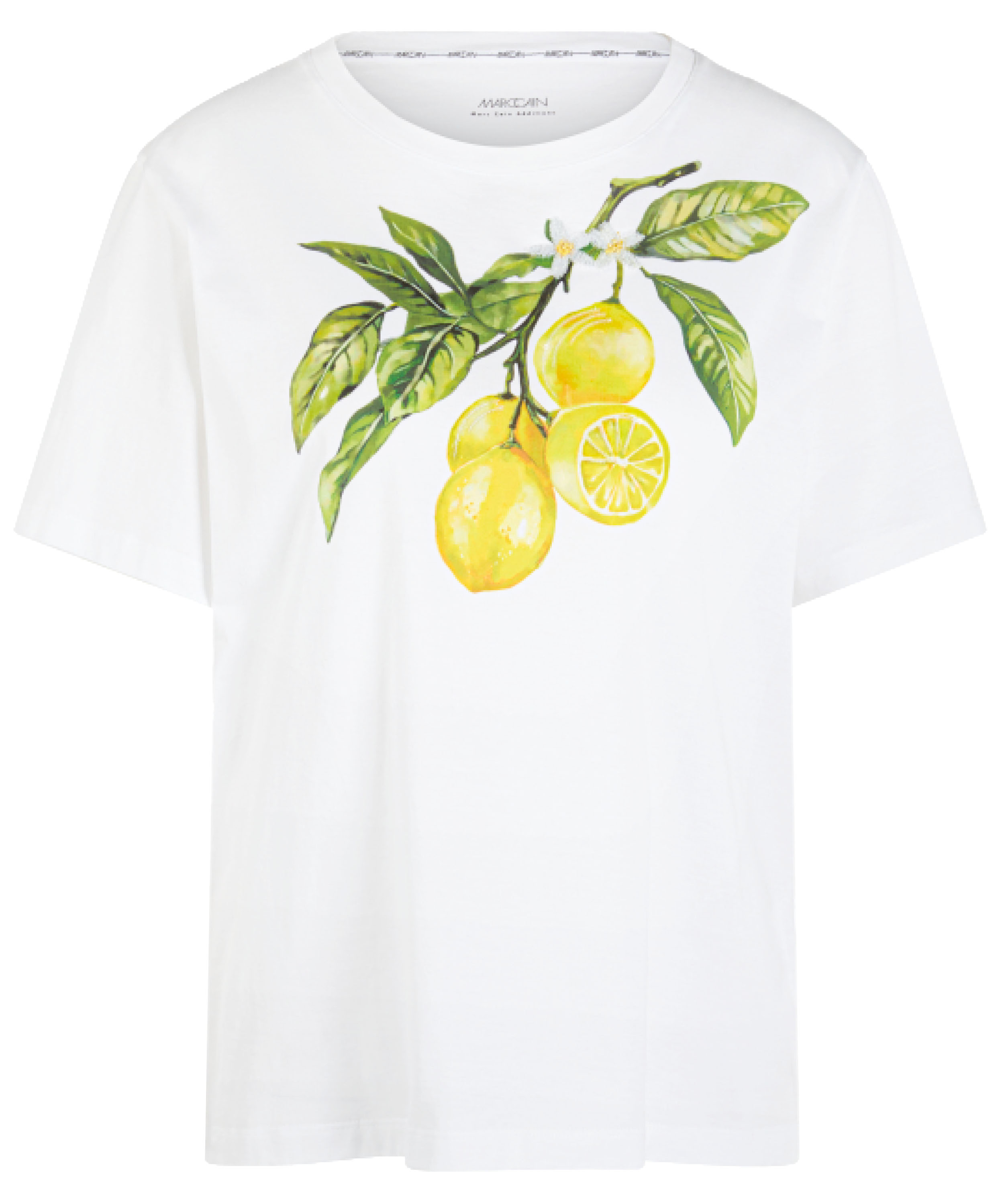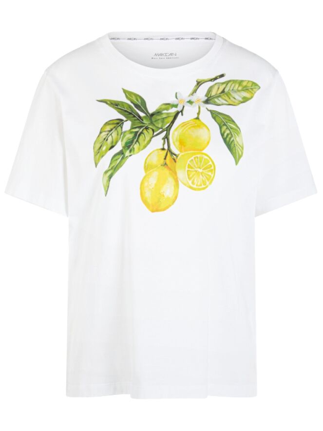 Ein Shirt von Marc Cain in Weiß mit einem Frontprint von Zitronen an einem Zweig mit Blättern. Das Modell hat kurze Ärmel und einen Rundhalsausschnitt. Dieses Shirt kann bei 30 Grad gewaschen werden.