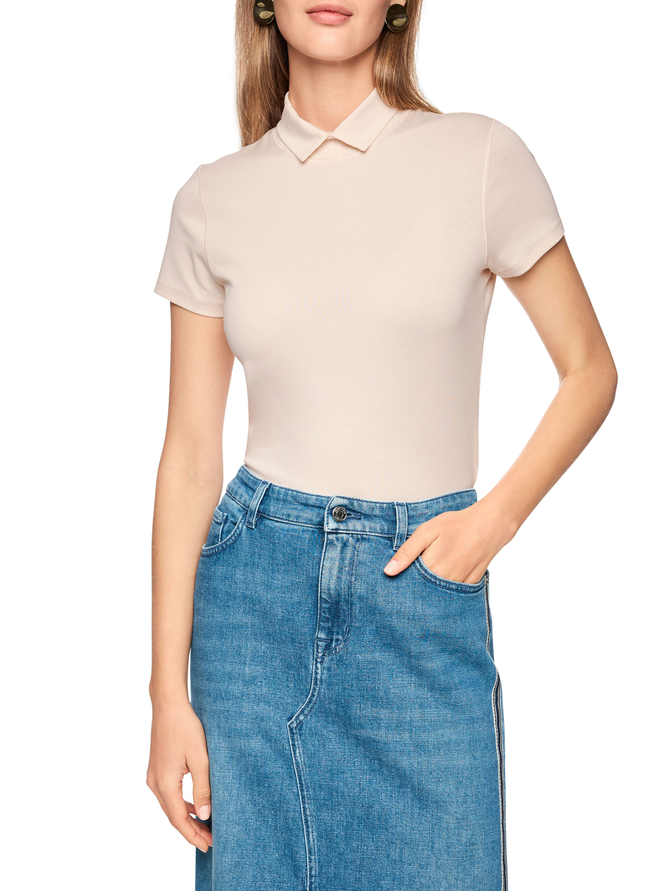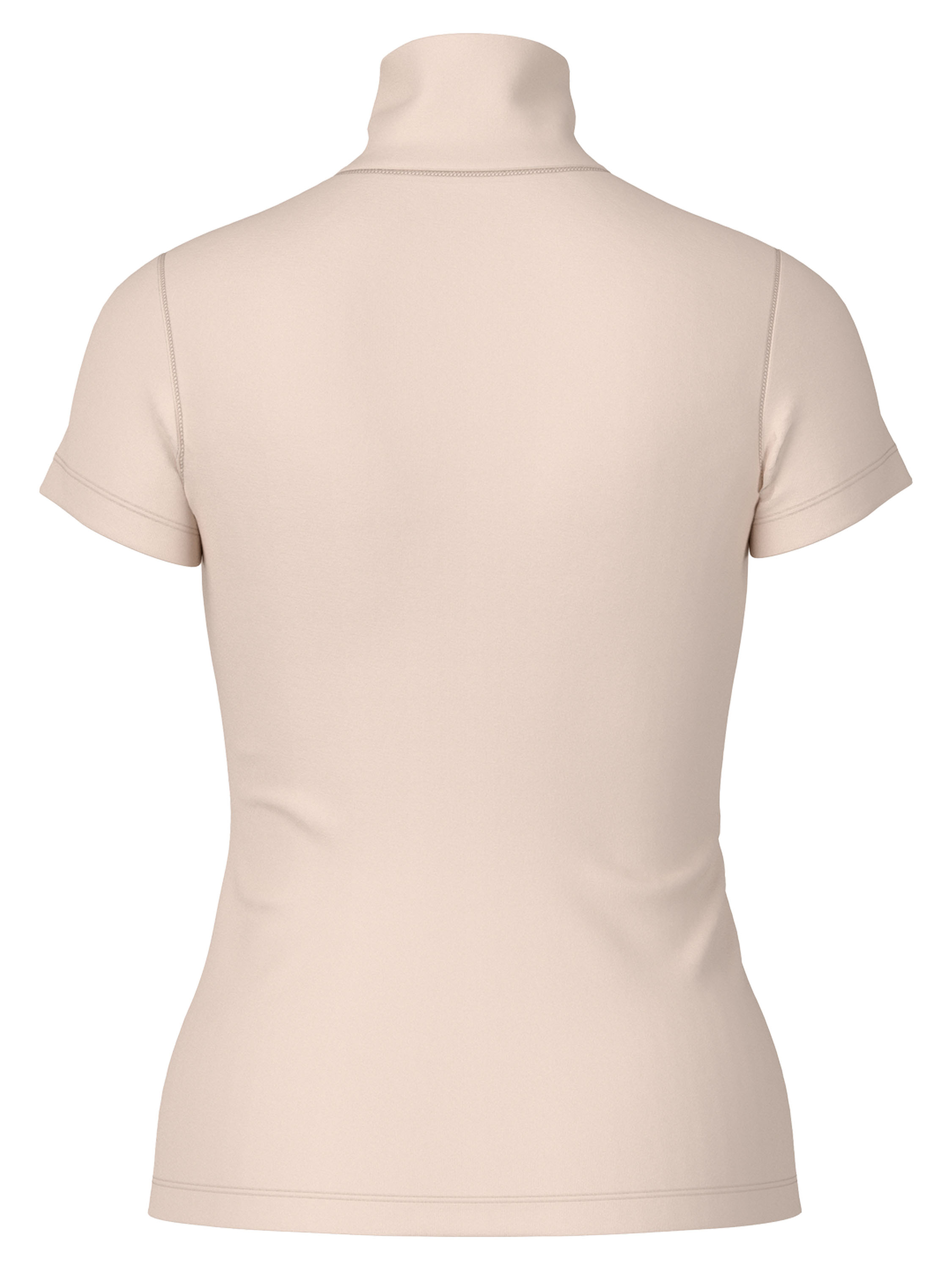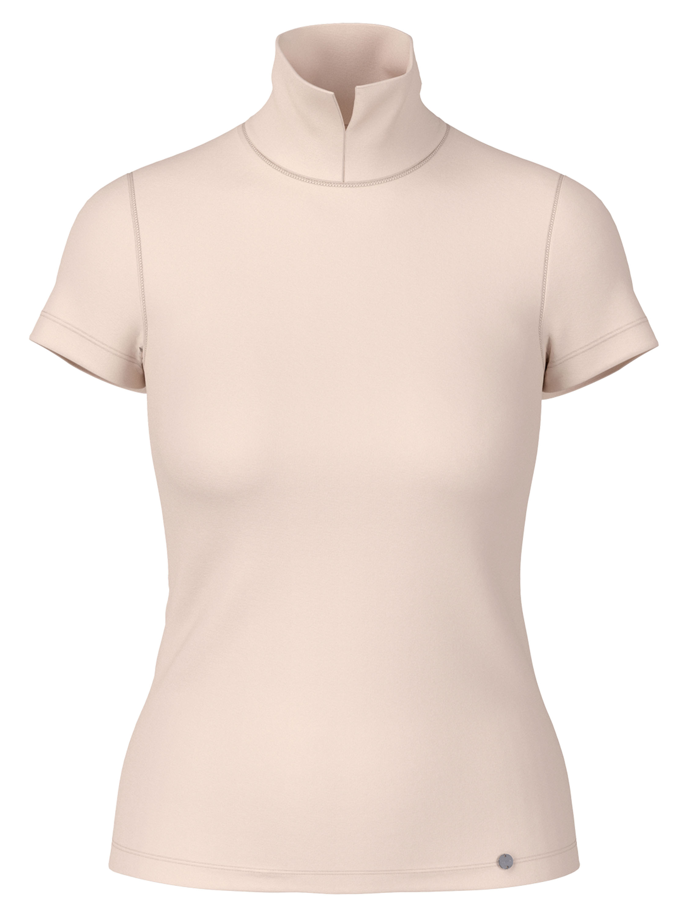 Shirt von Marc Cain in der Farbe Beige. Mit kurzen Ärmeln und einem Turtlekragen mit kleinem Schlitz in der vorderen Mitte verleiht es einen eleganten, femininen Look. Dieses exklusive Designer-Top kann bei 30 Grad gewaschen werden.