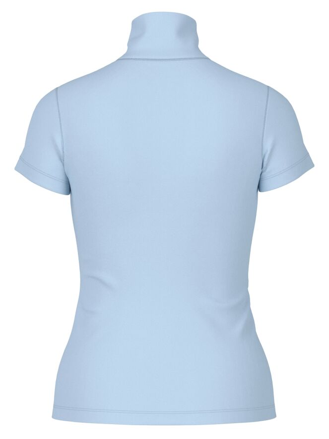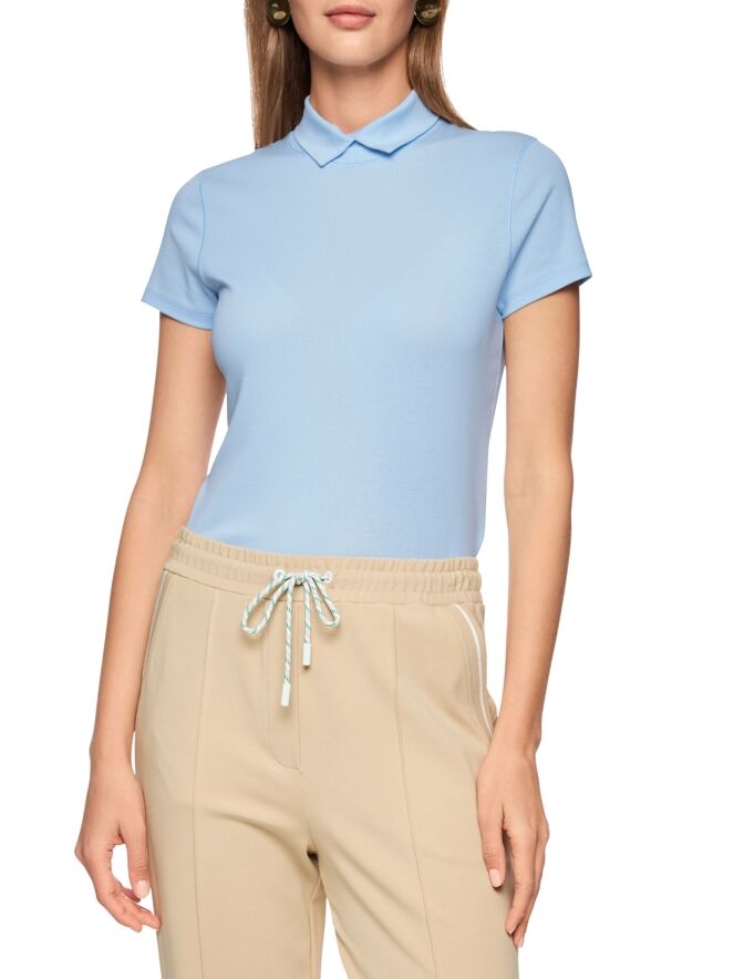 Shirt von Marc Cain in einem zarten Pastellblau. Mit kurzen Ärmeln und einem Turtlekragen mit kleinem Schlitz in der vorderen Mitte verleiht es einen eleganten, femininen Look. Dieses exklusive Designeroberteil kann bei 30 Grad gewaschen werden.