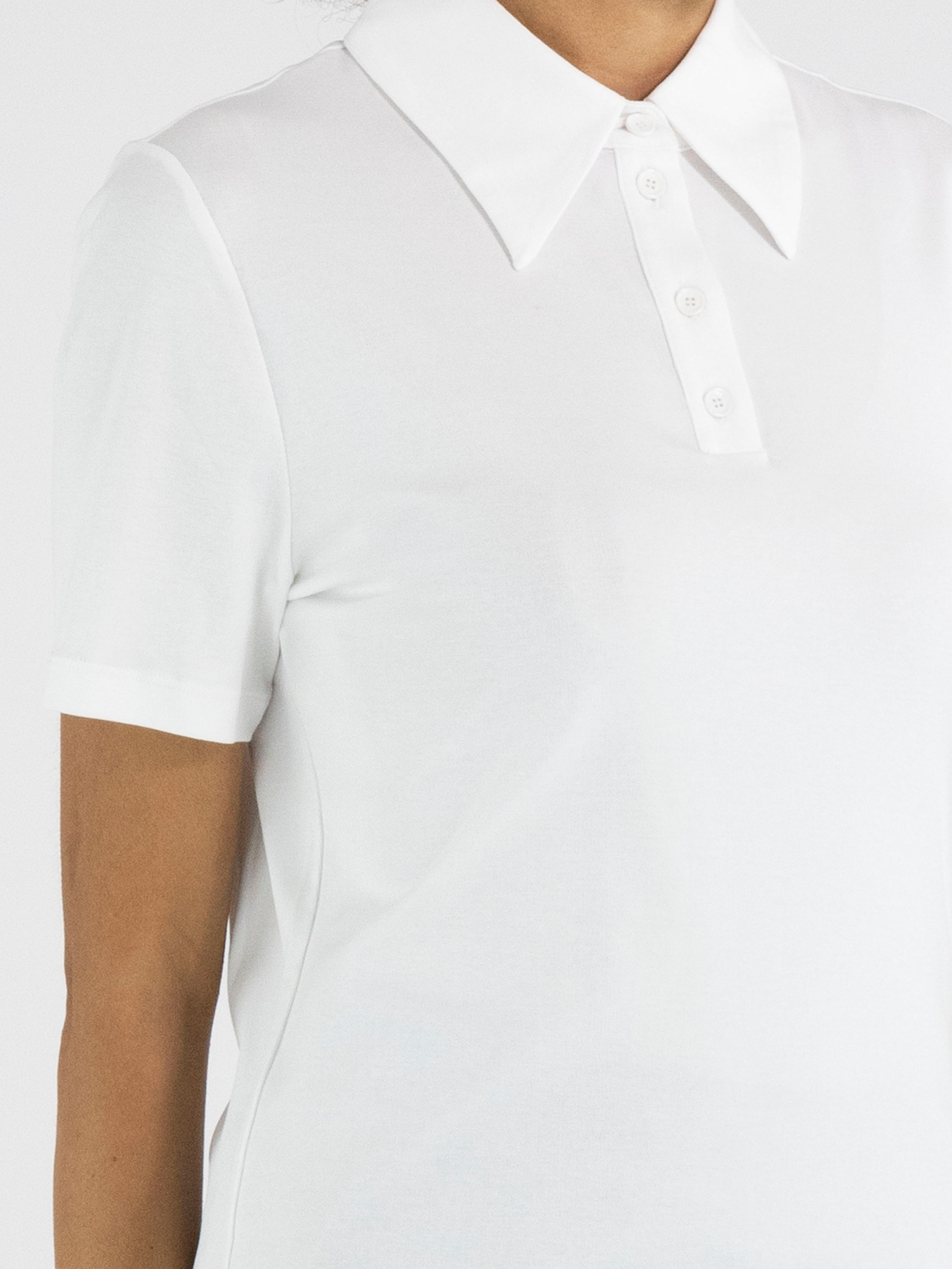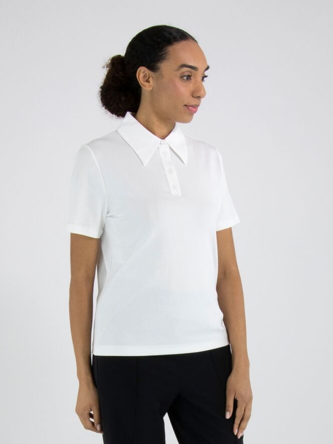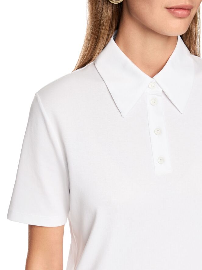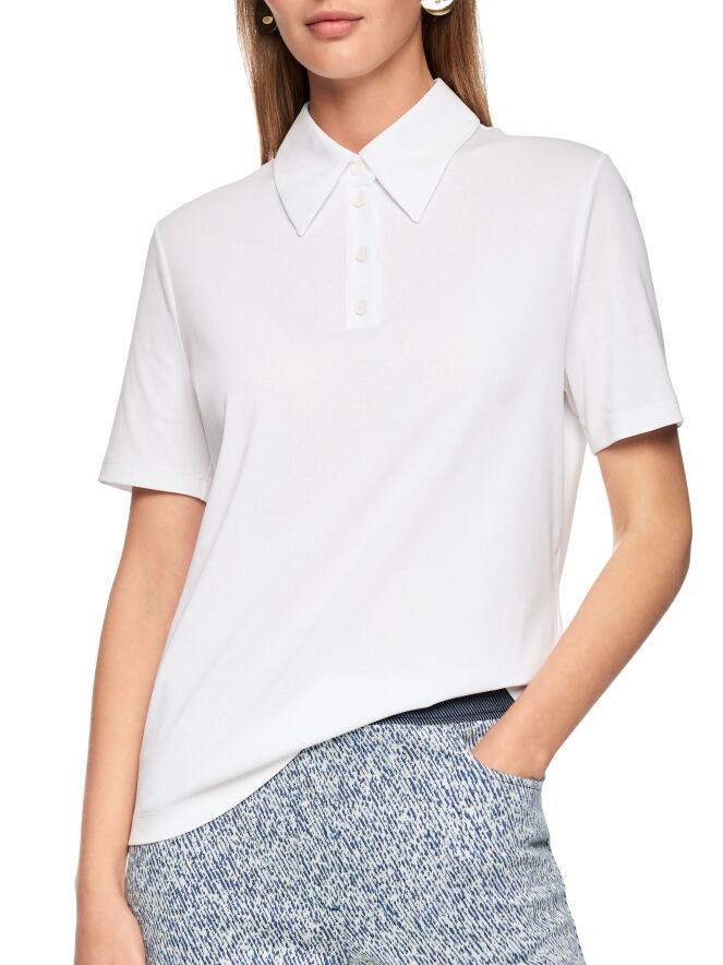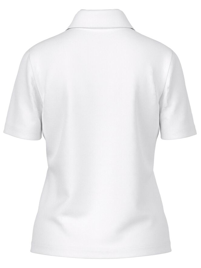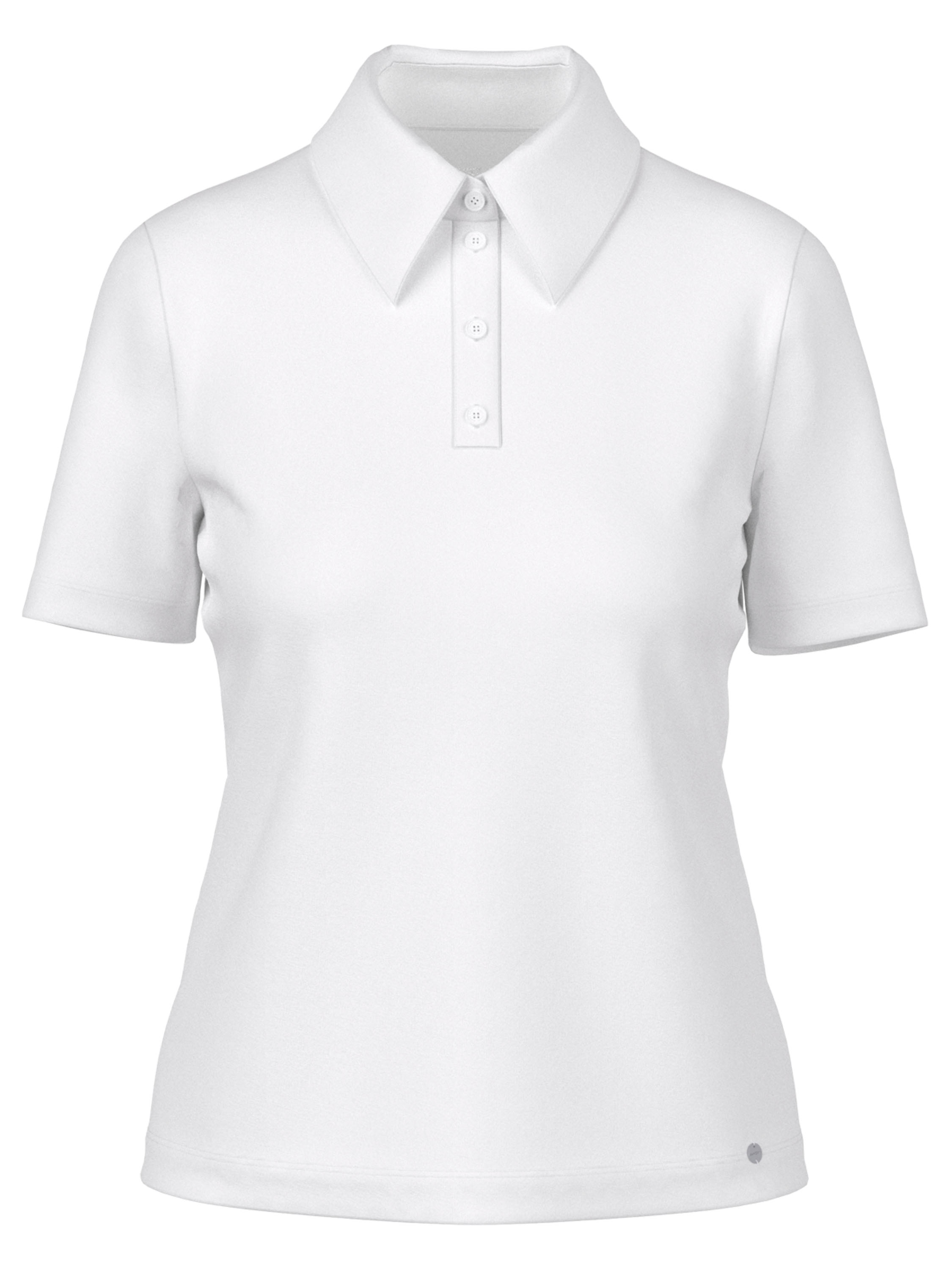 Poloshirt von Marc Cain in Weiß. Dieses elegante Modell in Uni-Farbe mit kurzen Ärmeln besticht durch eine zeitlose, raffinierte Ausstrahlung. Dieses exklusive Designer-Poloshirt kann bei 30 Grad gewaschen werden.