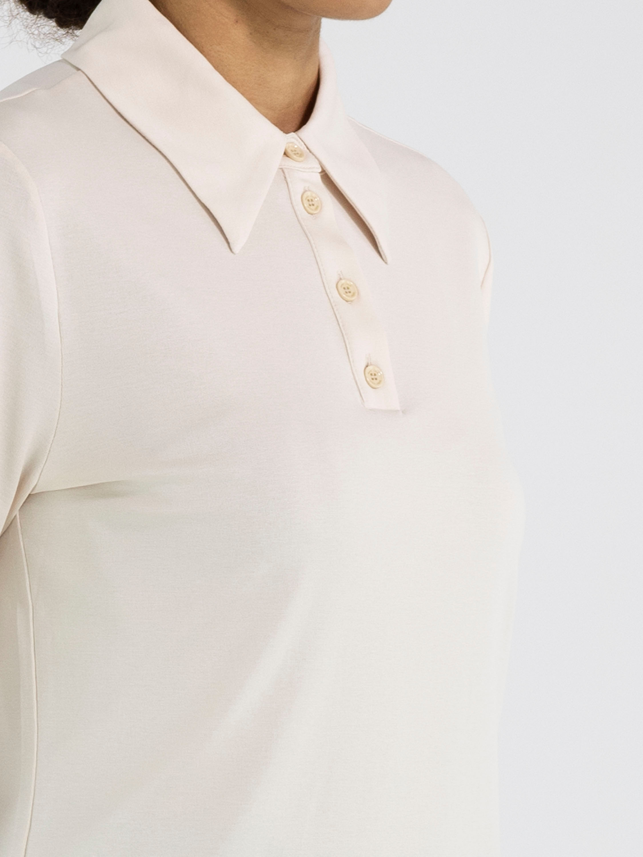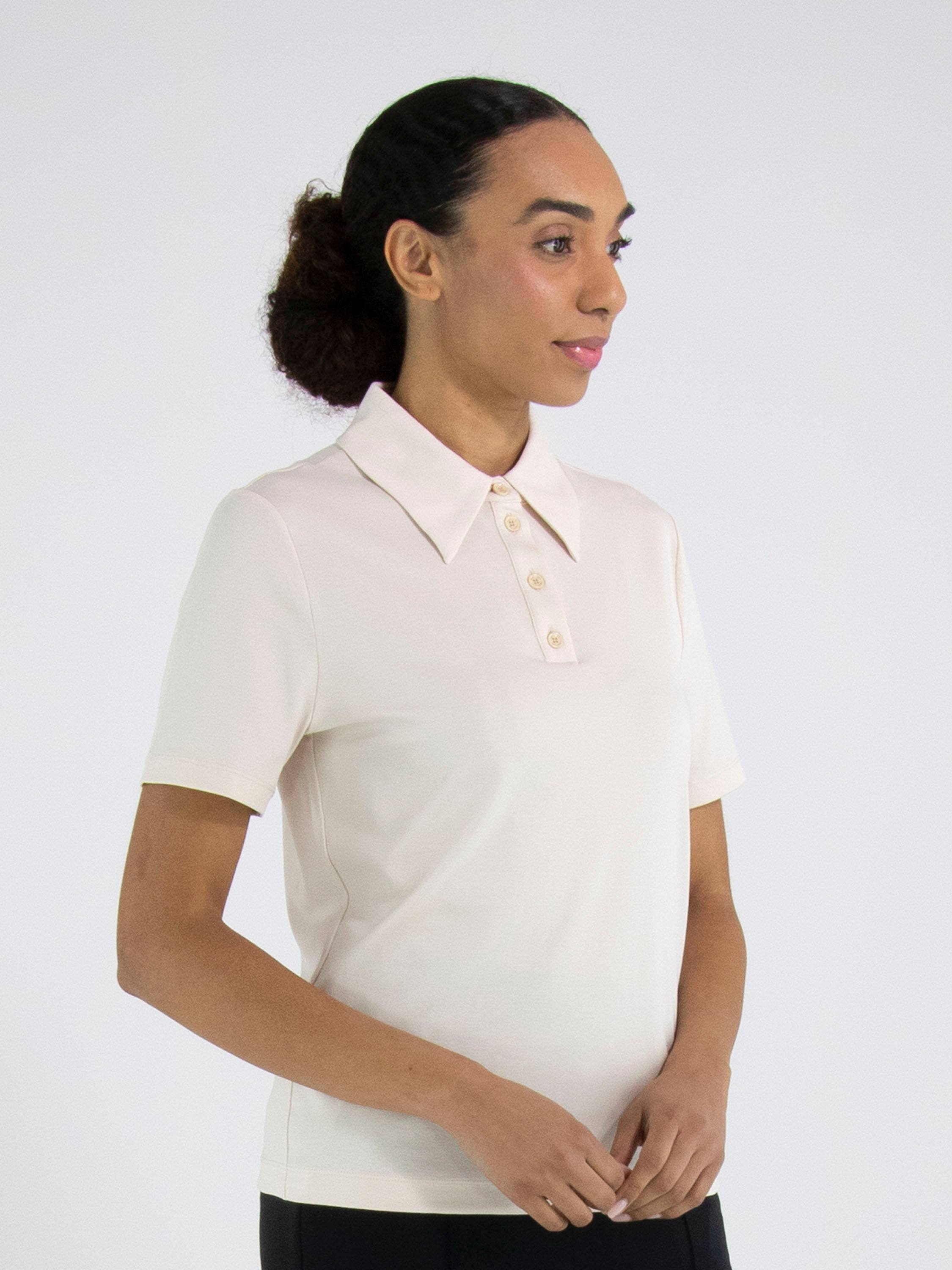 Poloshirt von Marc Cain in Beige. Dieses elegante, unifarbene Modell mit kurzen Ärmeln verbindet eine sportliche Ausstrahlung mit dem raffinierten Stil, der typisch für Marc Cain ist. Dieses exklusive Designerpoloshirt kann bei 30 Grad gewaschen werden.