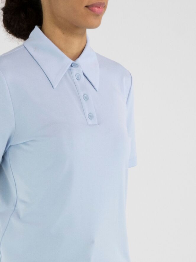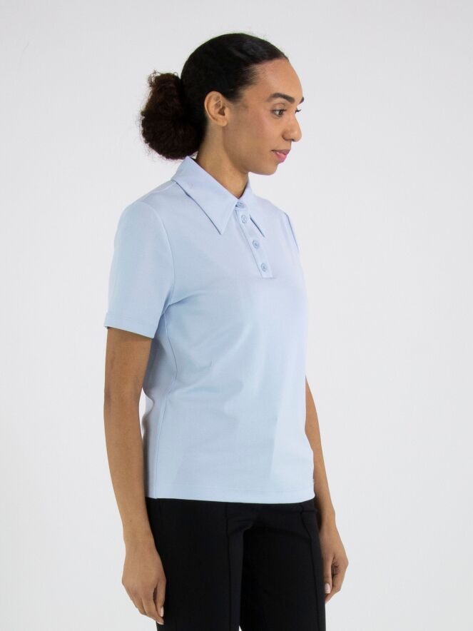 Poloshirt von Marc Cain in einem zarten Pastellblau. Komplett in Uni gearbeitet und mit kurzen Ärmeln versehen, vereint es eine frische, sportlich-elegante Ausstrahlung. Dieses exklusive Designer-Poloshirt kann bei 30 Grad gewaschen werden.