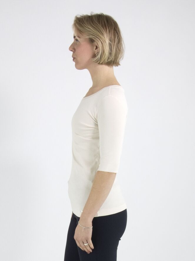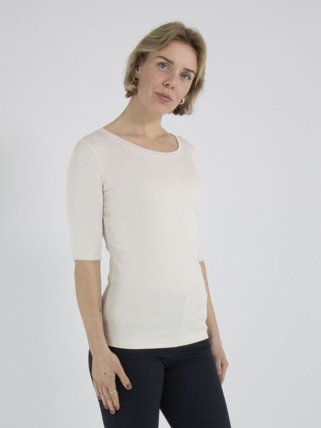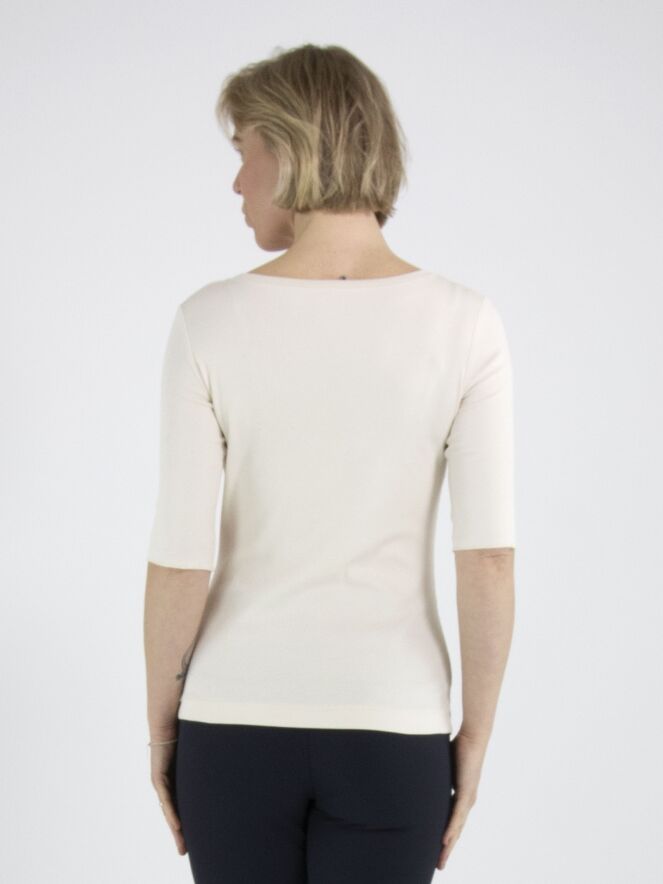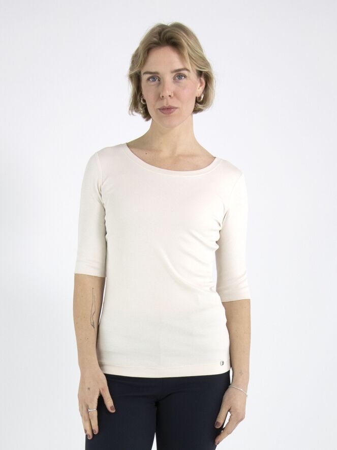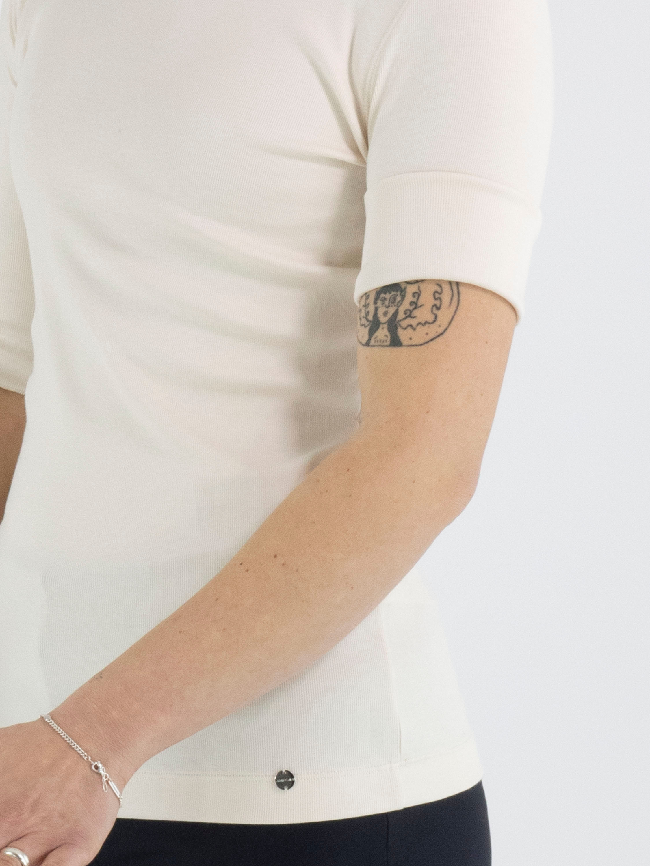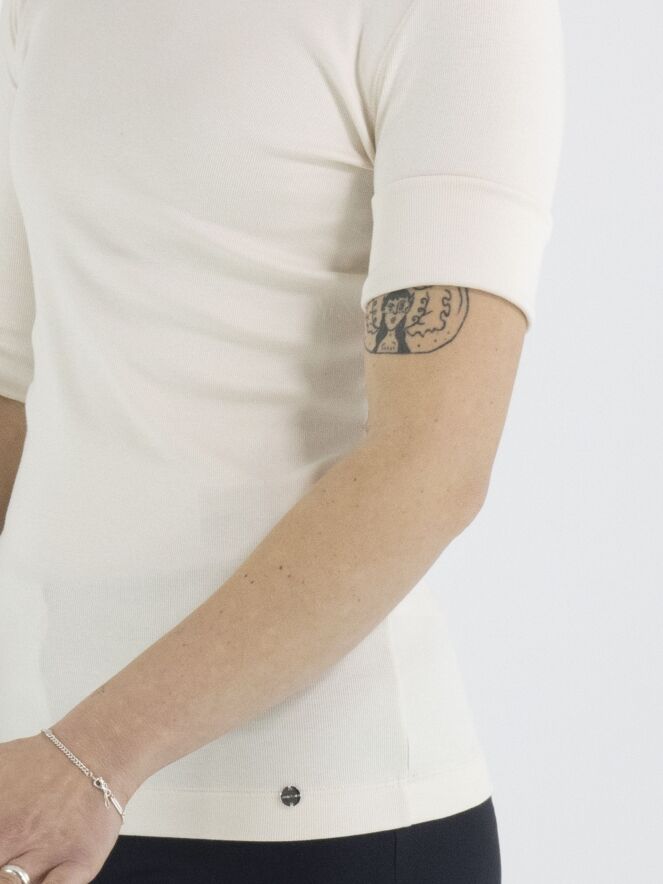 Shirt von Marc Cain aus fein gerippter Ware in der Farbe Beige. Mit Rundhalsausschnitt und kurzen Ärmeln mit eleganter Umschlagkante verleiht es eine stilvolle, lässige Ausstrahlung. Dieses exklusive Designeroberteil kann bei 30 Grad gewaschen werden.