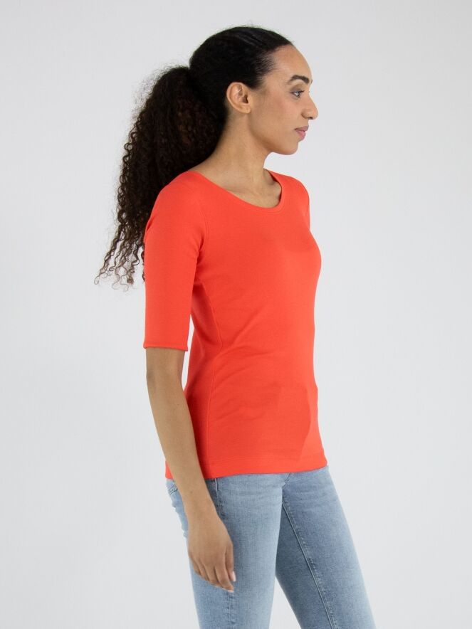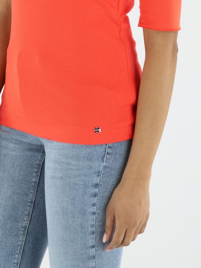 Shirt von Marc Cain aus fein gerippter Ware in einem lebendigen Orangeton. Mit Rundhalsausschnitt und kurzen Ärmeln mit stilvoller Umschlagkante verleiht es eine moderne und feminine Ausstrahlung. Dieses exklusive Designeroberteil kann bei 30 Grad gewaschen werden.