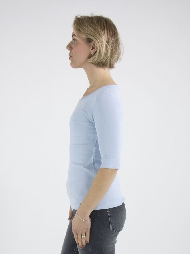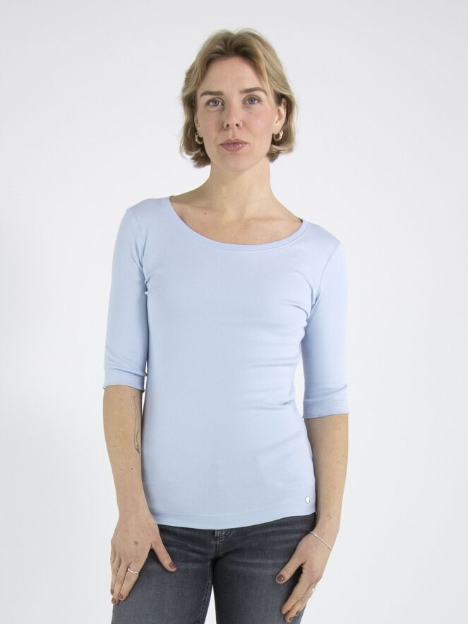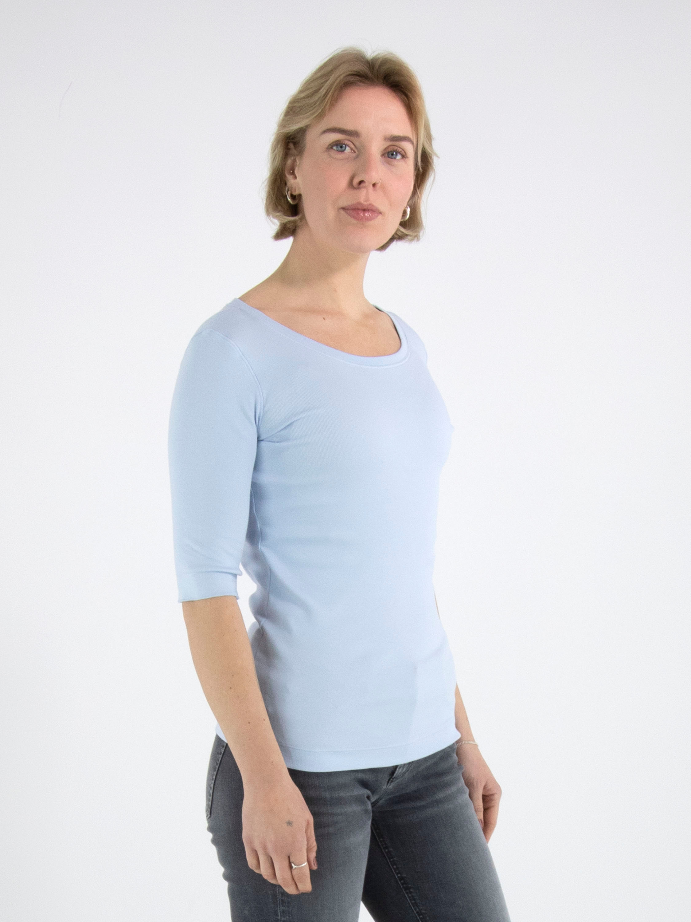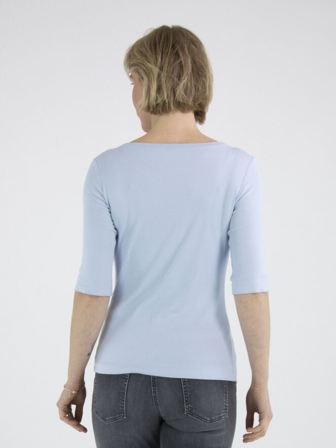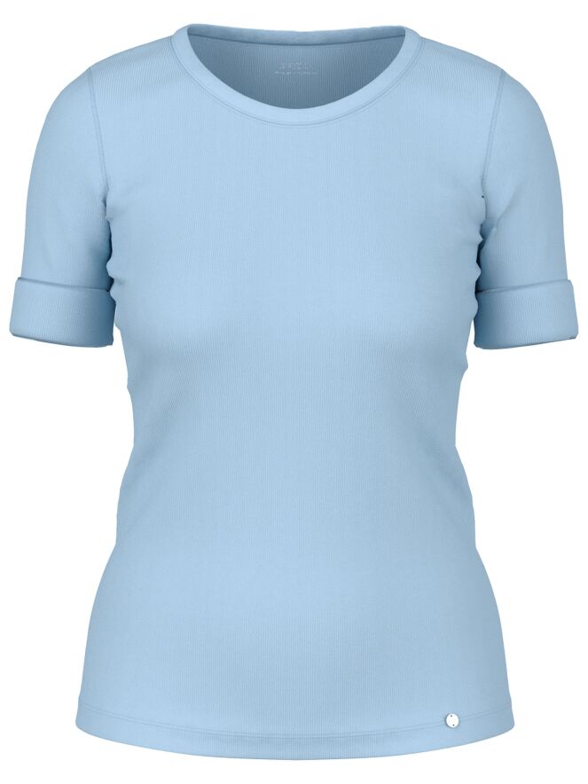 Shirt von Marc Cain aus fein gerippter Qualität in einem zarten Pastellblau. Mit Rundhalsausschnitt und kurzen Ärmeln mit stilvollem Umschlag verleiht es einen modernen, femininen Look. Dieses exklusive Designeroberteil kann bei 30 Grad gewaschen werden.