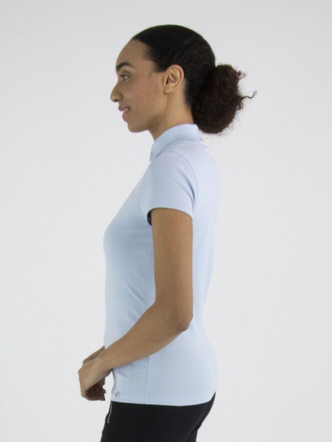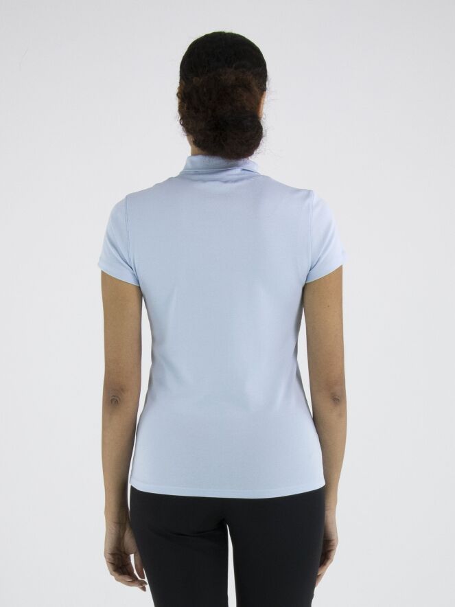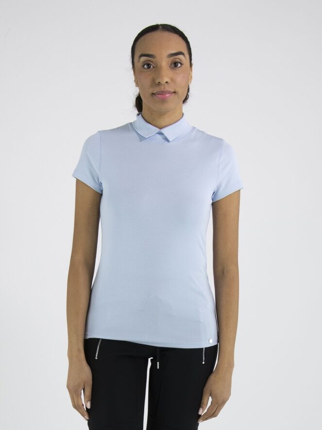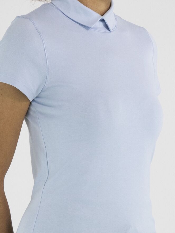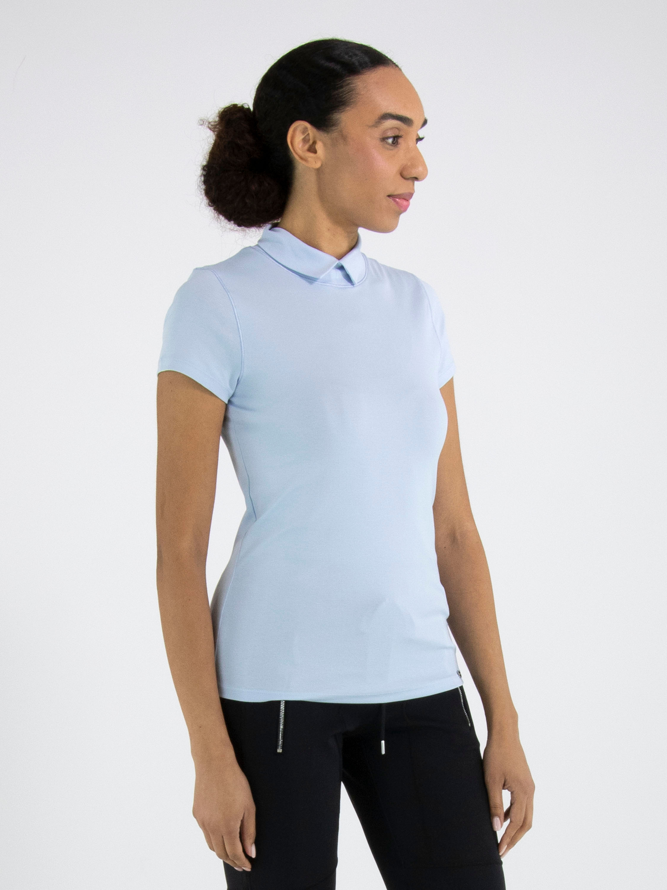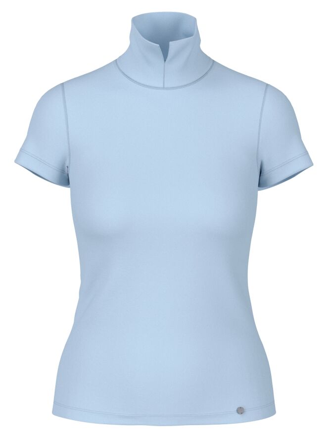 Shirt von Marc Cain in einem zarten Pastellblau. Mit kurzen Ärmeln und einem Turtlekragen mit kleinem Schlitz in der vorderen Mitte verleiht es einen eleganten, femininen Look. Dieses exklusive Designeroberteil kann bei 30 Grad gewaschen werden.
