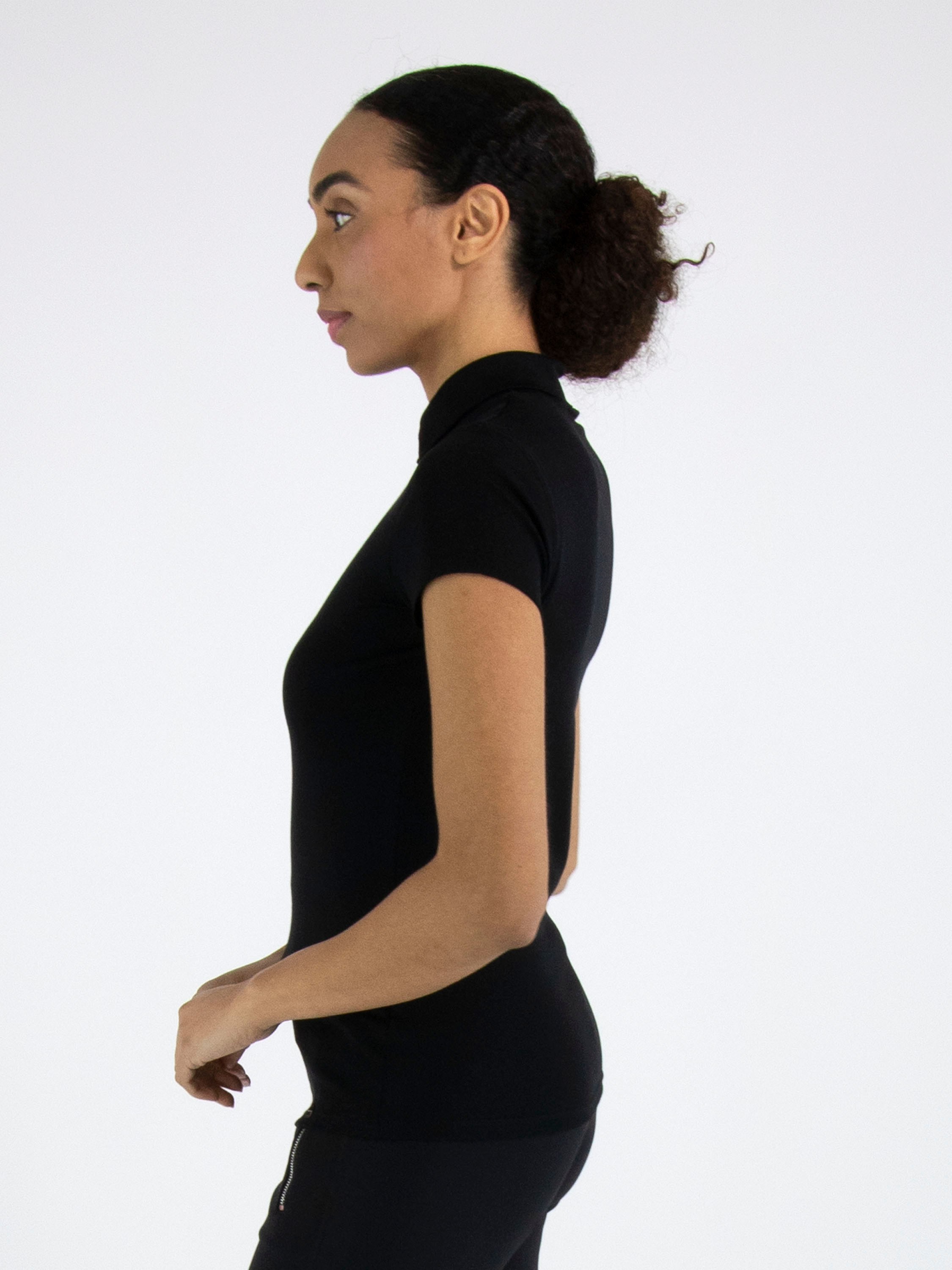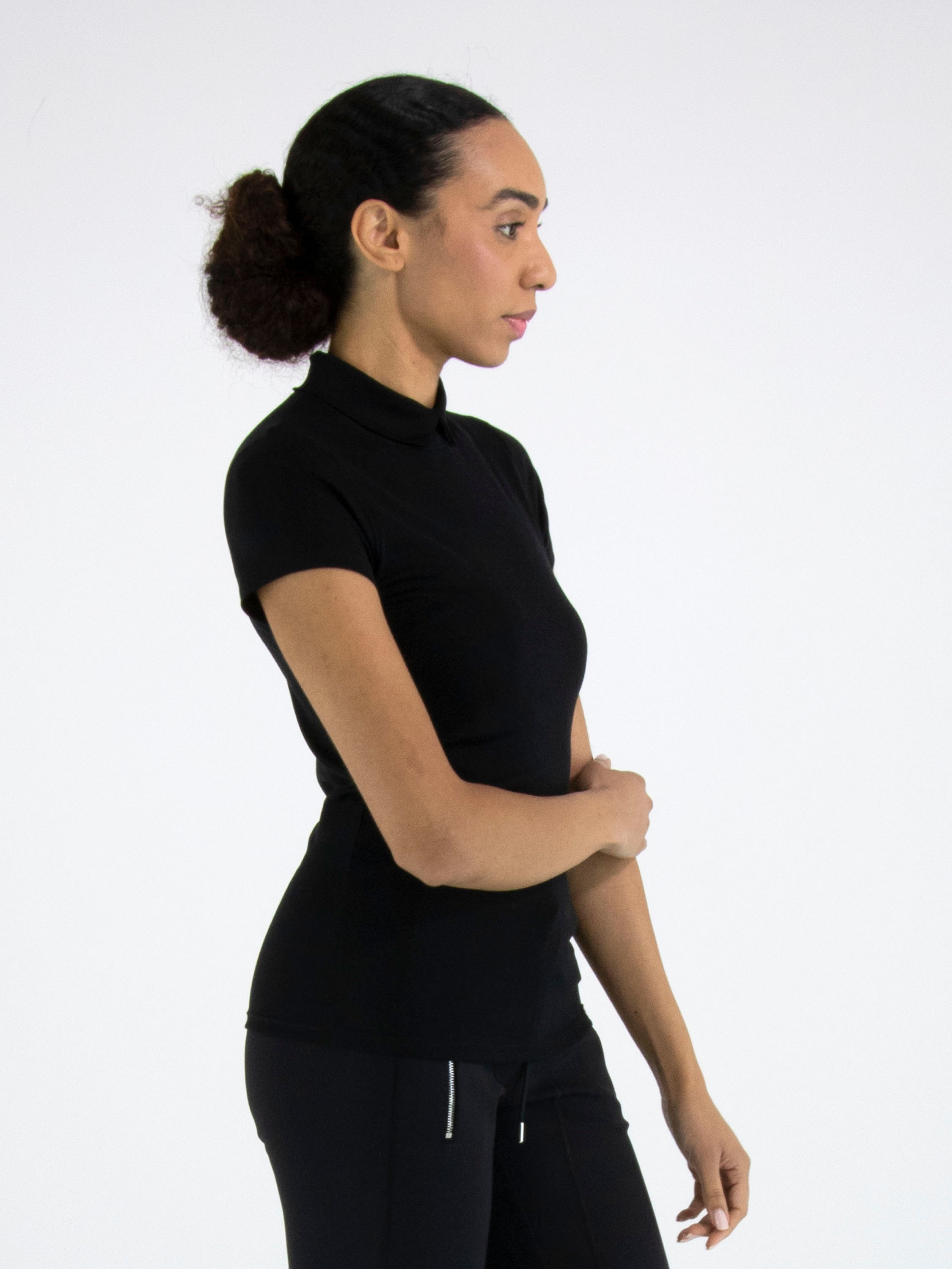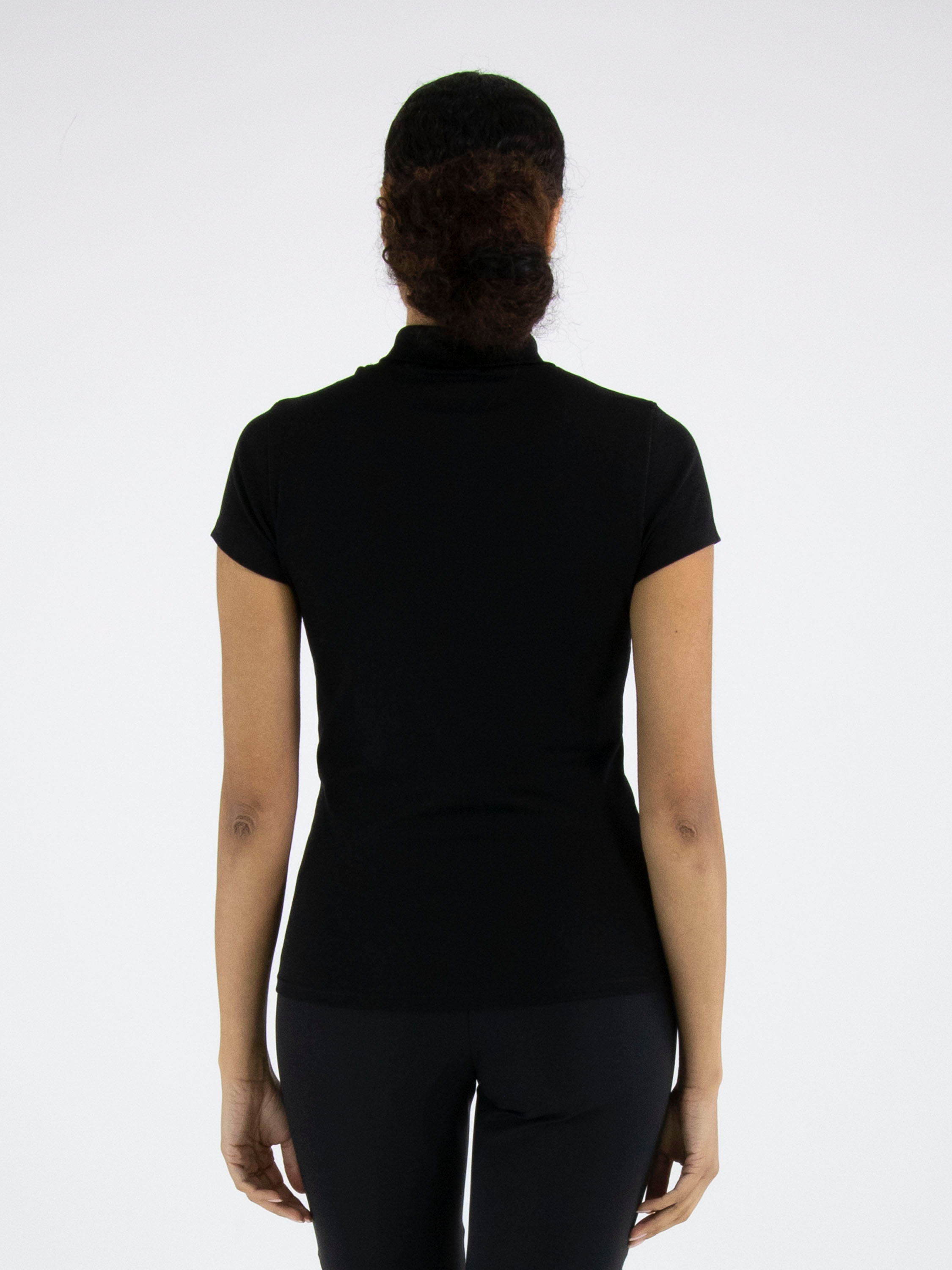 Shirt von Marc Cain in Schwarz. Mit kurzen Ärmeln und einem Turtlekragen mit kleinem Schlitz in der vorderen Mitte verleiht es einen eleganten, femininen Look. Dieses luxuriöse Basic von Marc Cain kann bei 30 Grad gewaschen werden.