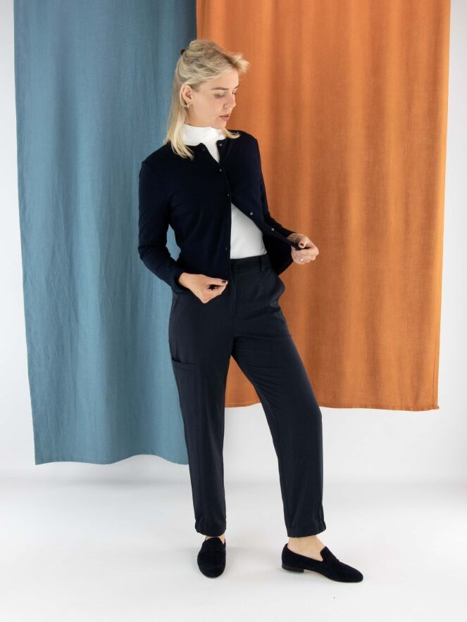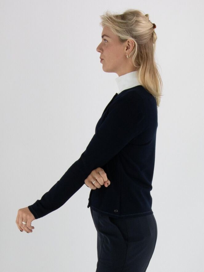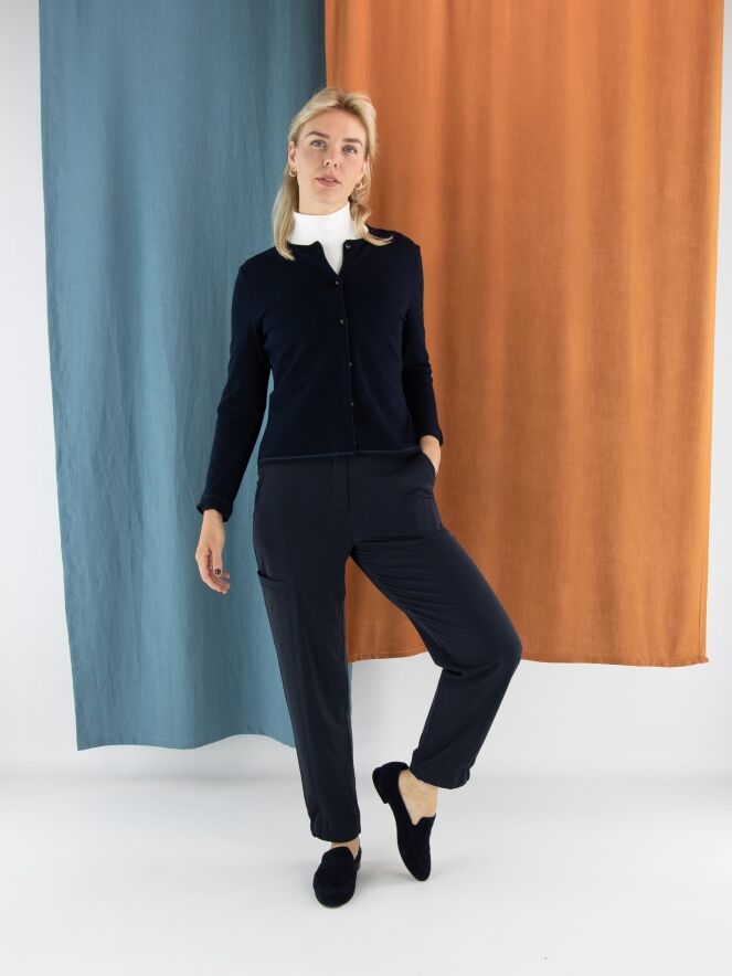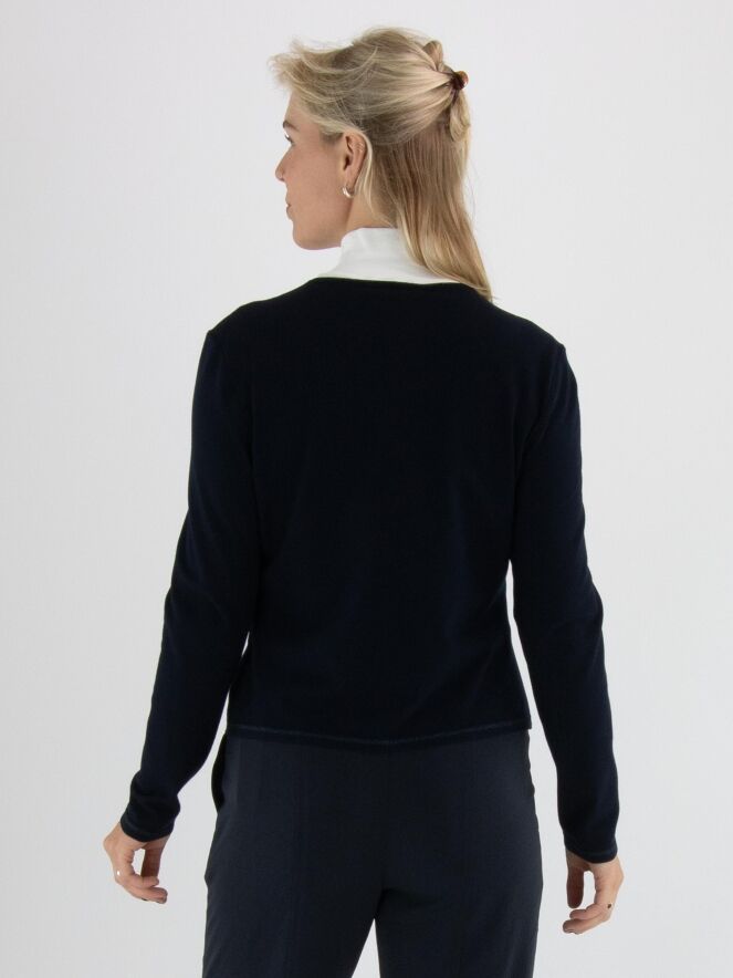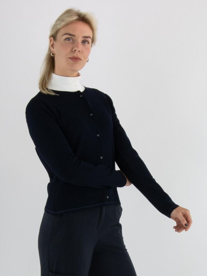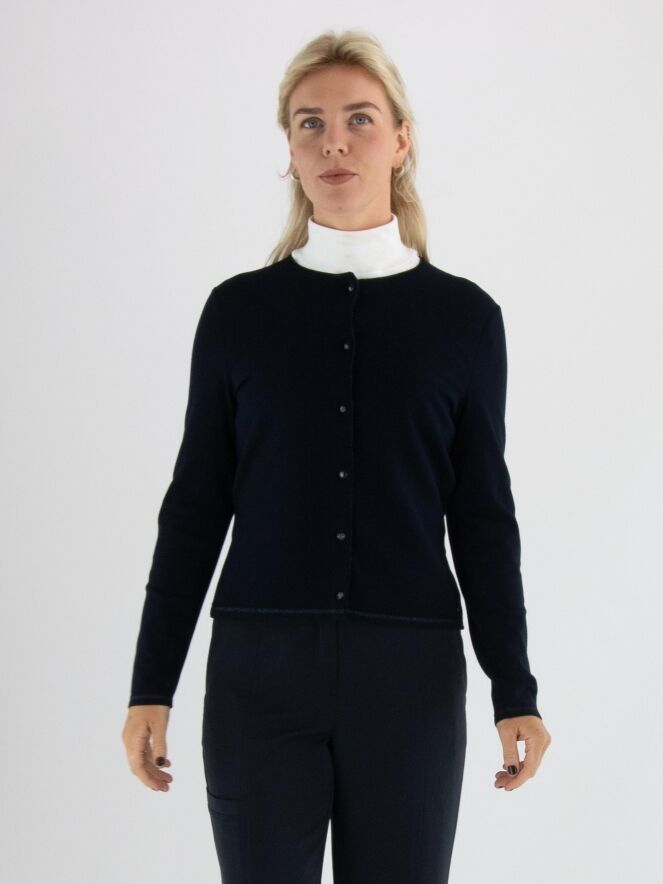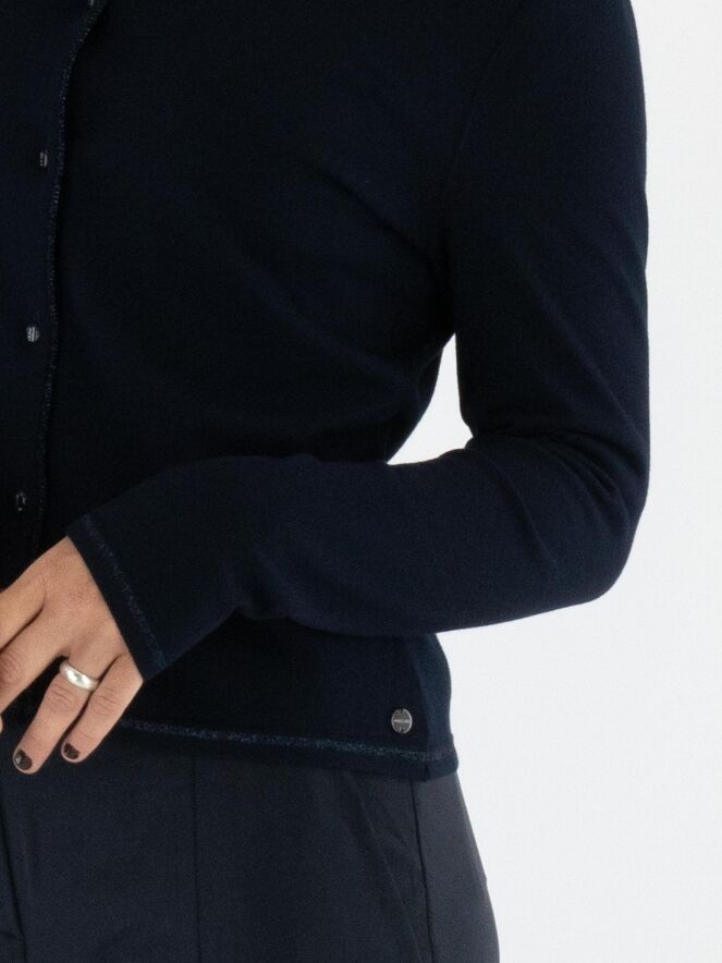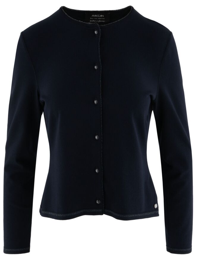Eine kurze Strickjacke von Marc Cain in Marineblau. Am Halsausschnitt und entlang der Vorderkante verläuft eine Borte mit eingearbeitetem blauen Metallicfaden. Am unteren Saum befindet sich ein schmaler, fein gerippter Strickbund passend zur Borte. Diese Strickjacke kann bei 30 Grad gewaschen werden.