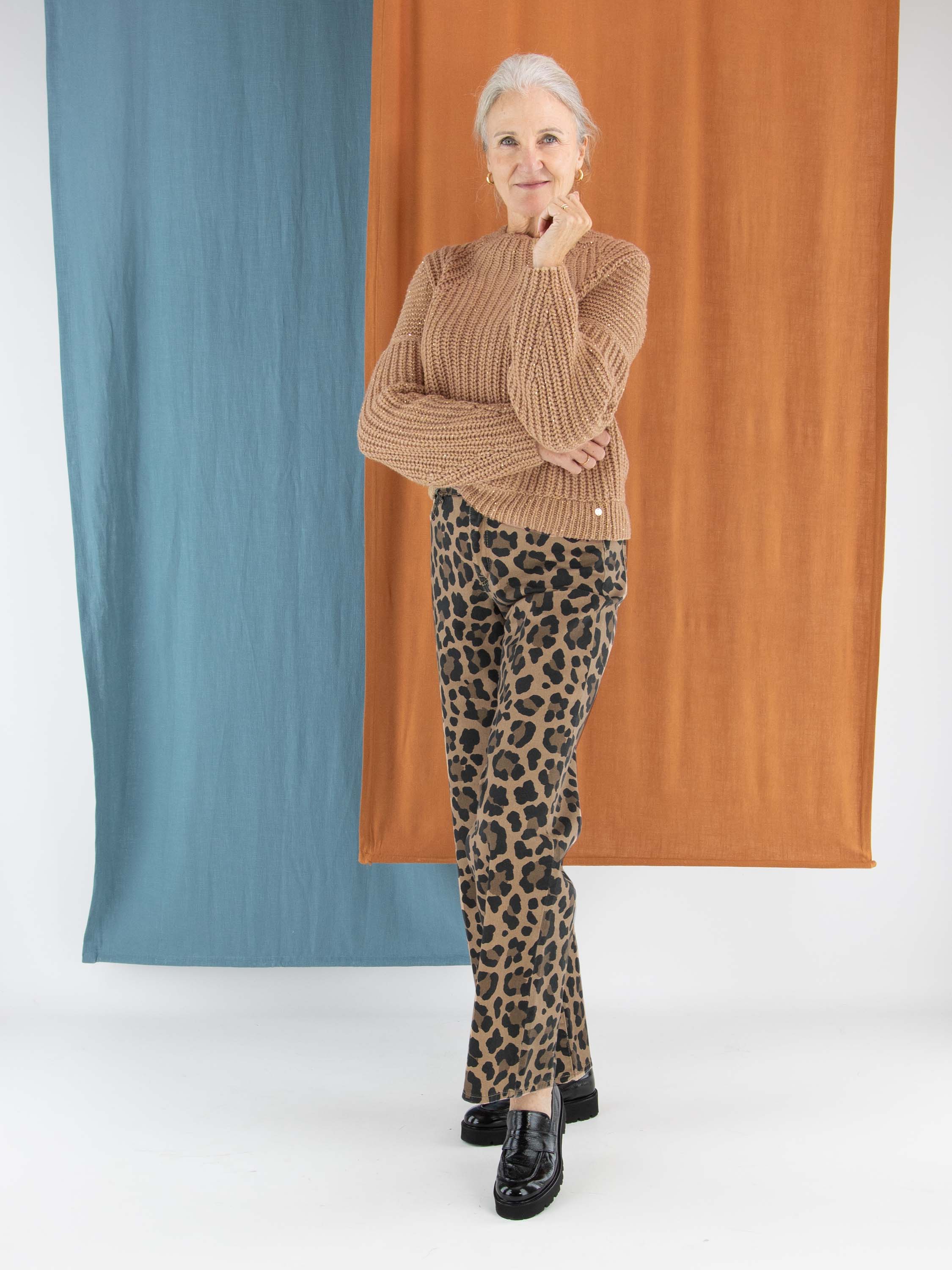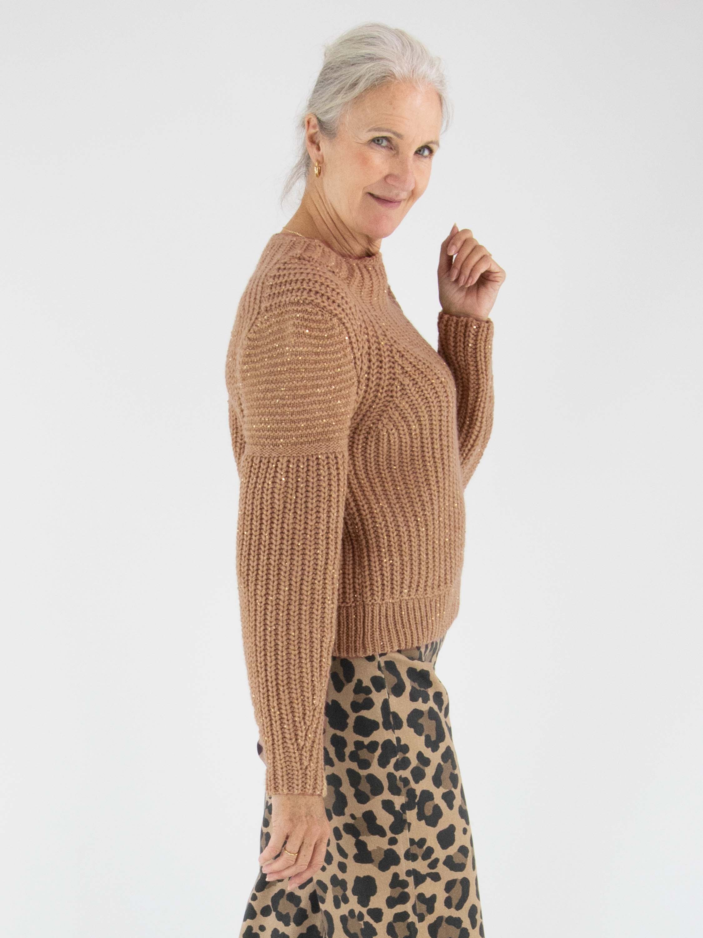 Pullover von Marc Cain in der Farbe Camel. In die Patentstrick-Struktur sind glänzende Pailletten in Camel eingearbeitet. Der Pullover hat einen Rollkragen und sollte per Hand gewaschen werden.