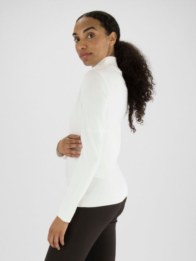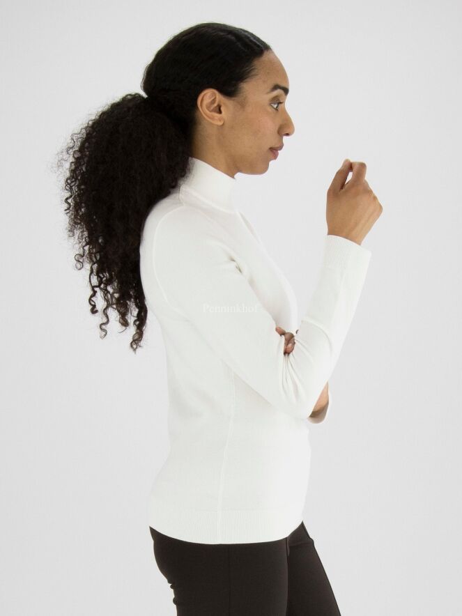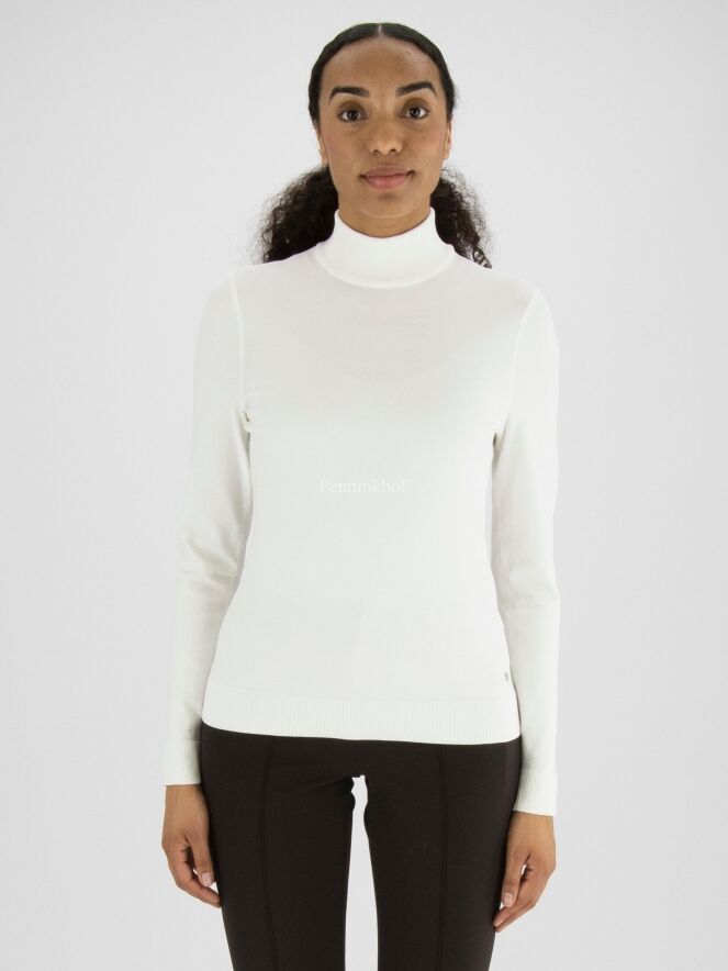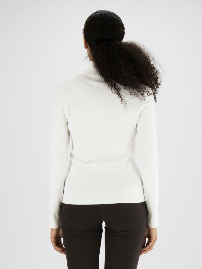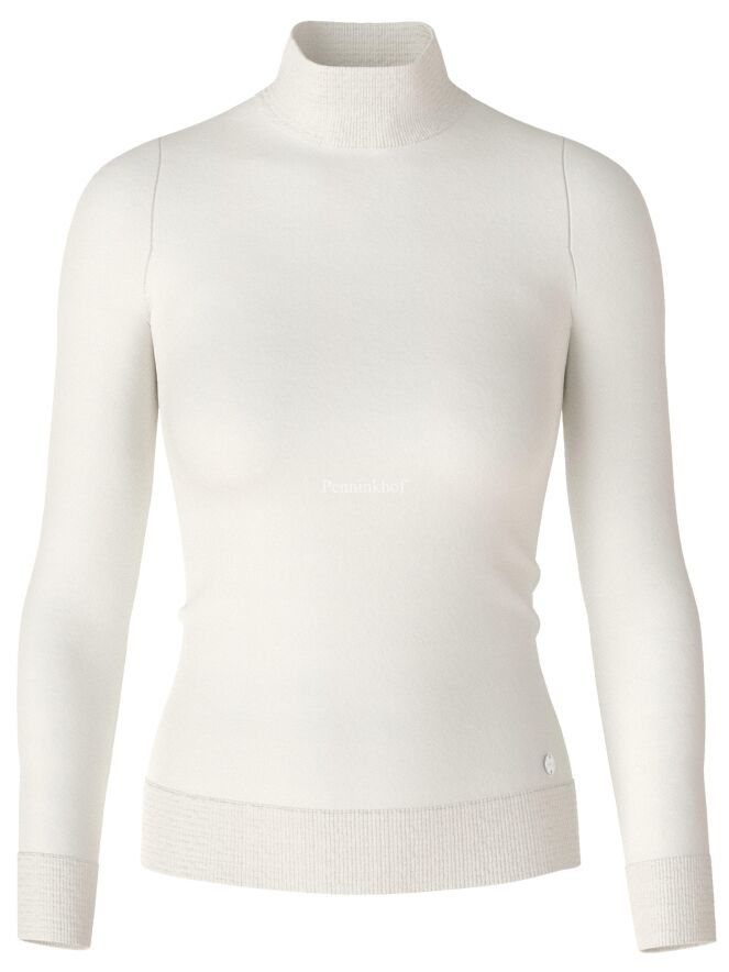 Ein Pullover der Designermode von Marc Cain in Cremeweiß. Der Pullover hat einen Schildkrötenkragen und lange Ärmel. Die Ärmelabschlüsse und der untere Saum sind mit einem Strickbündchen versehen. Dieser Pullover kann bei 30 Grad gewaschen werden.
