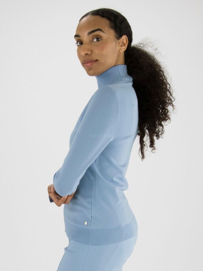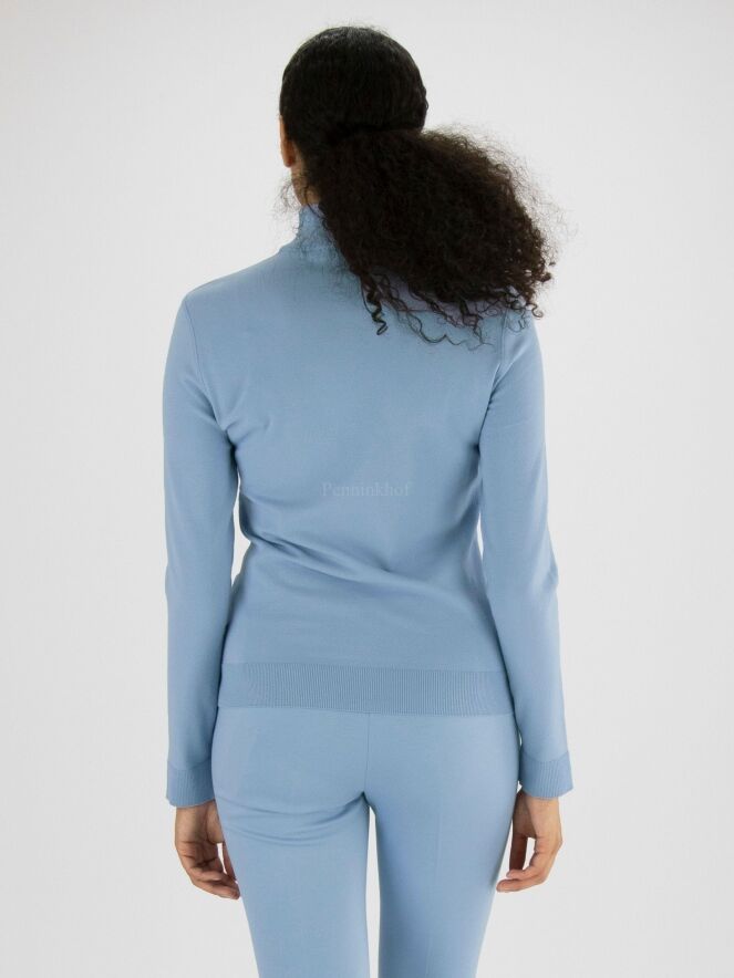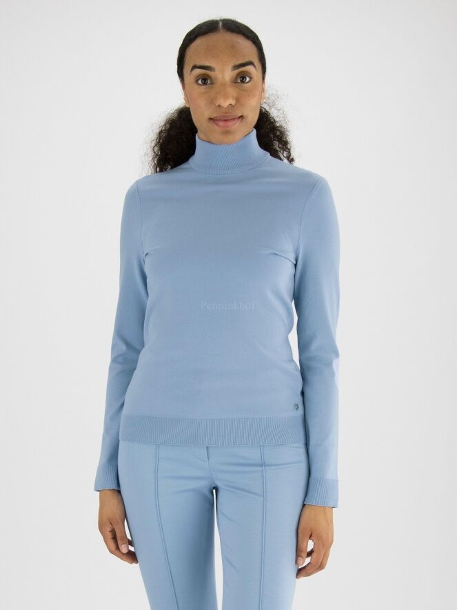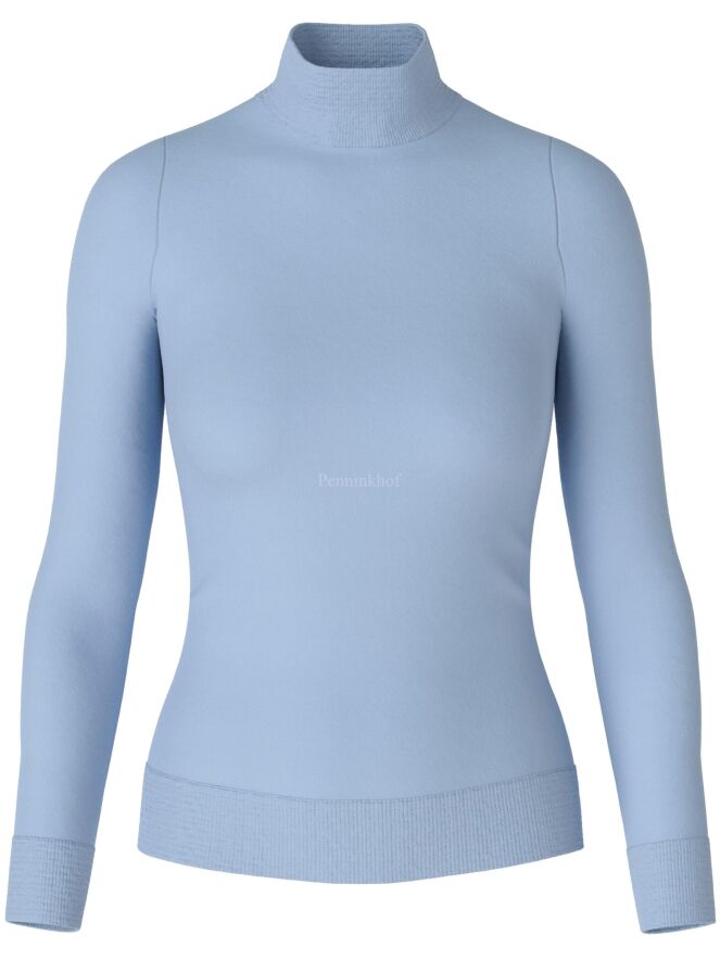 Ein hellblauer Pullover der Designermode von Marc Cain. Der Pullover hat einen Schildkrötenkragen und lange Ärmel. Die Ärmelabschlüsse und der untere Saum sind mit einem Strickbündchen versehen. Dieser Pullover kann bei 30 Grad gewaschen werden.