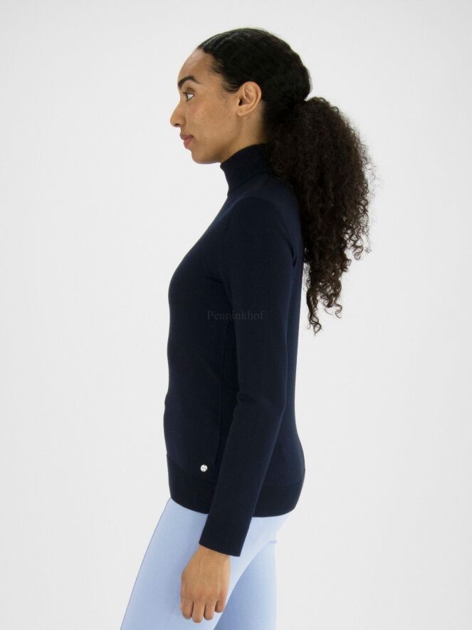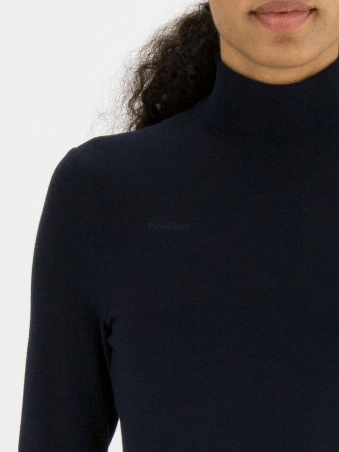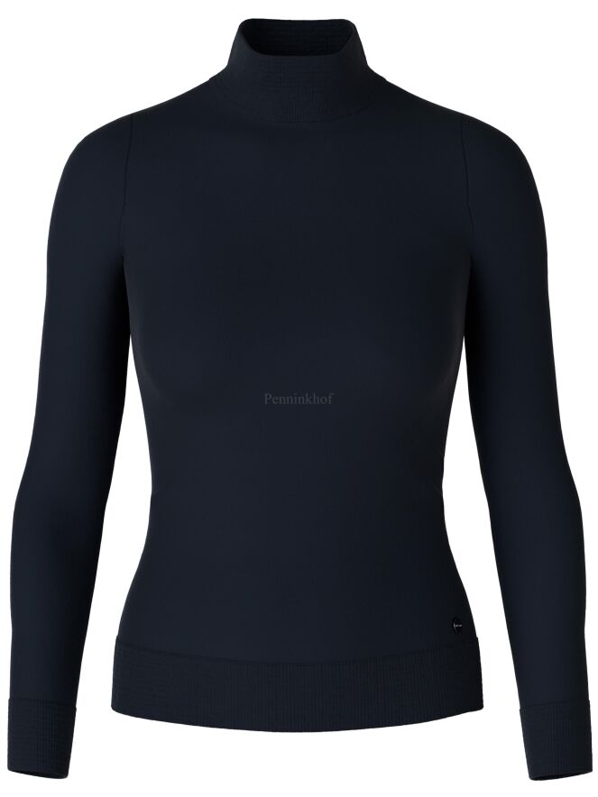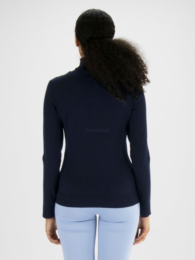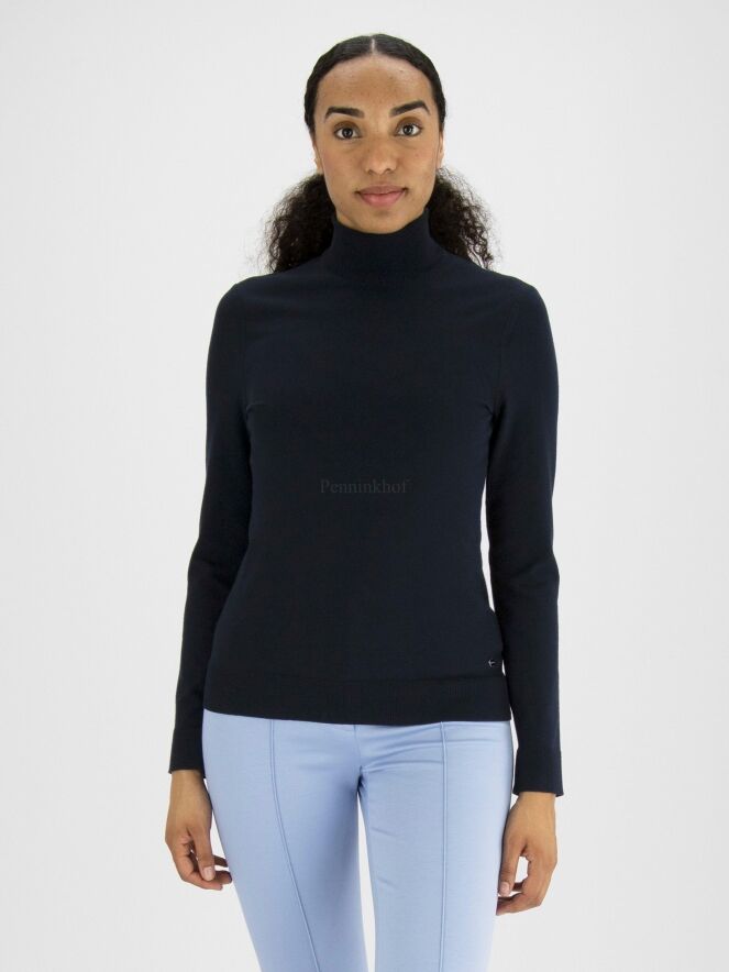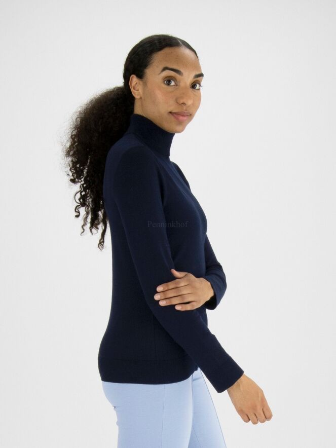 Ein marineblauer Pullover der Designermode von Marc Cain. Der Pullover hat einen Schildkrötenkragen und lange Ärmel. Die Ärmelabschlüsse und der untere Saum sind mit einem Strickbündchen versehen. Dieser Pullover kann bei 30 Grad gewaschen werden.