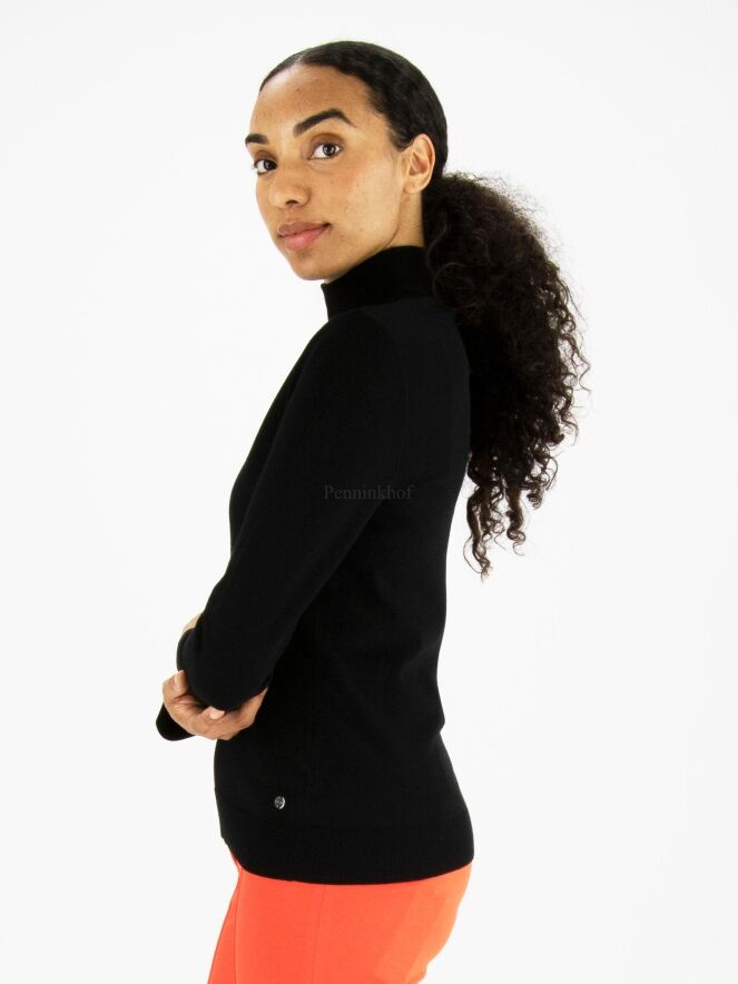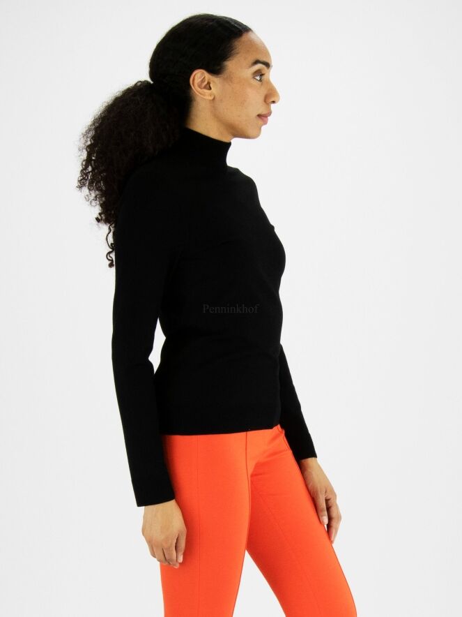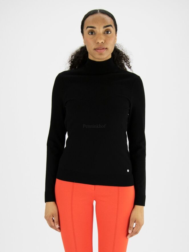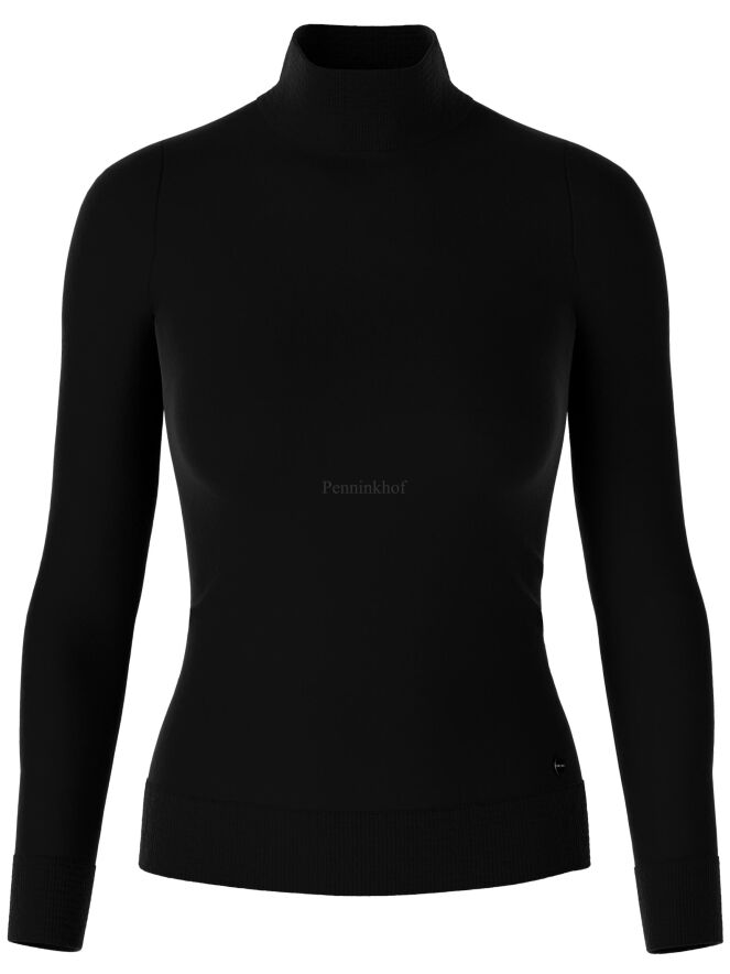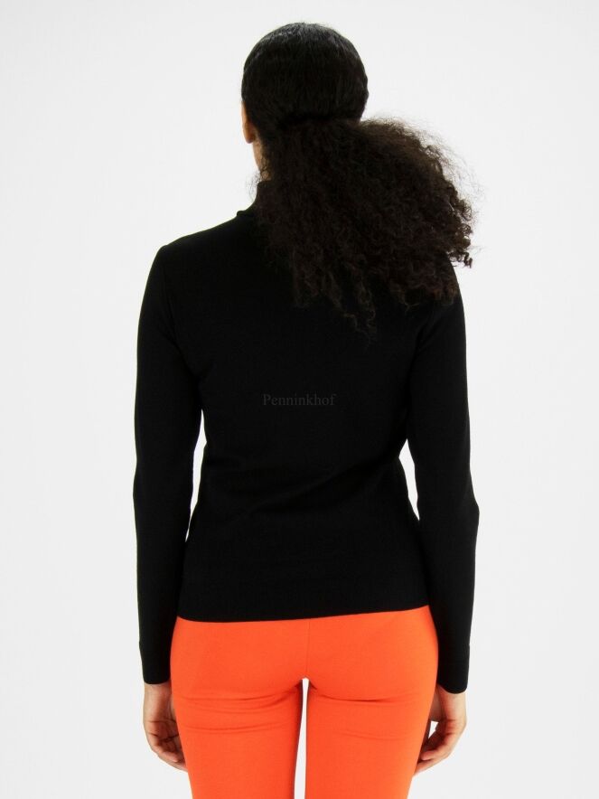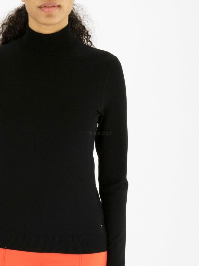 Ein schwarzer Pullover der Designermode von Marc Cain. Der Pullover hat einen Schildkrötenkragen und lange Ärmel. Die Ärmelabschlüsse und der untere Saum sind mit einem Strickbündchen versehen. Dieser Pullover kann bei 30 Grad gewaschen werden.