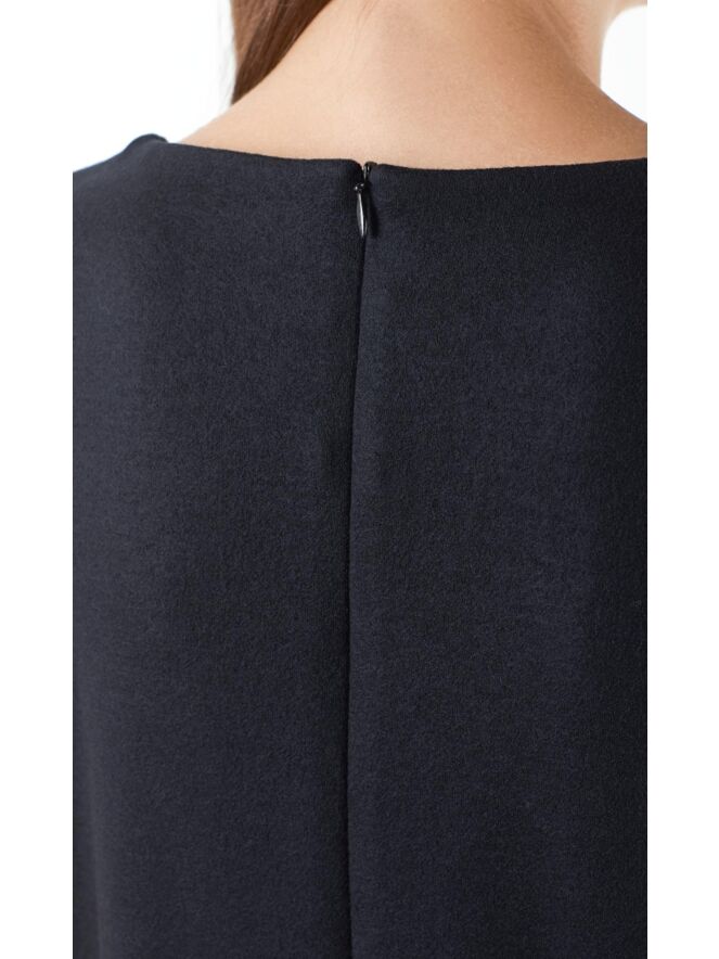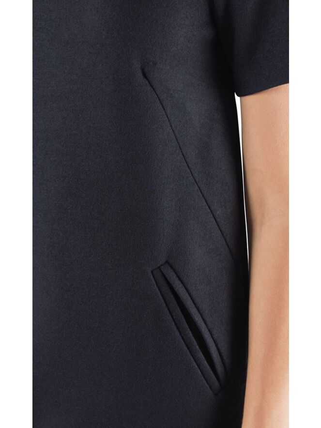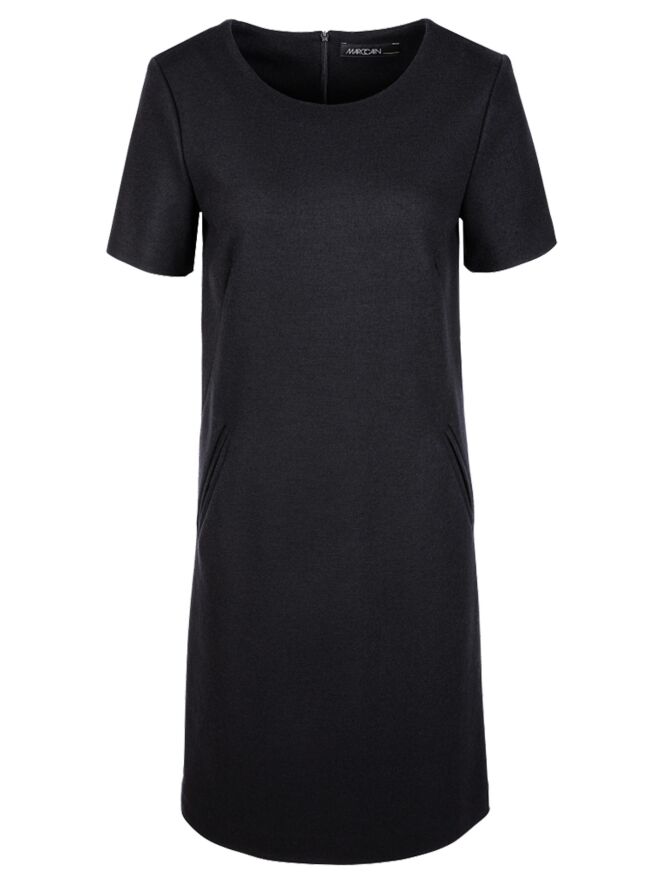 Ein schwarzes Kleid von Marc Cain. Das Kleid hat einen runden Halsausschnitt und kurze Ärmel. Auf Taillenhöhe befinden sich Eingrifftaschen. Auf der Rückseite ist mittig ein Reißverschluss, der bis unter die Taille reicht. Dieses Kleid ist gefüttert und darf nicht gewaschen werden.