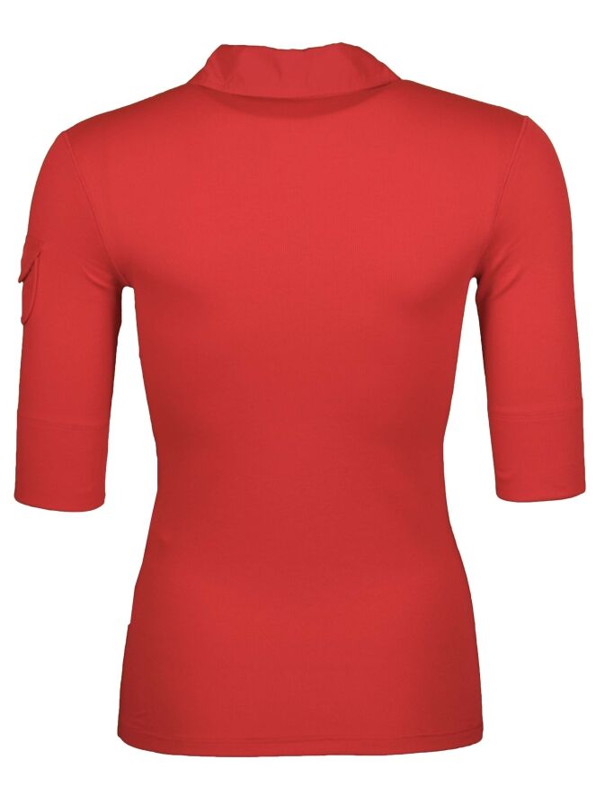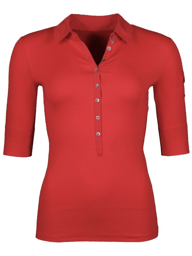 Feinripp-Poloshirt aus der Designermode-Kollektion von Marc Cain in der Farbe rot. Auf dem linken Ärmel befindet sich eine kleine Tasche. Der matt glänzende Kragen ist aus 100% Polyester. Dieses Poloshirt kann auf 30 Grad in der Waschmaschine gewaschen werden.