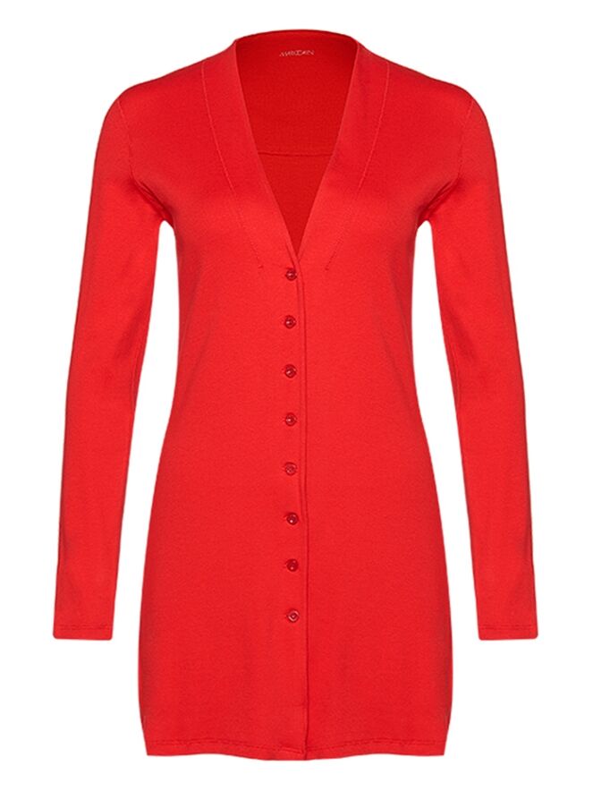 Rote, lange Weste aus der essentiels Kollektion der Designermodemarke Marc Cain. Dieser Longcardigan hat einen abgesteppten V-Ausschnitt und lange Ärmel. Alle Westen dieses Modells lassen sich auf vielerlei Arten kombinieren. Diese Weste kann auf 30 Grad in der Waschmaschine gewaschen werden.