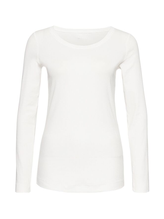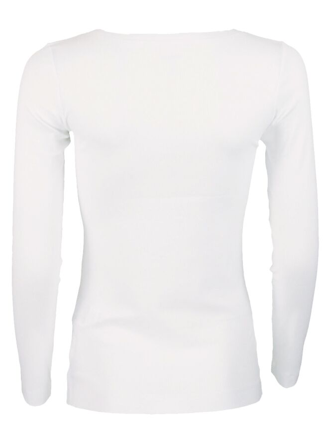 Weißes Basic-Shirt der Designermodemarke Marc Cain. Das Shirt hat lange Ärmel und einen runden Halsausschnitt. Dieses Shirt kann auf 30 Grad in der Waschmaschine gewaschen werden.