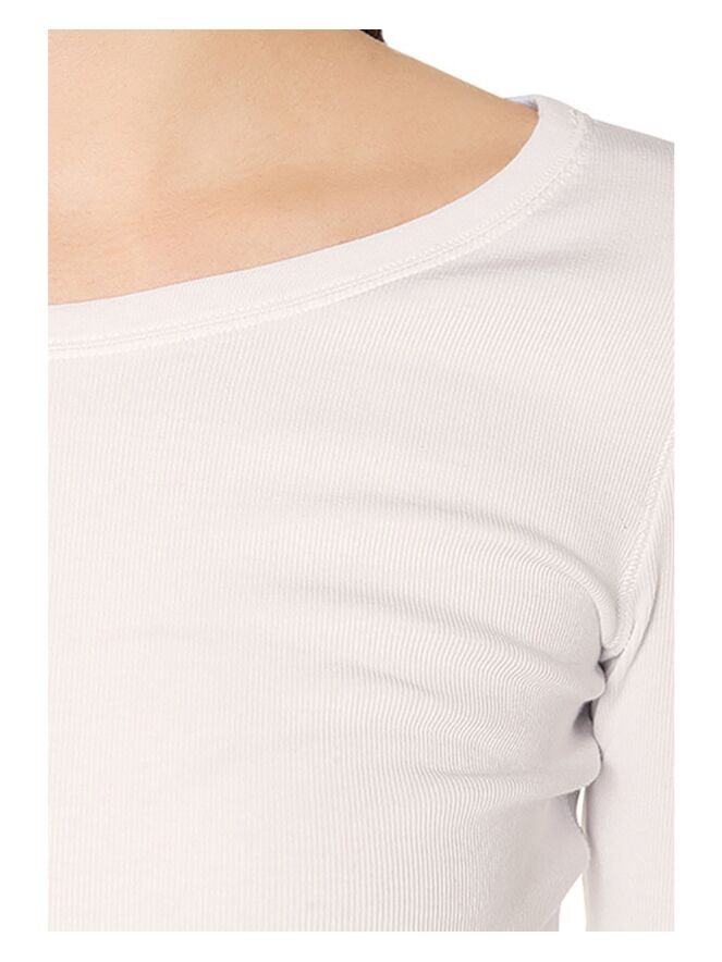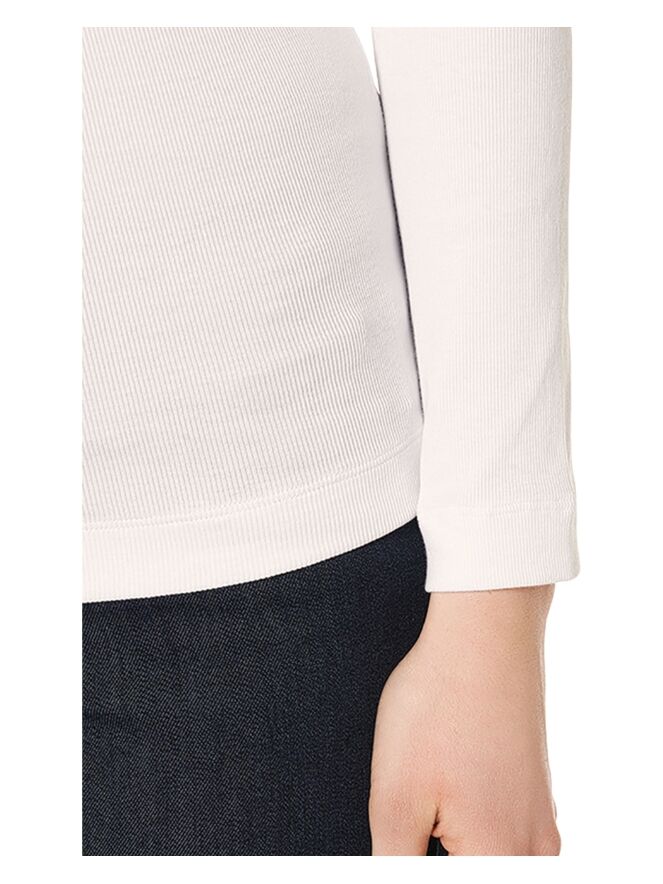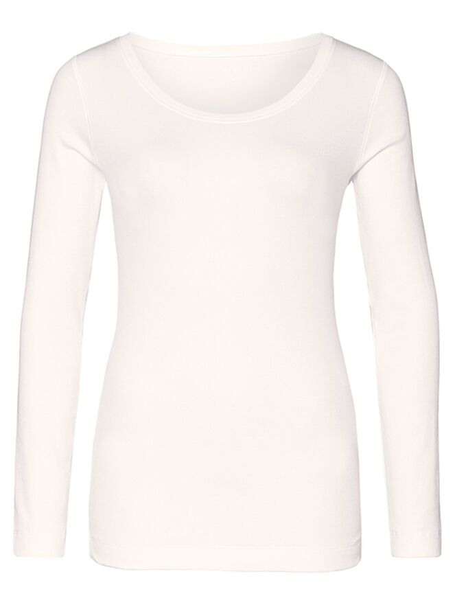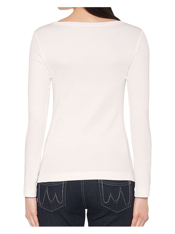 Cremeweißes Basic-Shirt der Designermode von Marc Cain. Das Shirt hat lange Ärmel und einen runden Halsausschnitt. Dieses Shirt kann bei 30 Grad in der Waschmaschine gewaschen werden.