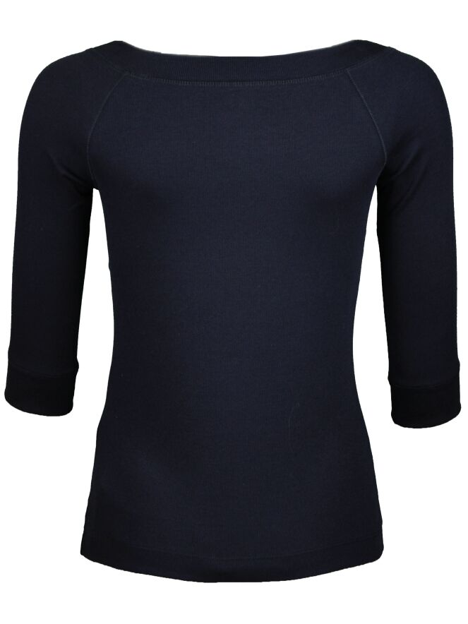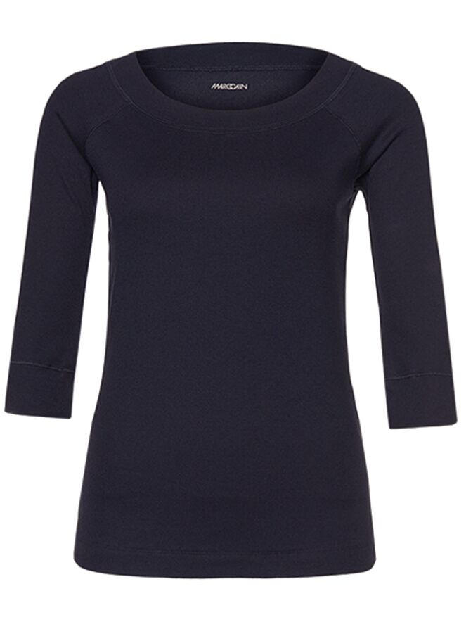 Marineblaues Shirt der Designermodemarke Marc Cain. Das Shirt hat halblange Ärmel und einen runden Halsausschnitt. Dieses Shirt kann auf 30 Grad in der Waschmaschine gewaschen werden.