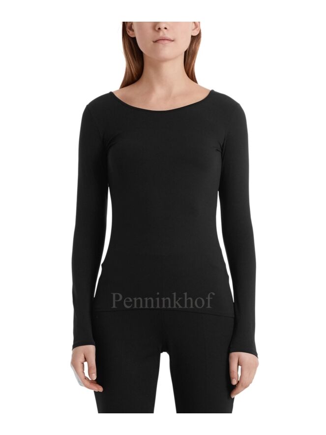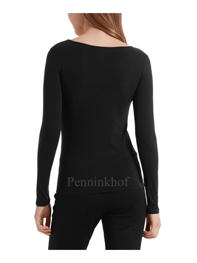 Schwarzes Basic-Shirt der Designermodemarke Marc Cain. Das Shirt hat lange Ärmel und einen runden Halsausschnitt. Dieses Shirt kann auf 30 Grad in der Waschmaschine gewaschen werden.
