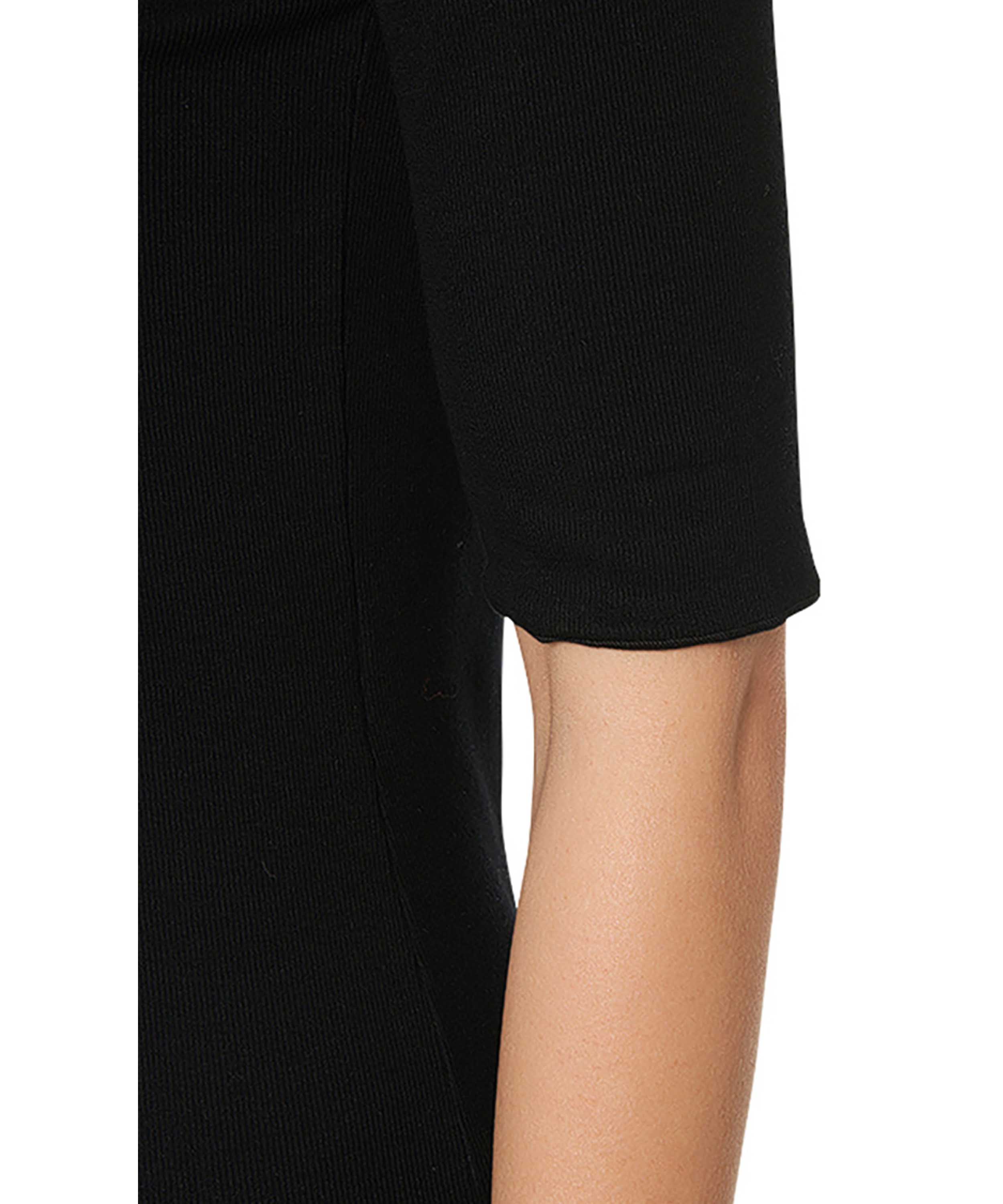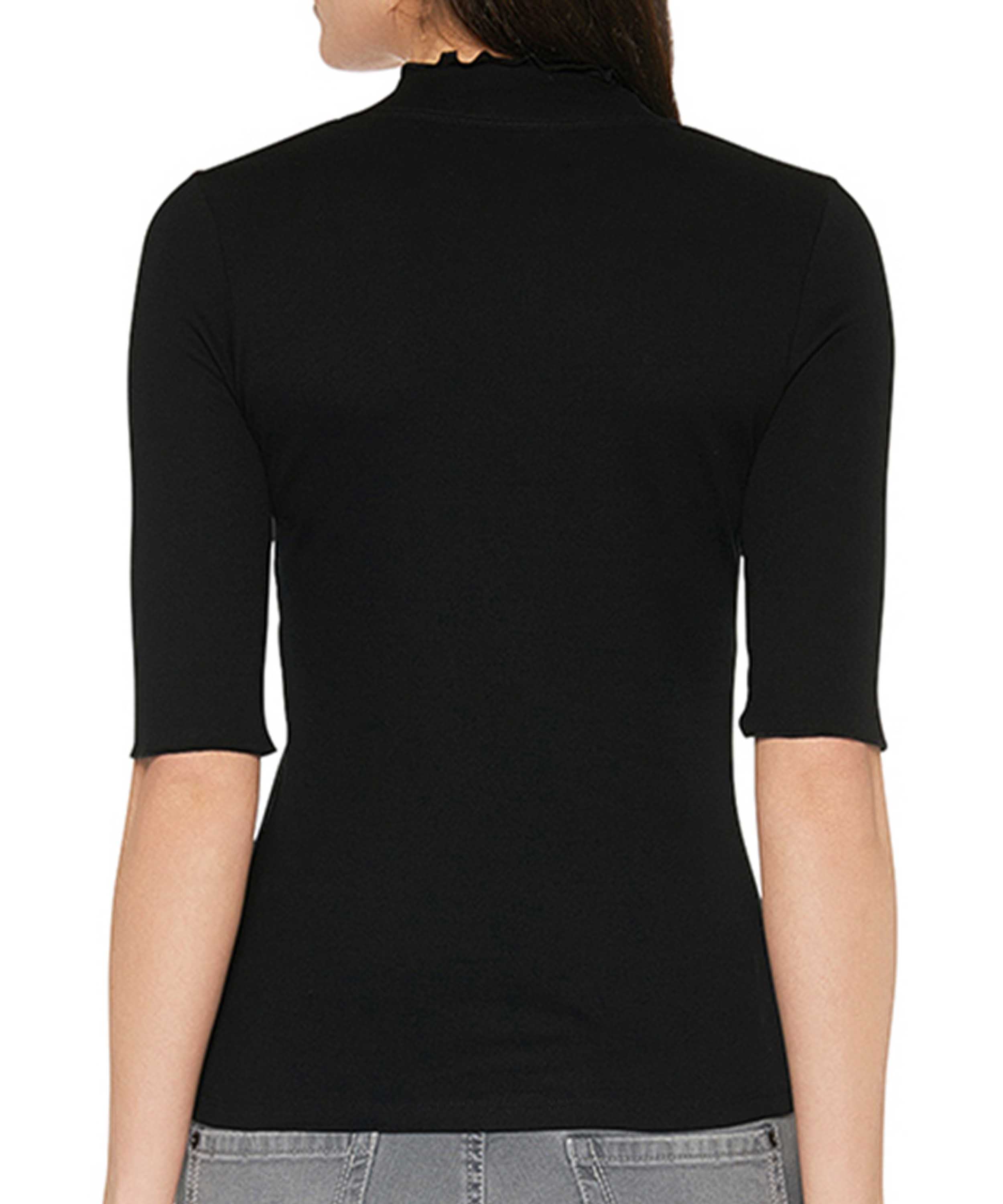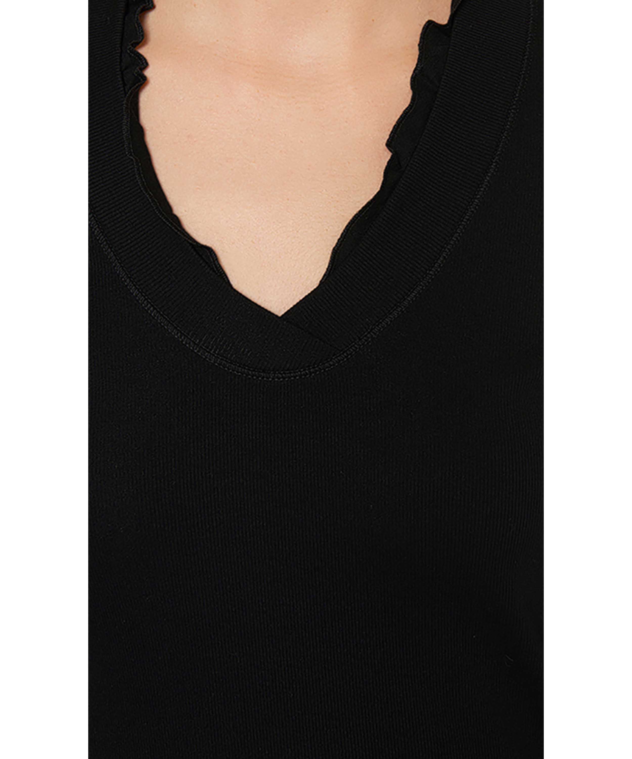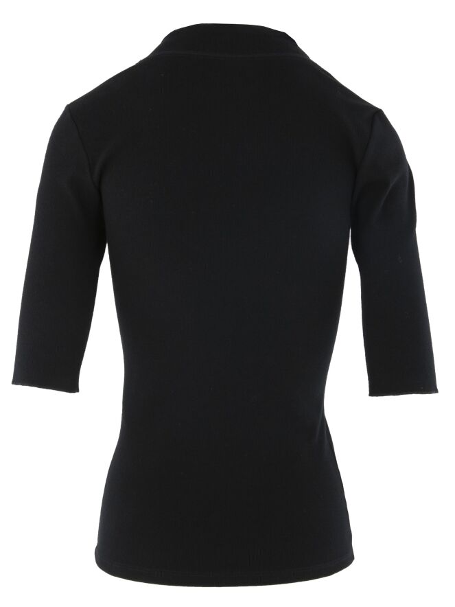 Schwarzes Shirt der Designermode von Marc Cain essentiels. Das Feinrippshirt hat einen V-Ausschnitt mit einem 3 cm breiten, doppellagigen Bündchen. Die kurzen Ärmel haben einen breiten Umschlagsaum. Dieses Oberteil kann bei 30 Grad in der Waschmaschine gewaschen werden.
