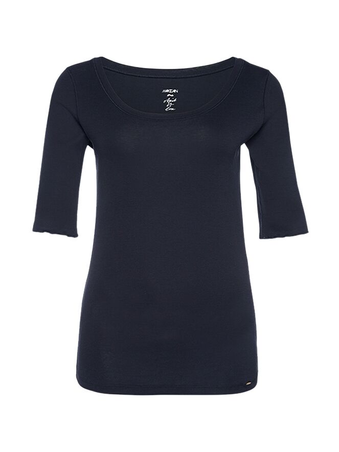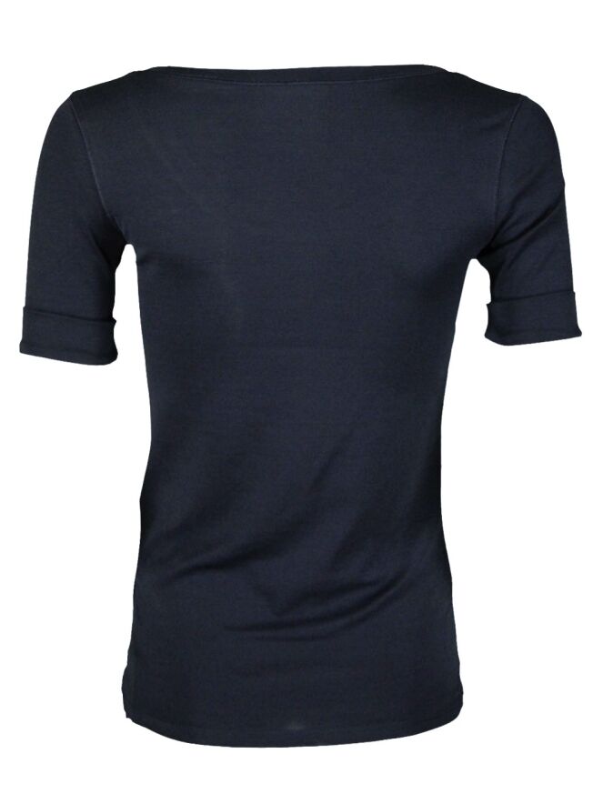 Marineblaues Basic-Shirt der Designermodemarke Marc Cain. Das Shirt hat einen runden Halsausschnitt und kurze Ärmel mit umgeschlagenem Saum. Das Shirt kann auf 30 Grad in der Waschmaschine gewaschen werden.