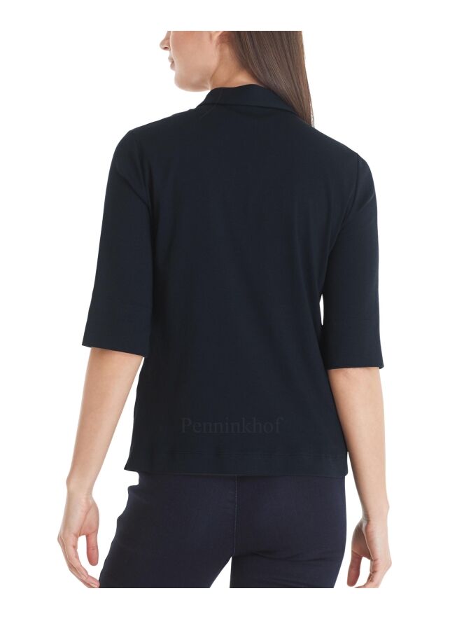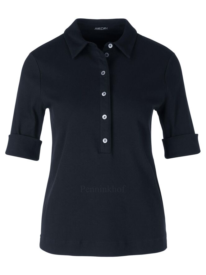 Ein marineblaues Poloshirt der Designermode von Marc Cain. Das Shirt hat kurze Ärmel und kann bei 30 Grad gewaschen werden.