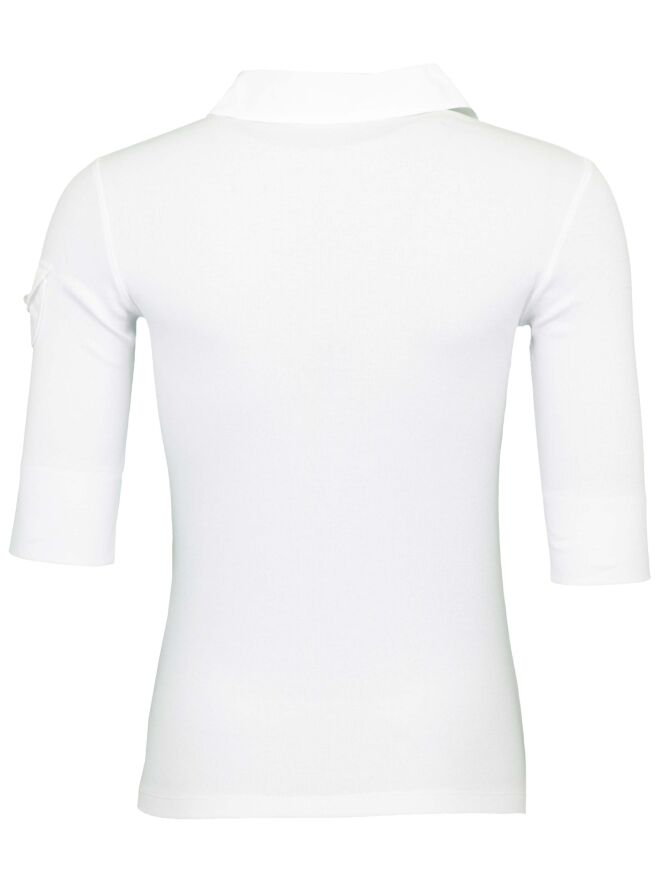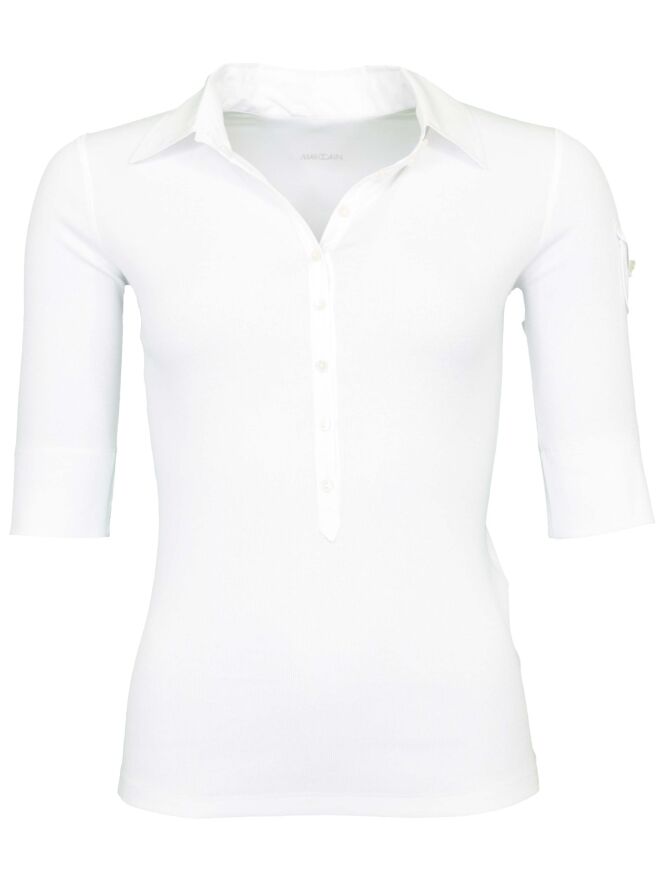 Weißes Poloshirt der Designermode von Marc Cain. Der Stoff des Shirts ist fein gerippt. Auf dem linken Ärmel befindet sich eine kleine Tasche. Der mattglänzende Kragen ist aus 100% Polyester. Dieses Poloshirt kann auf 30 Grad in der Waschmaschine gewaschen werden.