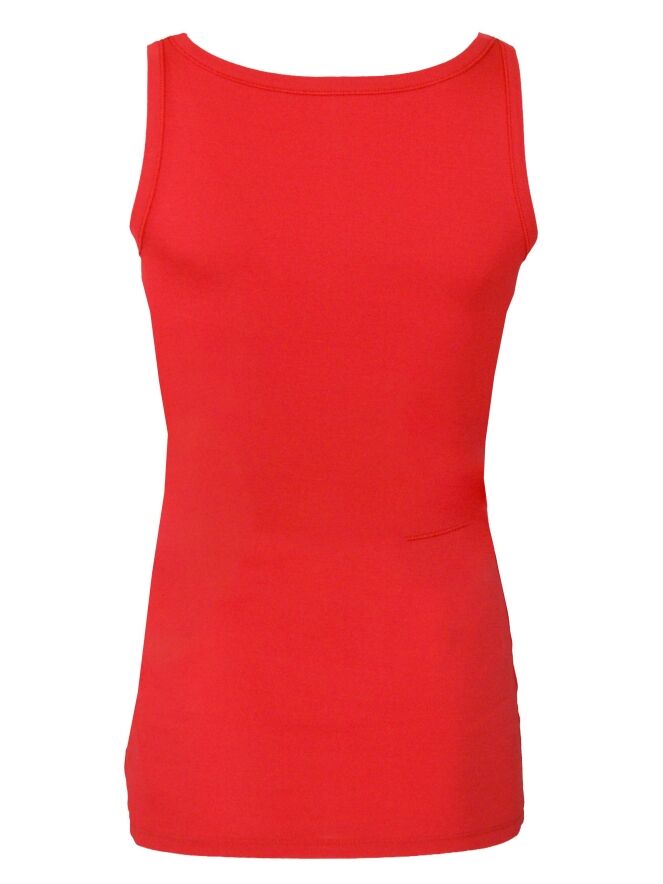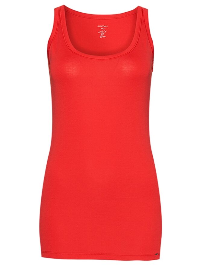 Rotes Basic-Top der Designermodemarke Marc Cain essentiels. Das Top hat einen runden Halsausschnitt, 3 cm breite Träger und kann auf 30 Grad in der Waschmaschine gewaschen werden.