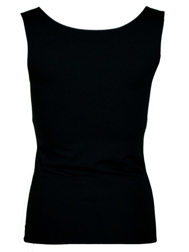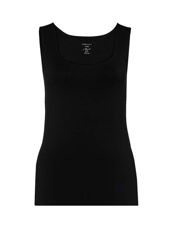 Schwarzes Basic-Top der Designermodemarke Marc Cain essentiels. Das Top ist mit einem doppellagigem Stoff verarbeitet, hat 4 cm breite Träger und kann auf 30 Grad in der Waschmaschine gewaschen werden.