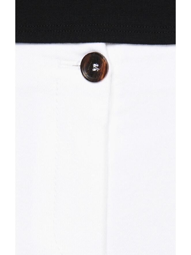 Weiße Basic-Stoffhose mit leicht konischem Beinverlauf der Designermode von Marc Cain aus der Basiskollektion. Die Hose wird mit einem verdeckten Reißverschluss und einem Knopf geschlossen. Die Stoffhose kann auf 30 Grad in der Waschmaschine gewaschen werden.