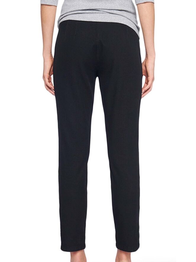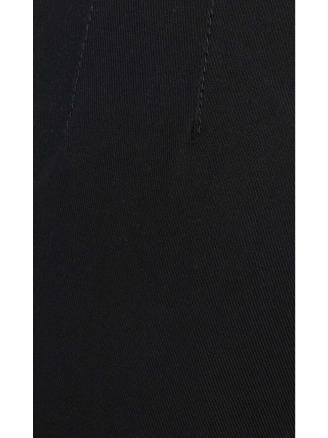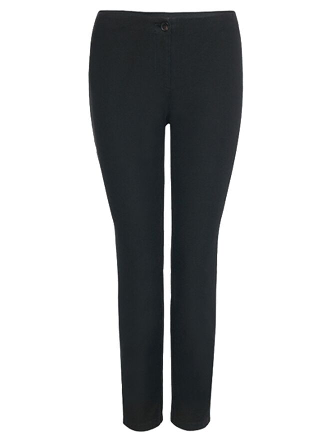 Basic-Stoffhose mit leicht konischem Beinverlauf der Designermode von Marc Cain in der Farbe Schwarz. Die Hose wird mit einem verdeckten Reißverschluss und einem Knopf geschlossen. Die Stoffhose kann auf 30 Grad in der Waschmaschine gewaschen werden.
