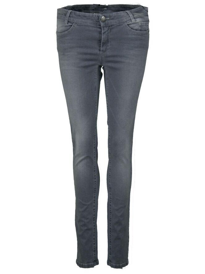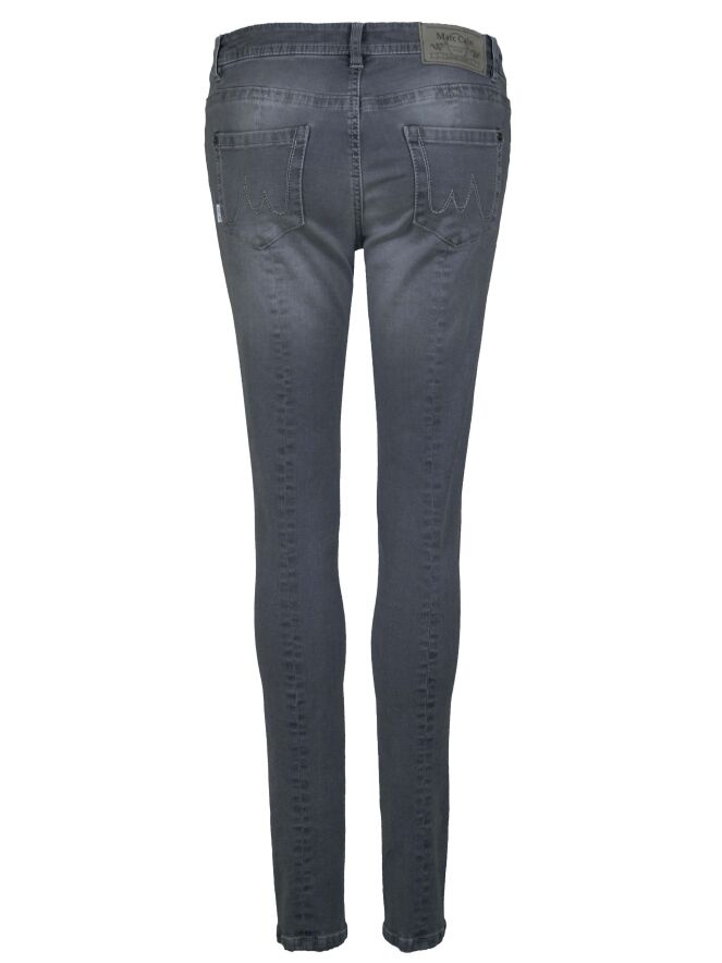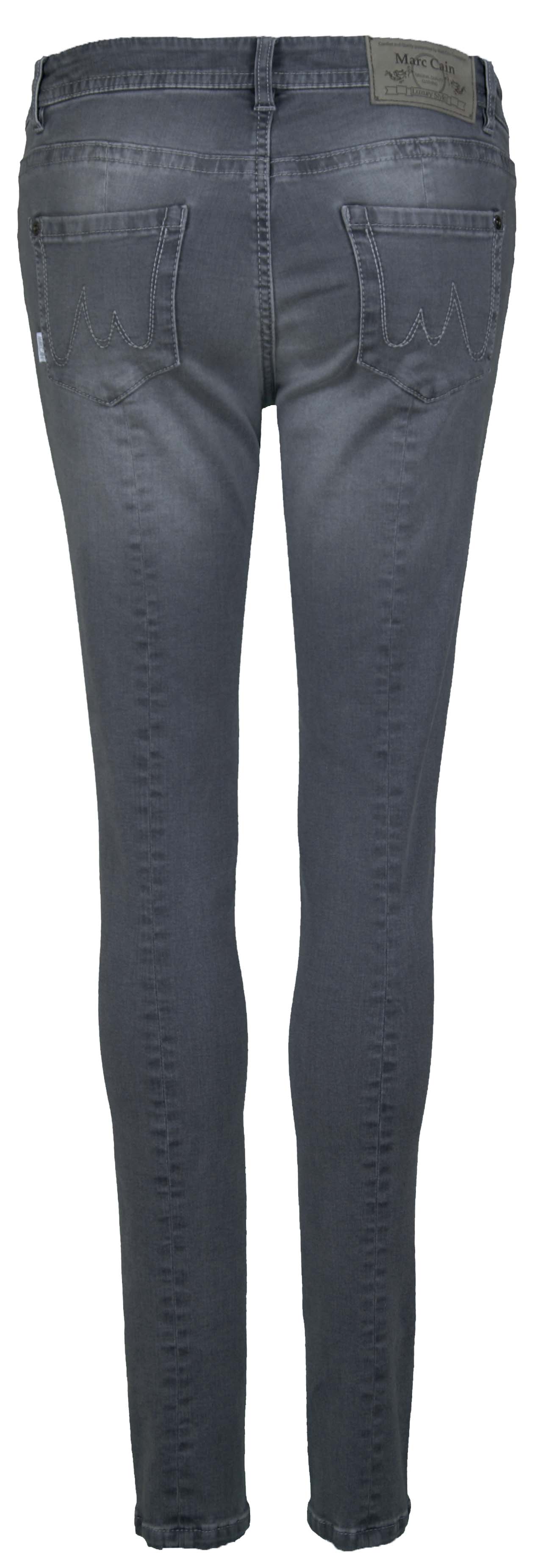 Hellgraue Jeans in 5-Pocket-Modell und schmalem Beinverlauf der Designermodemarke Marc Cain. Die Jeans kann auf 30 Grad in der Waschmaschine gewaschen werden.