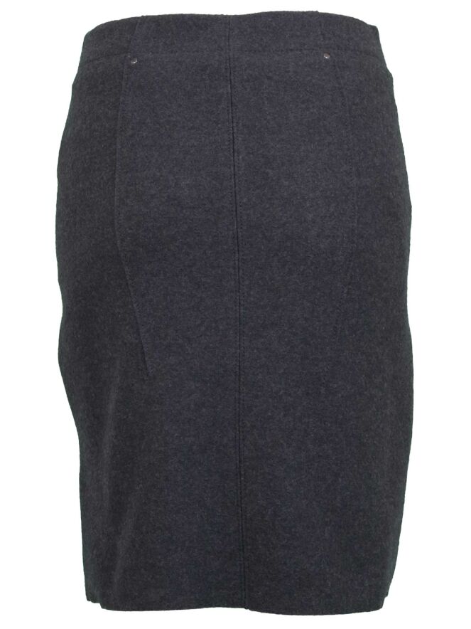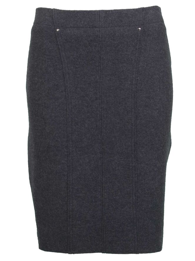 Anthrazitgrauer Rock der Designermode von Marc Cain. Der knielange Rock hat einen 4 cm breiten Gummizug in der Taille. Dieser gefütterte Rock darf nicht gewaschen werden.