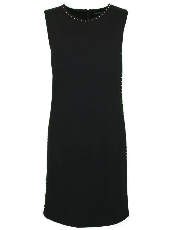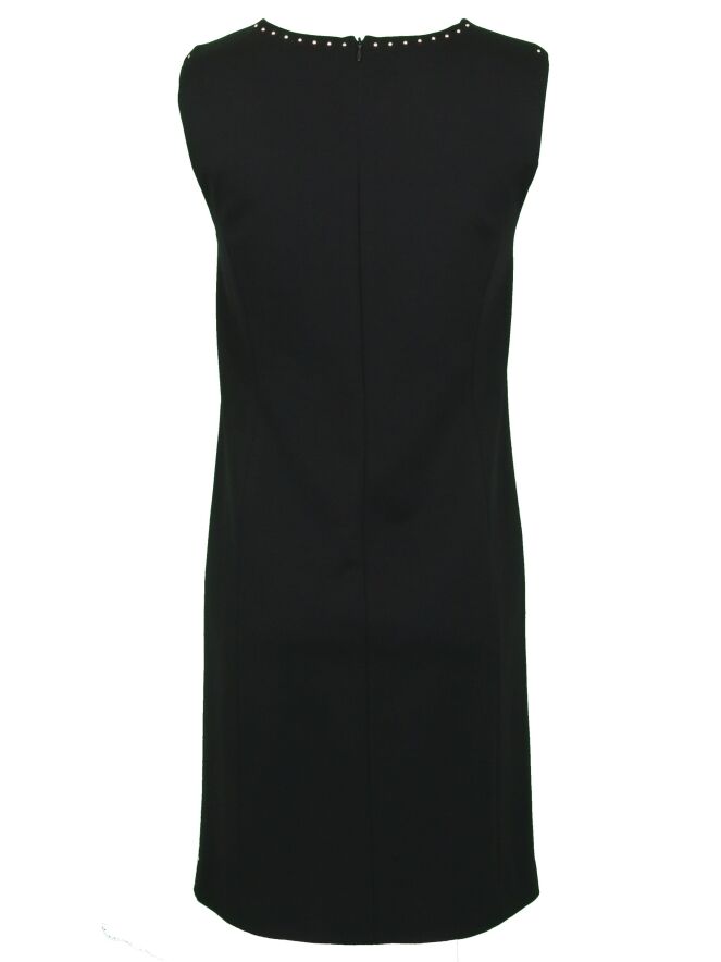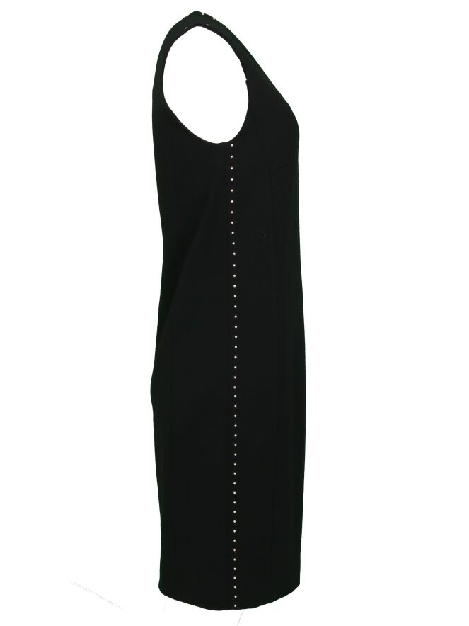 Schwarzes, ärmelloses Kleid der Designermode von Marc Cain. Entlang der Kante des Rundhalsausschnitts und der Seitennähte verzieren dekorative, messingfarbige Nieten das Kleid. Dieses gefütterte Kleid darf von Hand gewaschen werden.
