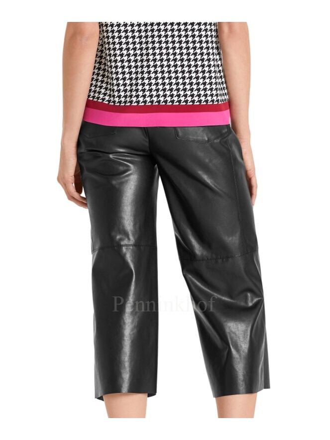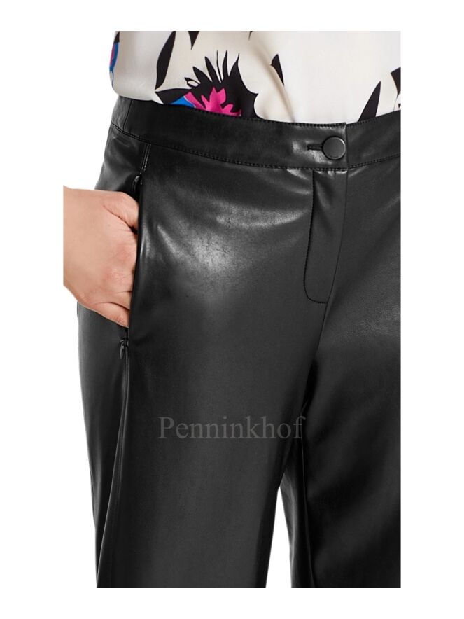 Eine schwarze Kunstlederhose der Designermode von Marc Cain. Die Rohre sind gerade geschnitten. Die Seitentaschen haben einen Reißverschluss. Am Knie befindet sich eine horizontale Steppnaht. Diese Hose kann bei 30 Grad gewaschen werden.