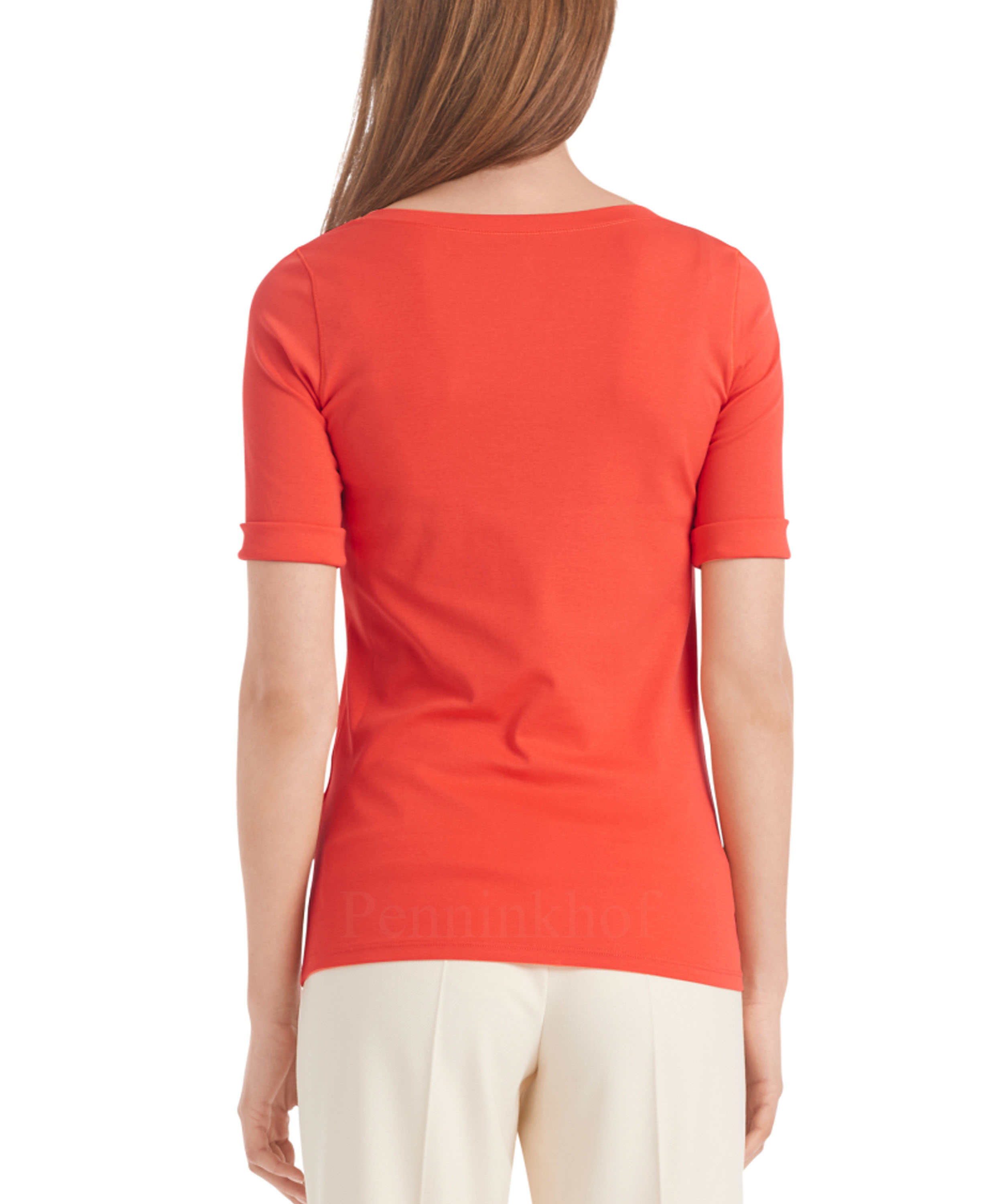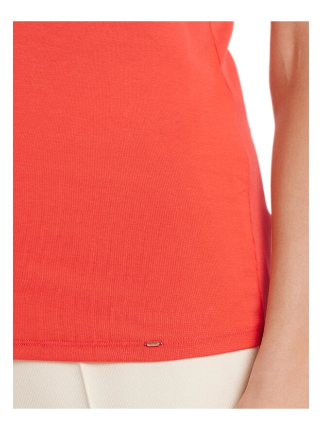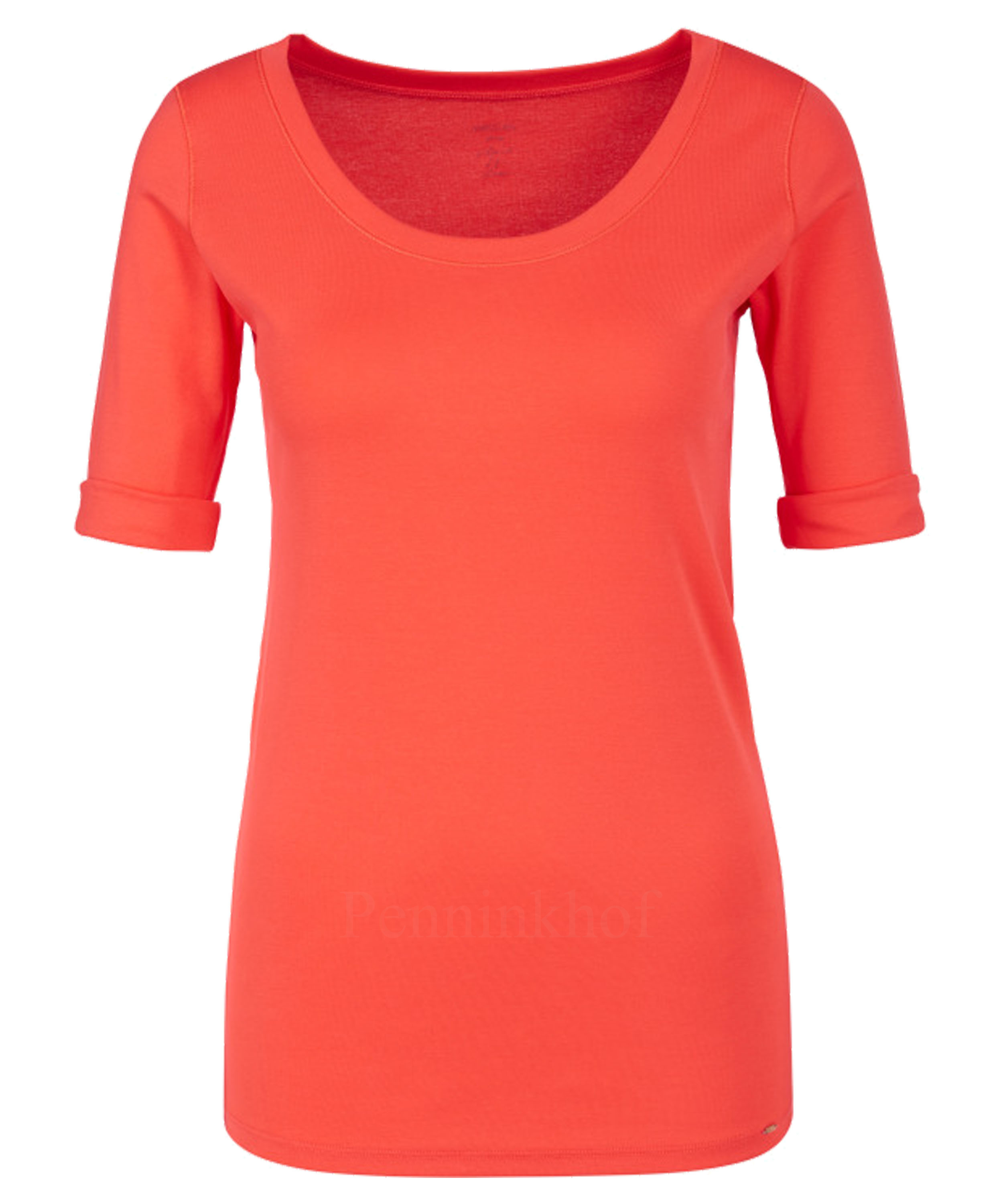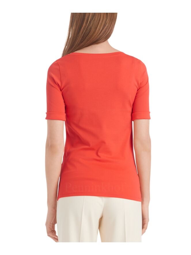 Korallenrotes Shirt der Designermode von Marc Cain. Die kurzen Ärmel sind mit einem Umschlagsaum versehen. Das Oberteil kommt mit einem runden Ausschnitt. Dieses Shirt kann bei 30 Grad gewaschen werden.