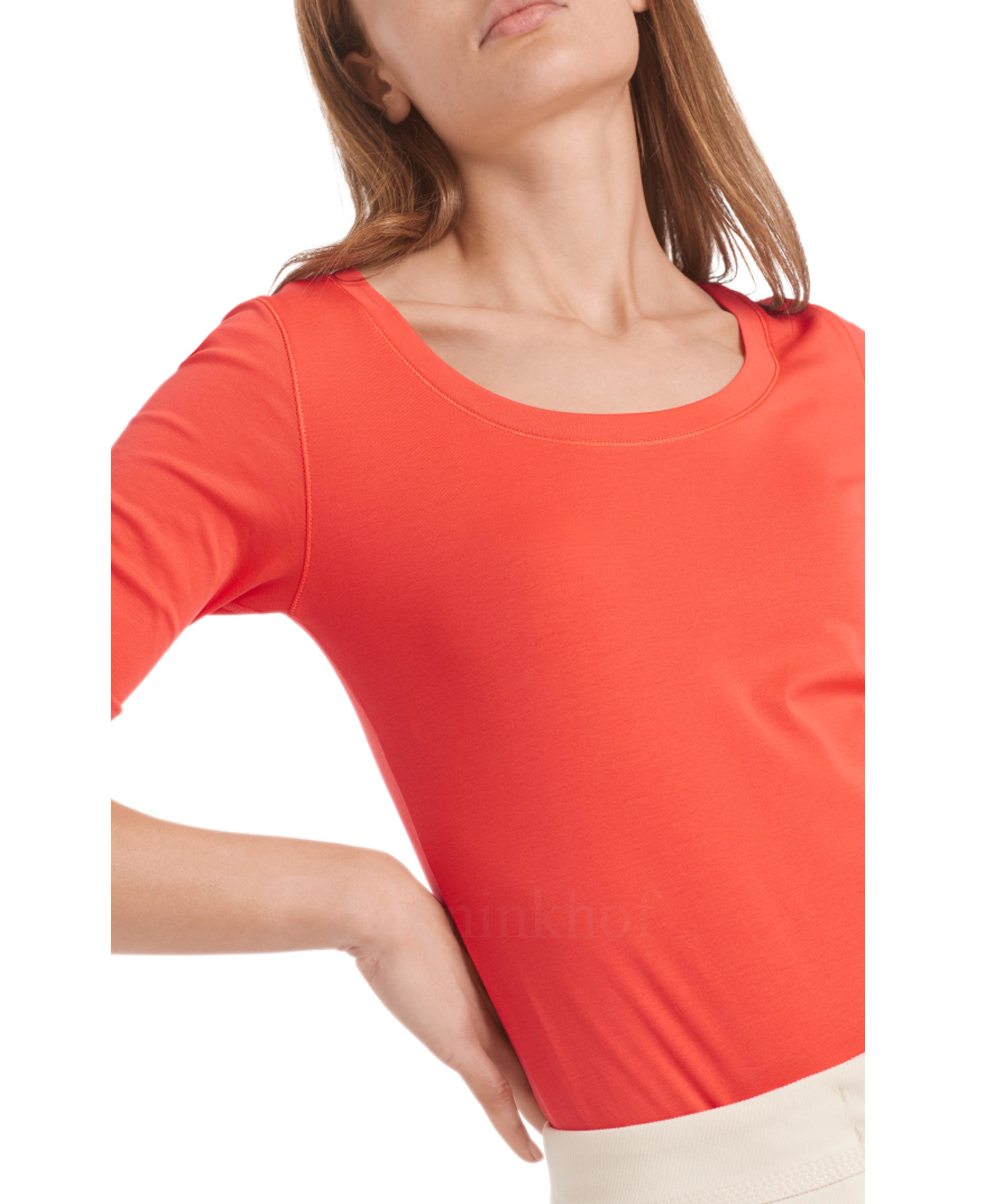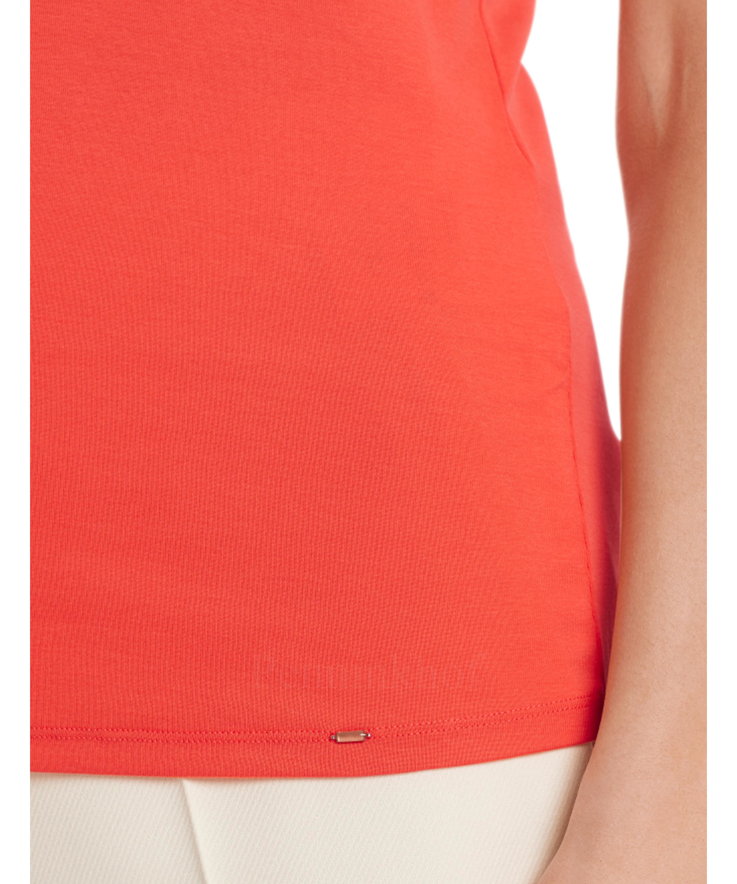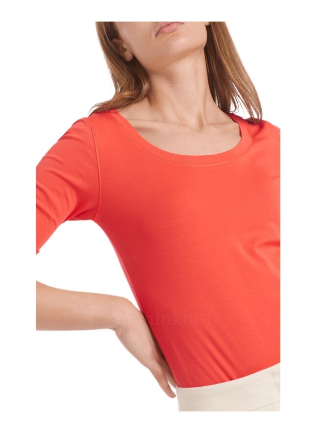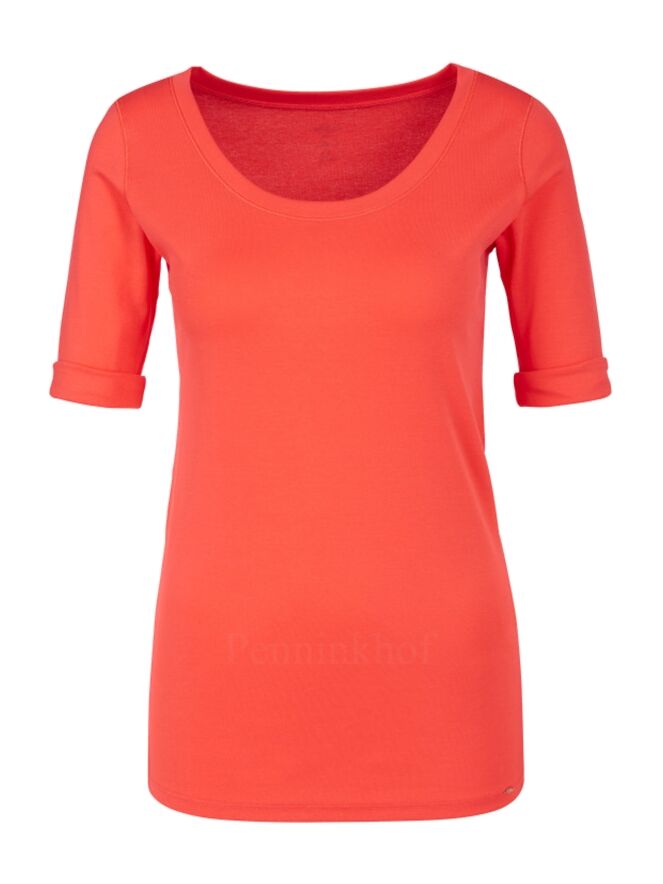 Korallenrotes Shirt der Designermode von Marc Cain. Die kurzen Ärmel sind mit einem Umschlagsaum versehen. Das Oberteil kommt mit einem runden Ausschnitt. Dieses Shirt kann bei 30 Grad gewaschen werden.
