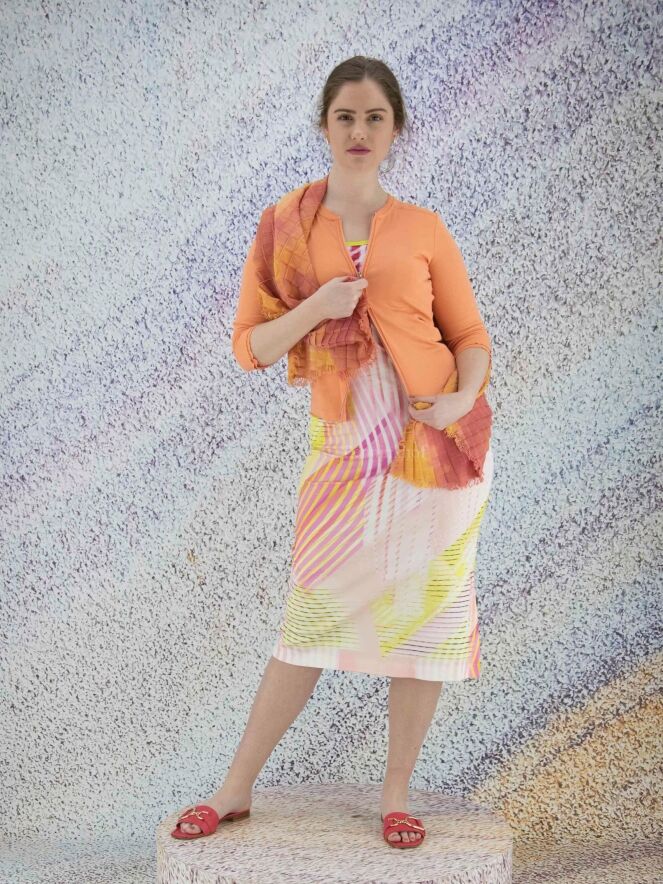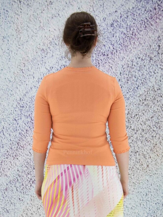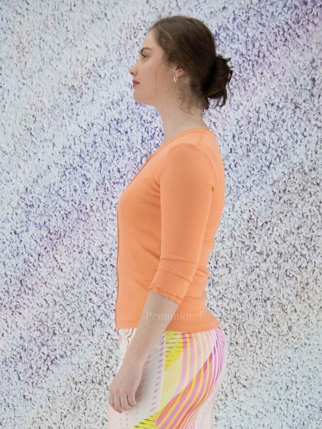 Ein orangefarbener Cardigan der Designermode von Marc Cain. Der Cardigan hat halblange Ärmel und einen Rundhalsausschnitt. Entlang des Halsausschnitts und des Reißverschlusses verläuft ein Rippbündchen. Dieser Cardigan kann bei 30 Grad gewaschen werden.