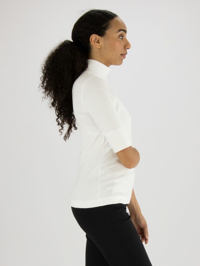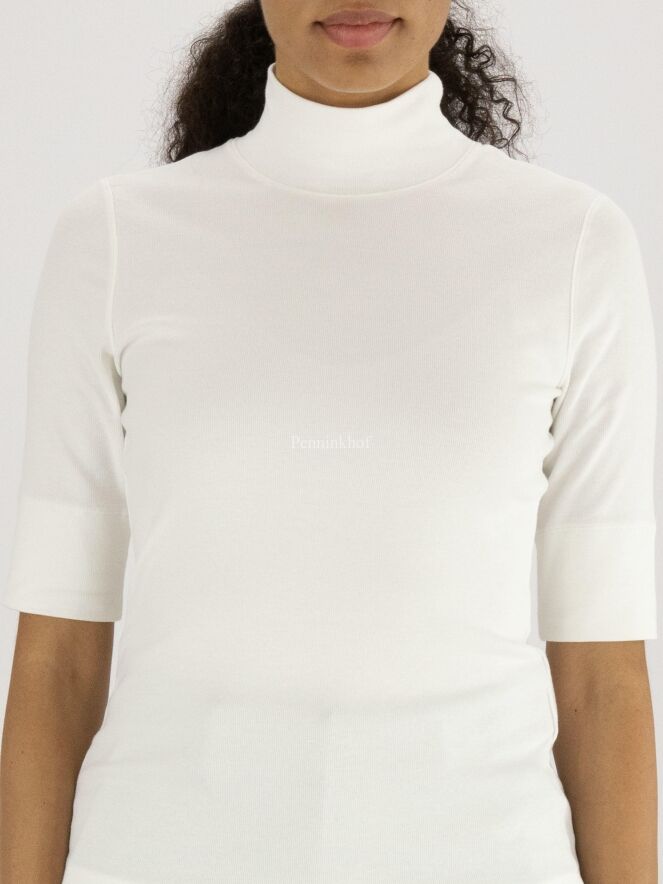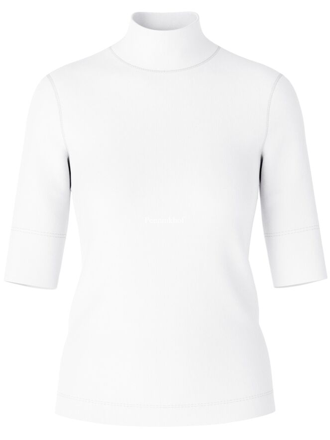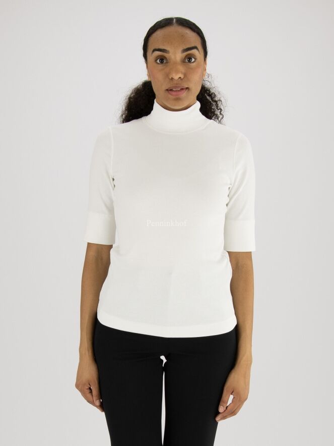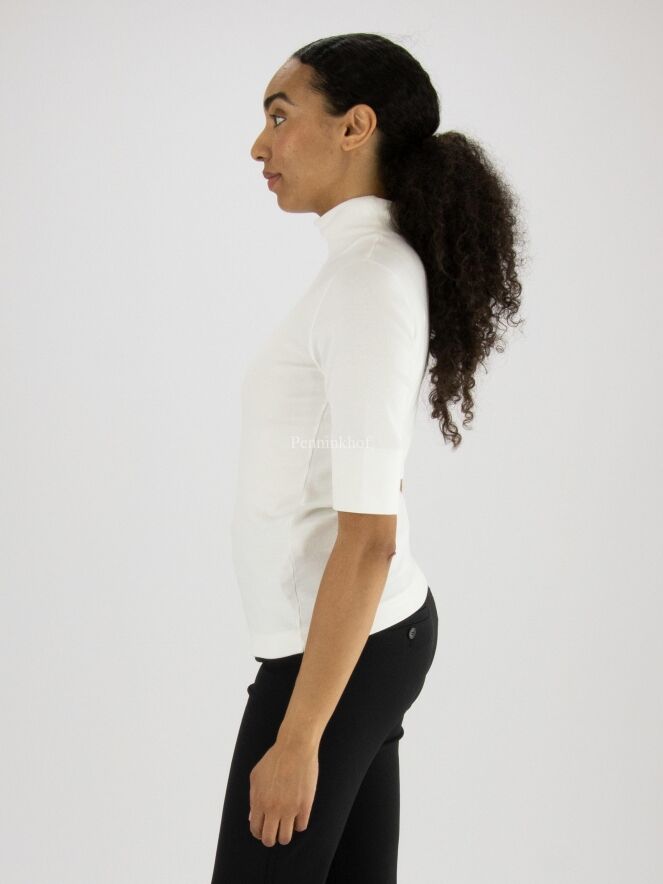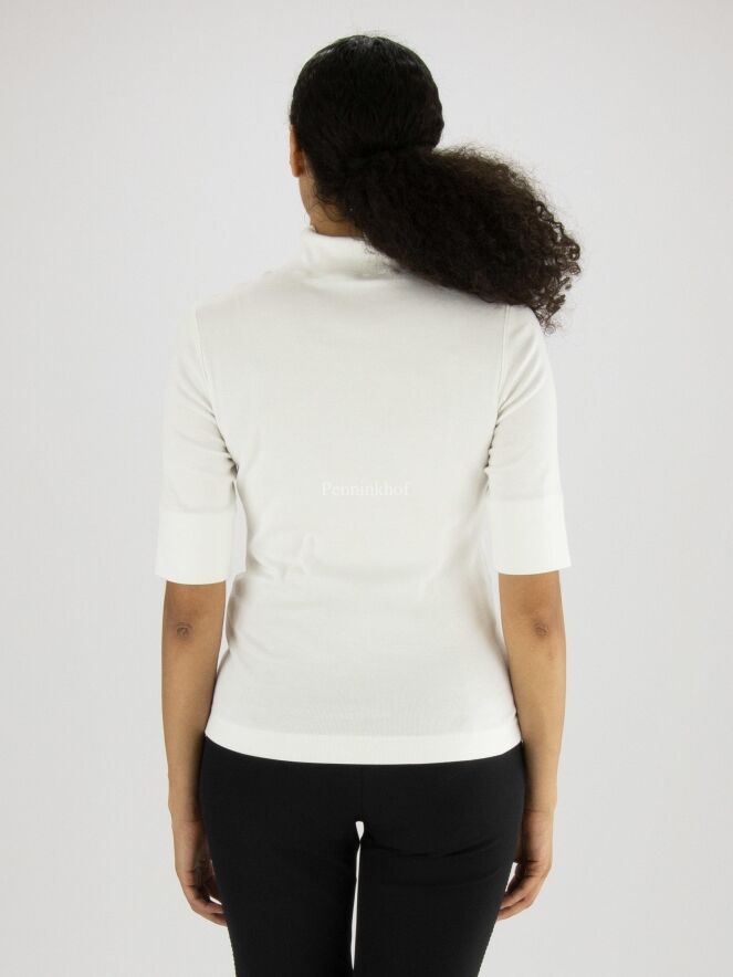 Ein cremeweißes Shirt der Designermode von Marc Cain. Das Shirt hat kurze Ärmel und einen Schildkrötenkragen. Dieses Shirt kann bei 30 Grad gewaschen werden.