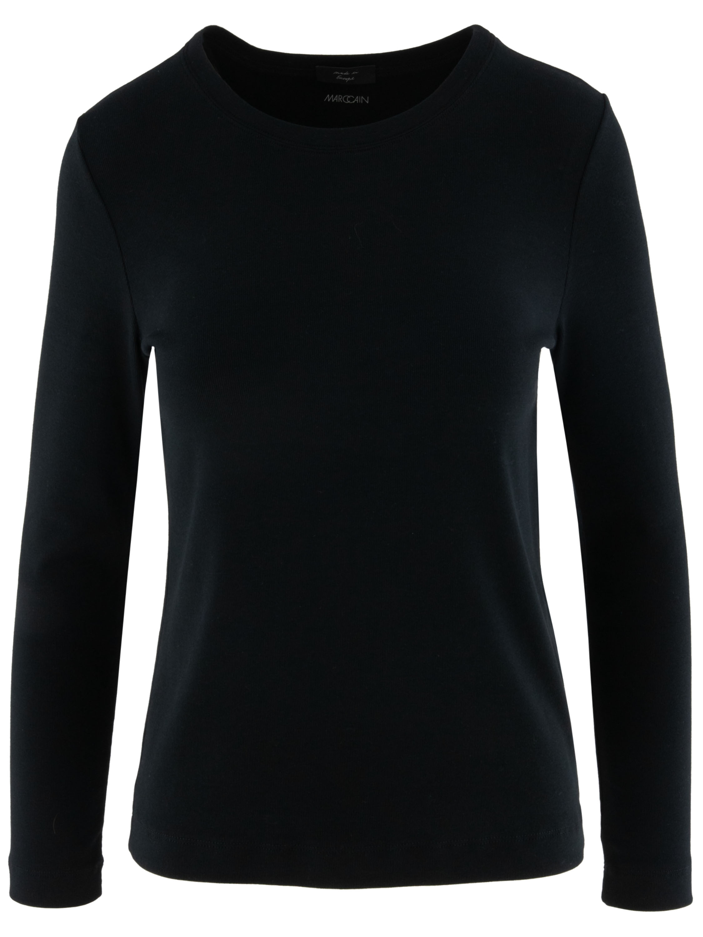 Ein Shirt von Marc Cain aus fein geripptem Stoff in schwarzer Farbe. Das Shirt hat einen Rundhalsausschnitt und lange Ärmel und kann bei 30 Grad gewaschen werden.