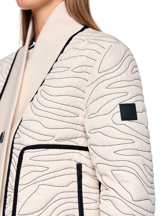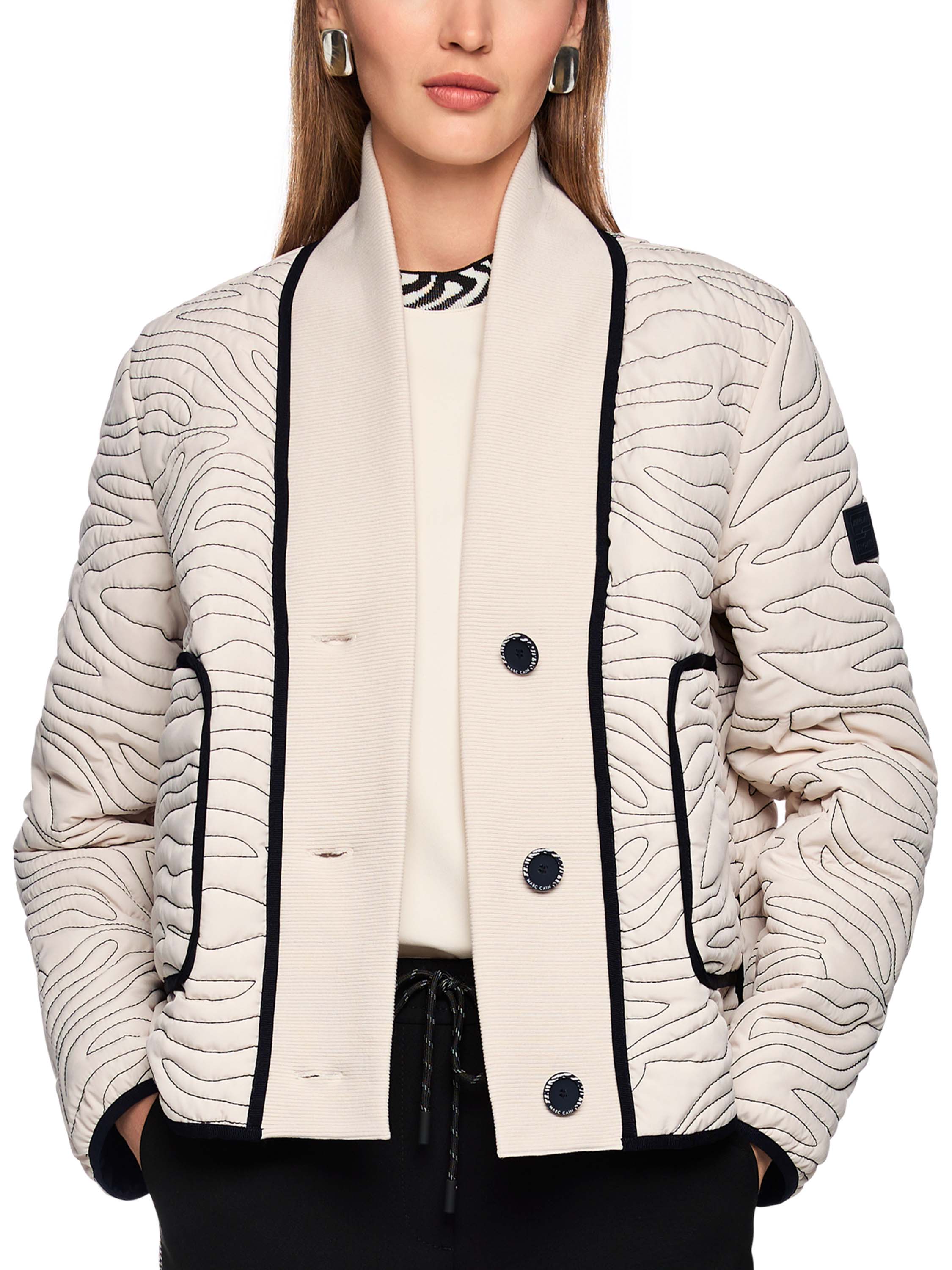 Ein Mantel von Marc Cain in Beige mit dekorativen, wellenförmigen Steppnähten. Vorder- und Rückseite haben schwarze vertikale Biesen, und dieses Detail findet sich auch an den Taschenrändern wieder. Der Kragen, der bis nach unten verläuft, besteht aus einem fein gerippten Strickbund. Der Mantel hat eine Knopfleiste mit 3 Knöpfen. Dieser Mantel kann bei 30 Grad gewaschen werden.