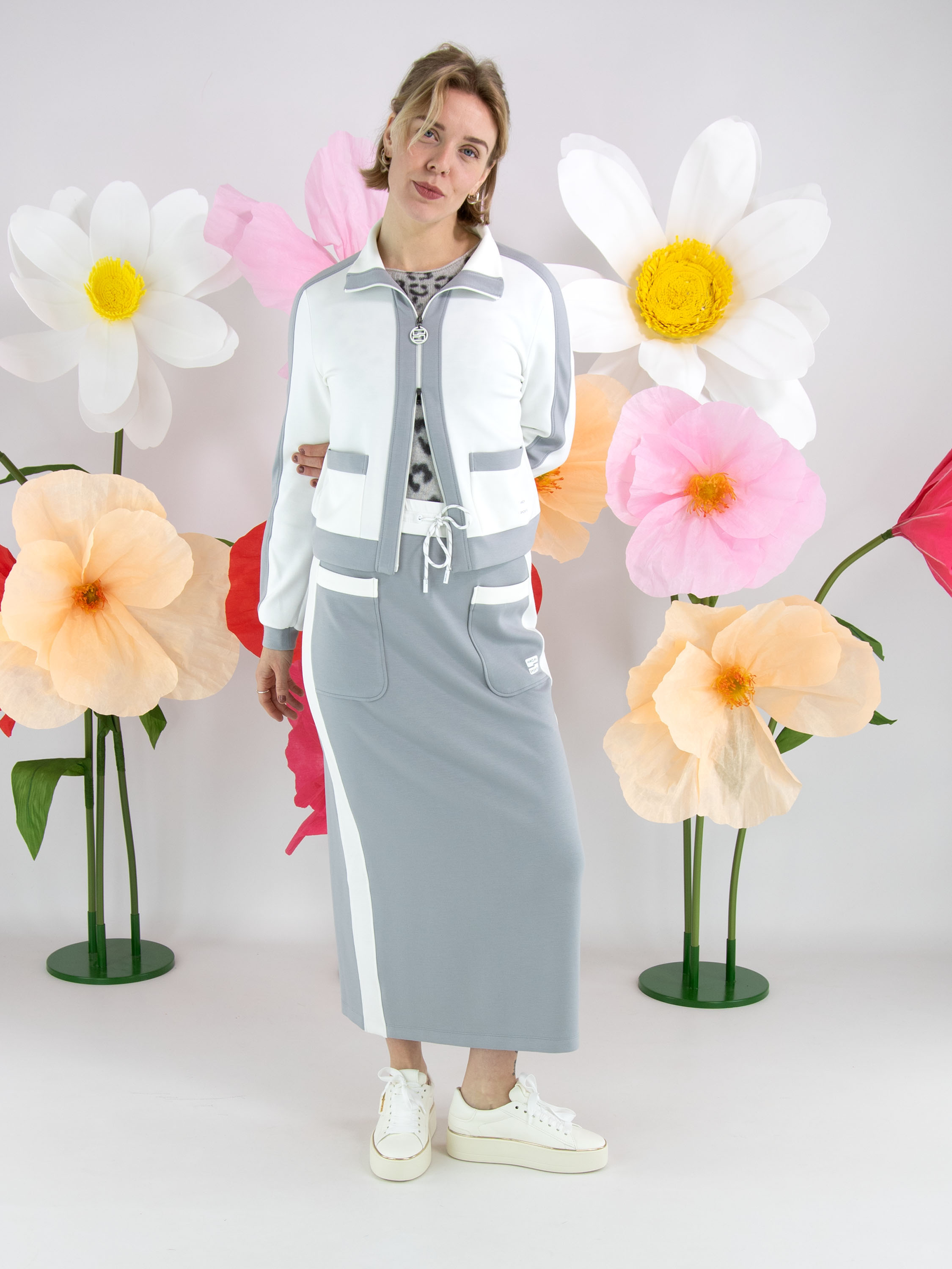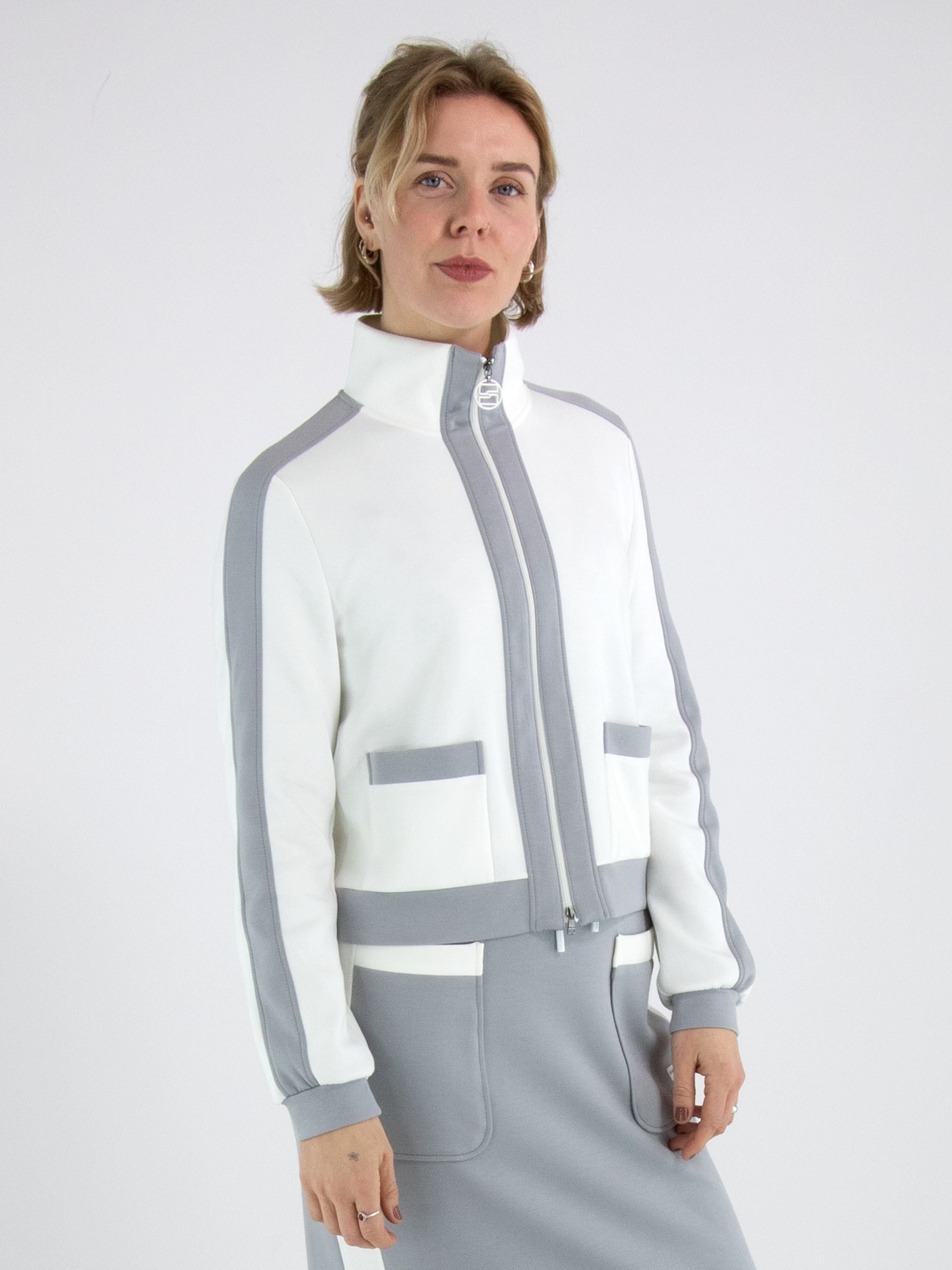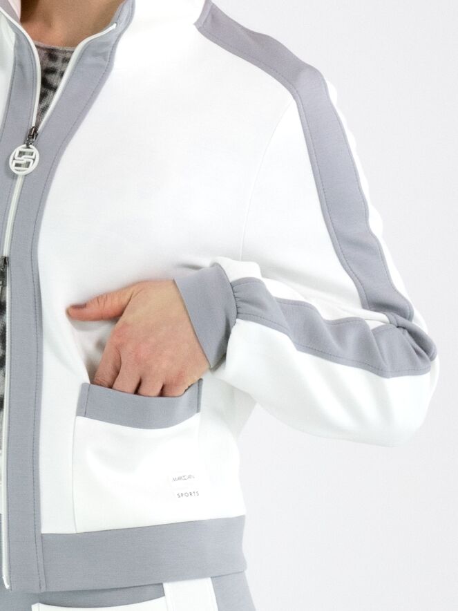 Eine Joggingjacke von Marc Cain in Cremeweiß. Entlang des Reißverschlusses, oben auf den langen Ärmeln und am unteren Saum befinden sich breite Biesen in Hellgrau. Diese Jacke kann bei 30 Grad gewaschen werden.